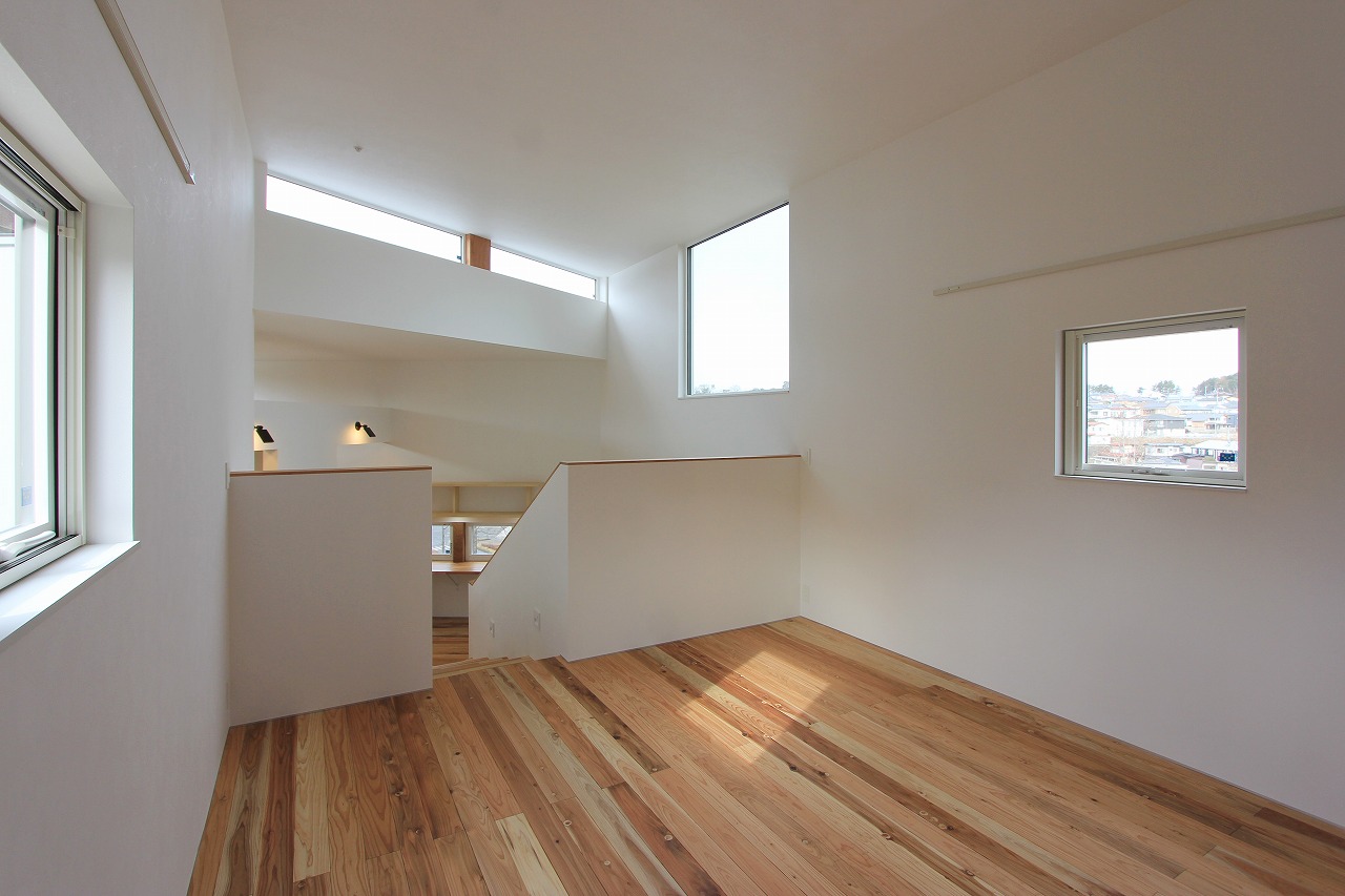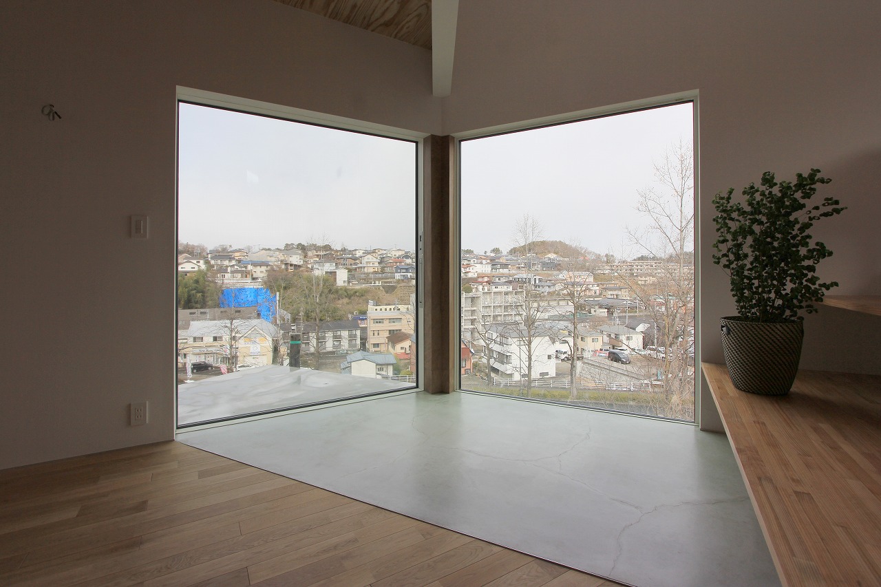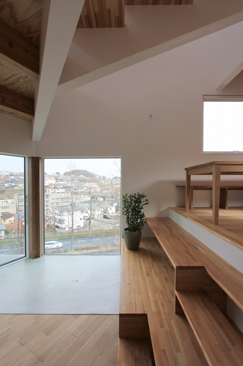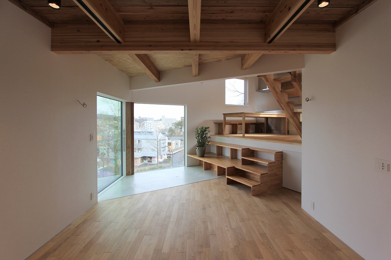 ガレージ部分の中にある玄関部分は旦那さんのコレクションルームも完備。自転車もインテリアとして活用します。リビング部分は天井をスノコにしていることで上部から柔らかい光が注ぎ、北側の借景を活かした窓の配置にしています。少し上がった場所にあるダイニングキッチンとは階段をベンチのように使用する計画としています。さらに少し上がった水廻りやプライベートルームからも眺望が楽しめます。最上階にある子供部屋は間仕切りを設けないことで吹き抜けを介して開放的な空間となっています。