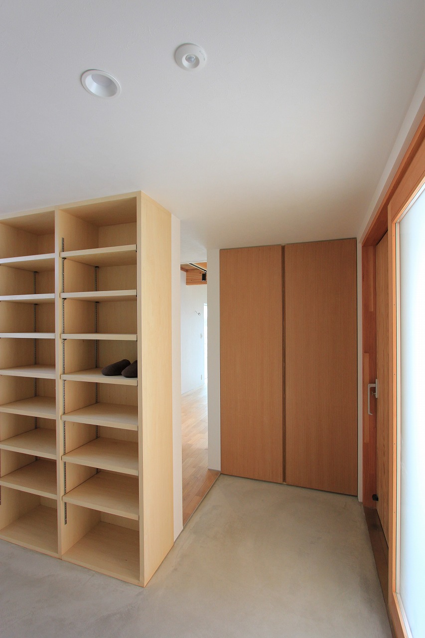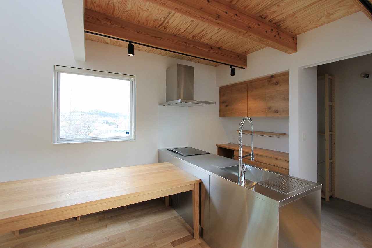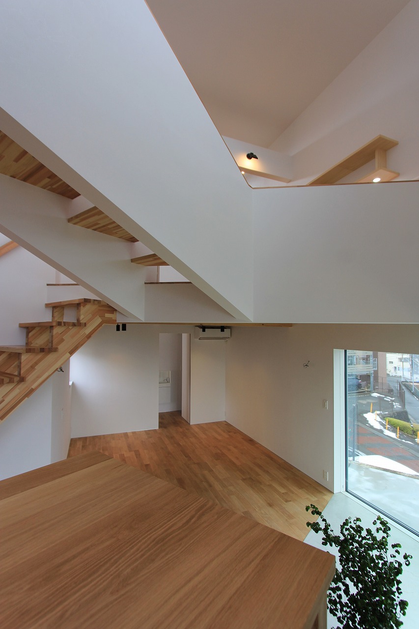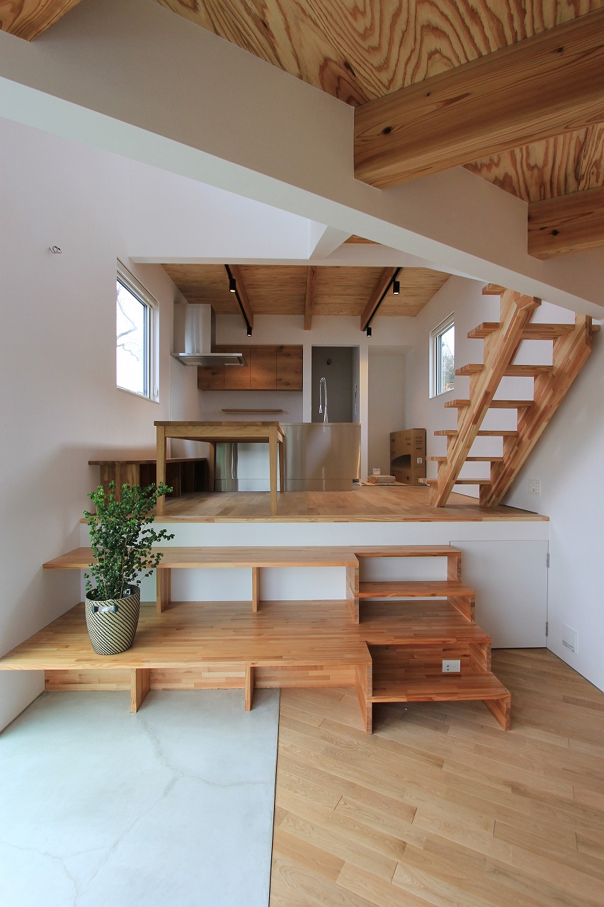 ガレージ部分の中にある玄関部分は旦那さんのコレクションルームも完備。自転車もインテリアとして活用します。リビング部分は天井をスノコにしていることで上部から柔らかい光が注ぎ、北側の借景を活かした窓の配置にしています。少し上がった場所にあるダイニングキッチンとは階段をベンチのように使用する計画としています。さらに少し上がった水廻りやプライベートルームからも眺望が楽しめます。最上階にある子供部屋は間仕切りを設けないことで吹き抜けを介して開放的な空間となっています。
