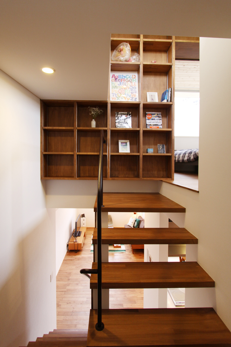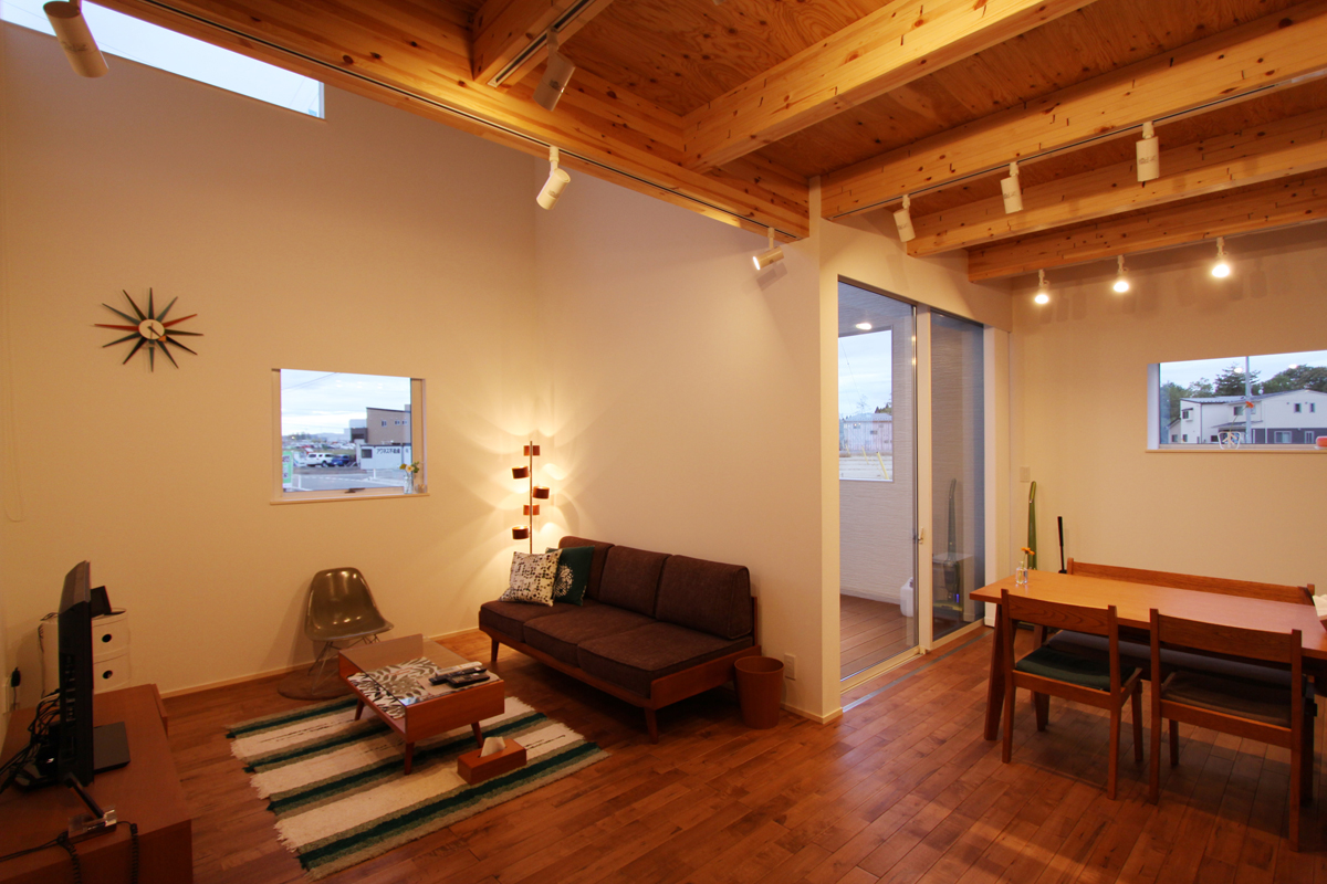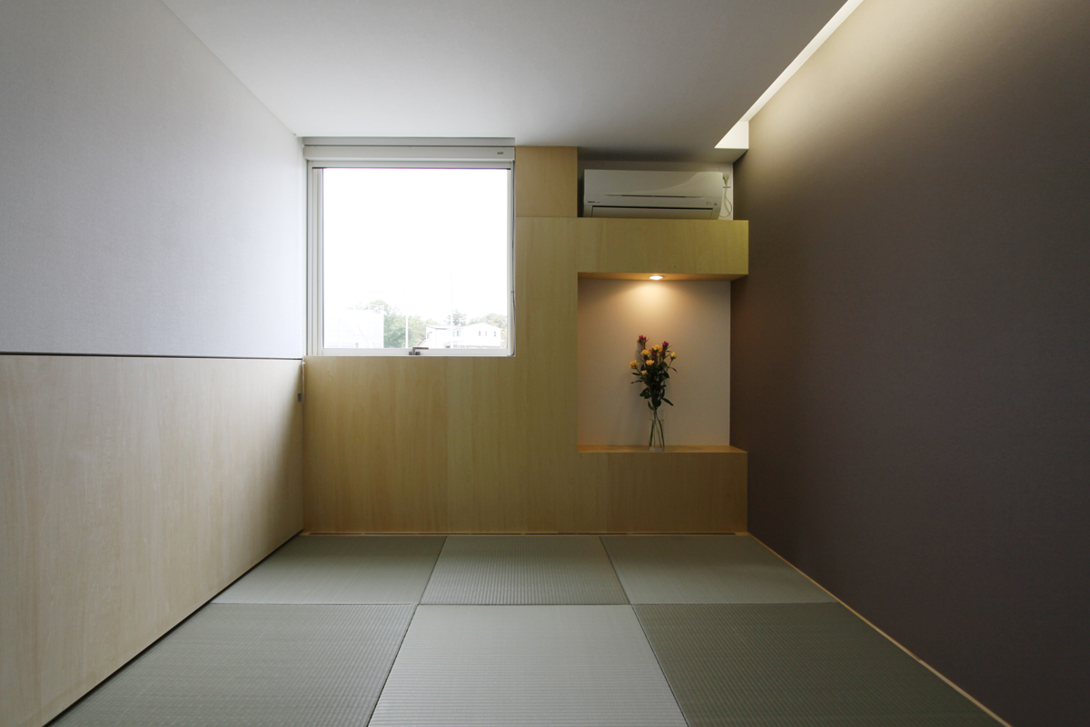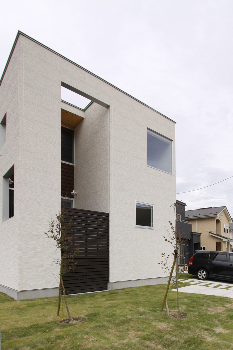 計画地は新興住宅の南東南西の角地に位置している。2方向に開いた開放的な利点を活かしながら、外部からの視線を気にせず快適に暮らせる住まいを目指した。単純な箱ながら凹凸のある開口を持つホワイトのBOXと、開口部が見えない閉じたかたまりに見えるブラウンのBOXがひずんだ敷地形状に沿ってかみ合わされており、それぞれの対角線上に吹きさらしの2つのコートが内在化されている。1つは南西角から視線を遮りながら室内と連続するテラスが一段持ち上げられ、南側の明るい陽光を取り込んでいる。下部は外部収納や室外機置場として利用している。もう1つは、北東角に落ち着いた雰囲気と涼風を呼び込む、外部に閉じながらつながるガーデンコートである。それぞれが異なる床レベルで半階ずつずらしたスキップフロアは2つのコートが交互に現れる空間となり、面積以上の広がりを演出している。積雪による秋田の地域性を考慮し、スキップフロアによる余剰の空間を設備スペースや収納として活用し、メンテナンス性を高めるとともに、景観性も高めている。コンパクトながら多様性のある居住空間を創出している。