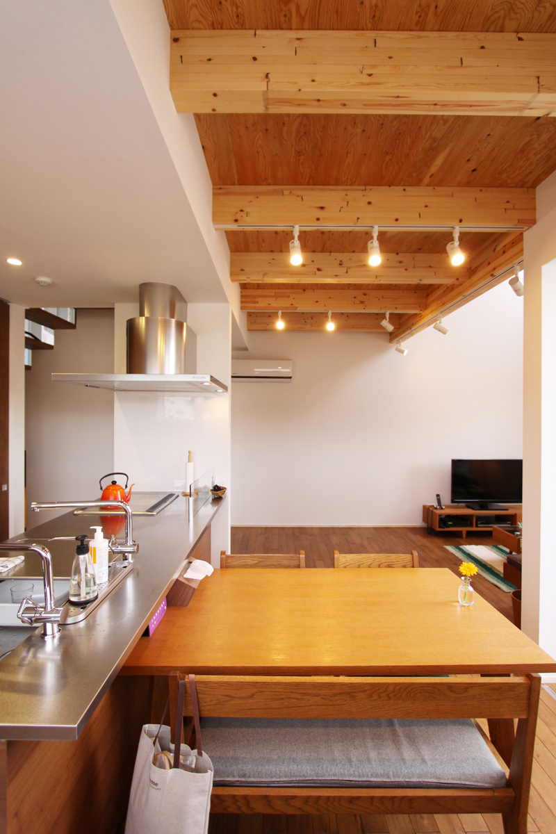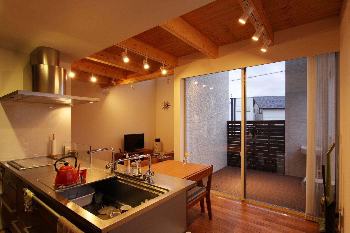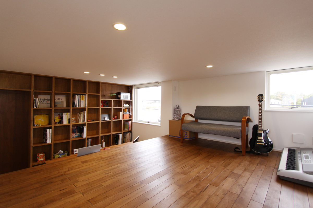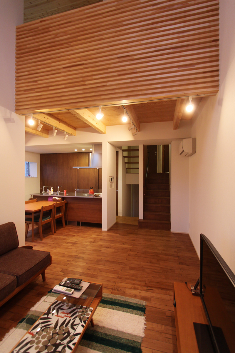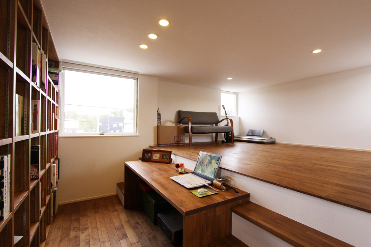 計画地は新興住宅の南東南西の角地に位置している。2方向に開いた開放的な利点を活かしながら、外部からの視線を気にせず快適に暮らせる住まいを目指した。単純な箱ながら凹凸のある開口を持つホワイトのBOXと、開口部が見えない閉じたかたまりに見えるブラウンのBOXがひずんだ敷地形状に沿ってかみ合わされており、それぞれの対角線上に吹きさらしの2つのコートが内在化されている。1つは南西角から視線を遮りながら室内と連続するテラスが一段持ち上げられ、南側の明るい陽光を取り込んでいる。下部は外部収納や室外機置場として利用している。もう1つは、北東角に落ち着いた雰囲気と涼風を呼び込む、外部に閉じながらつながるガーデンコートである。それぞれが異なる床レベルで半階ずつずらしたスキップフロアは2つのコートが交互に現れる空間となり、面積以上の広がりを演出している。積雪による秋田の地域性を考慮し、スキップフロアによる余剰の空間を設備スペースや収納として活用し、メンテナンス性を高めるとともに、景観性も高めている。コンパクトながら多様性のある居住空間を創出している。