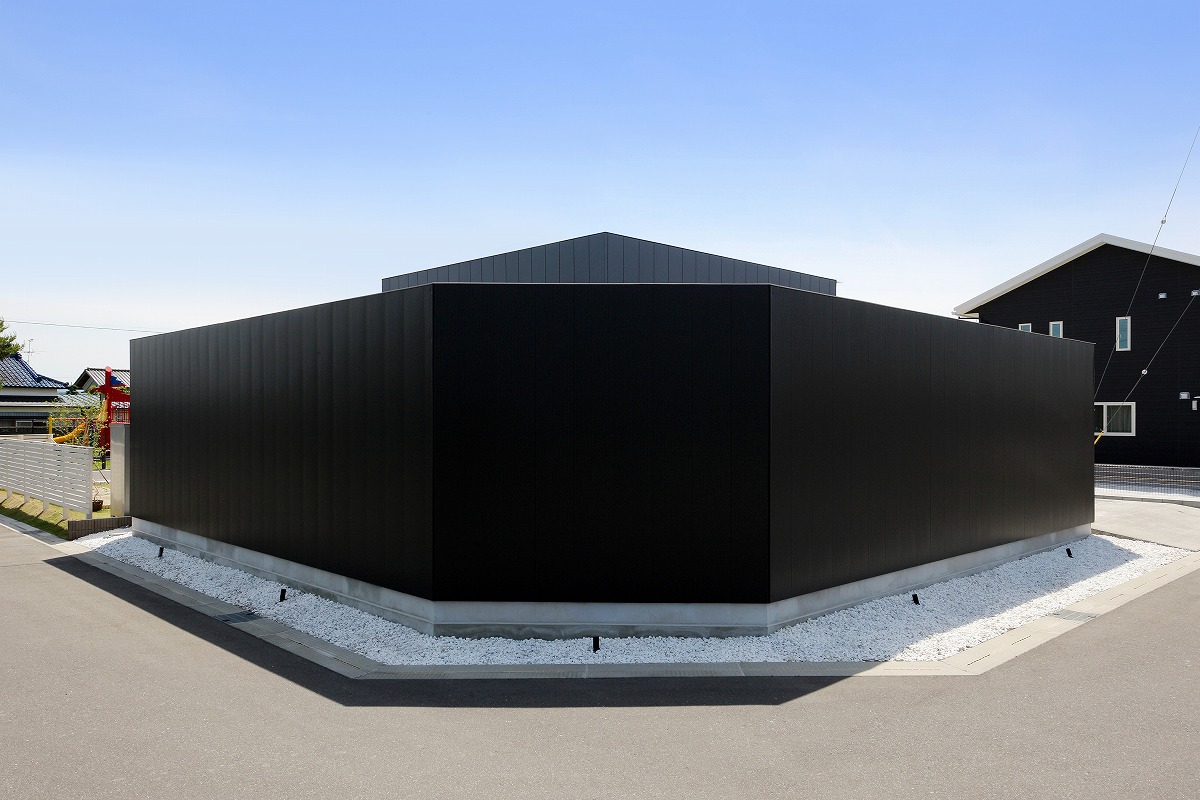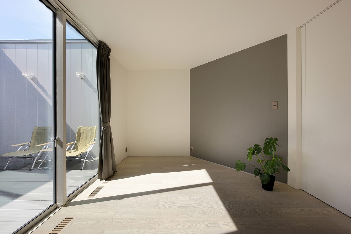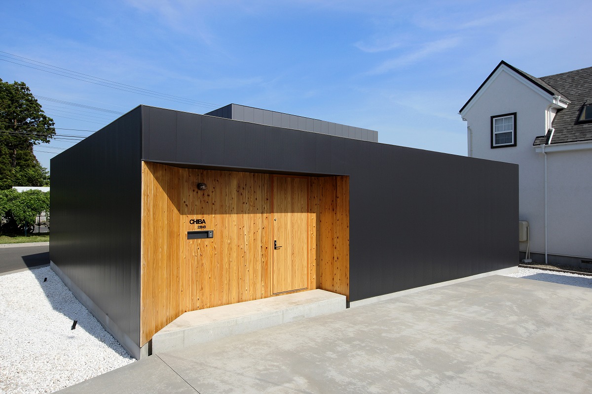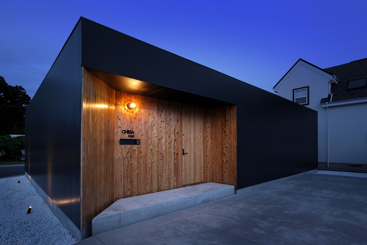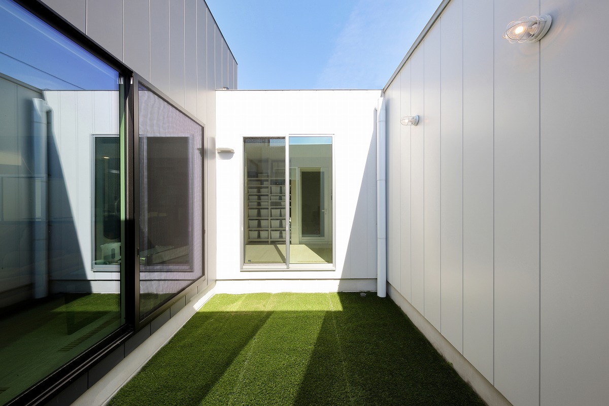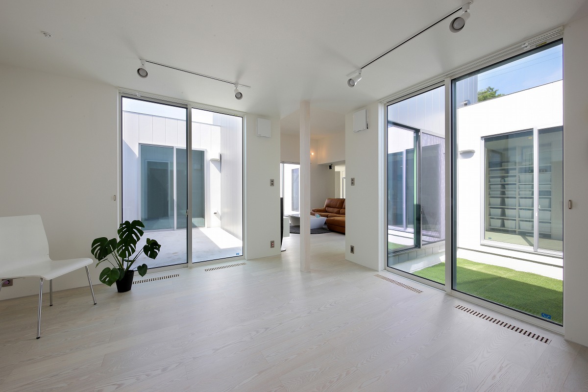 ヒアリングの結果、平屋がご希望だったこと、旦那さんが仕事で留守の期間があることなどによってプランニングを行いました。設計当初南側敷地に西側に寄せて2階建ての住宅が建設予定だったこともあり、敷地東側に配置することに。この行為によって街区入口から駐車スペースを離すことができたので生活する上でも不便なくアプローチできます。また、防犯や防音、プライバシーを確保することを目的に外周部を窓のない壁で囲む計画とし、中庭を分散させることで採光・通風を確保できるプランをご提案しました。