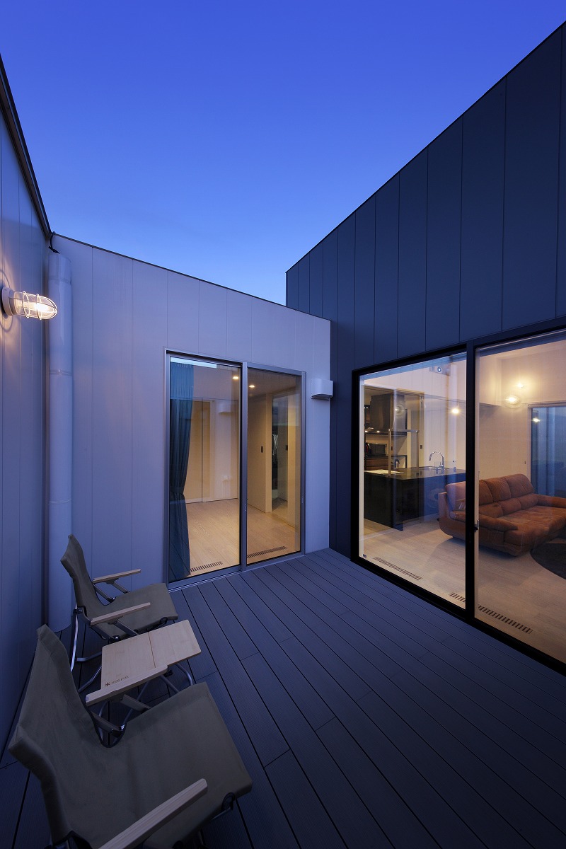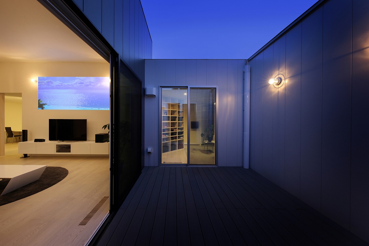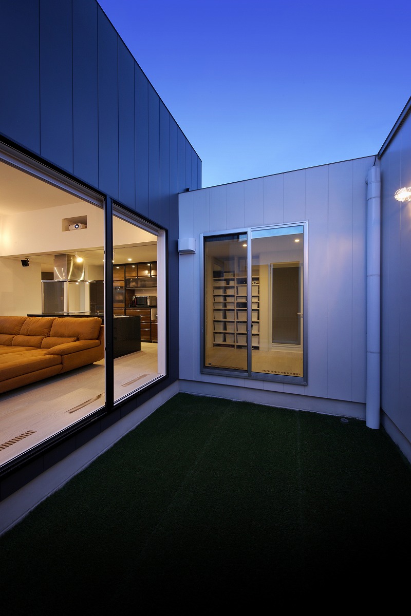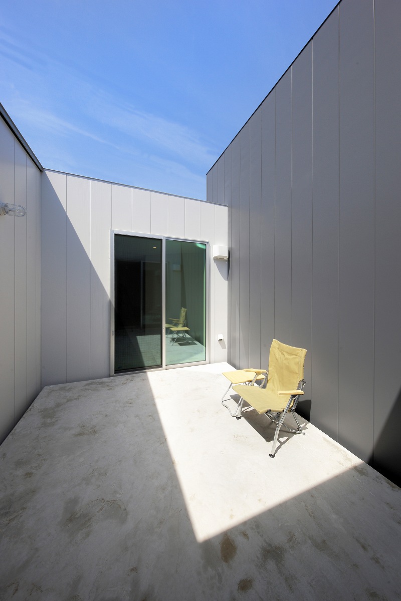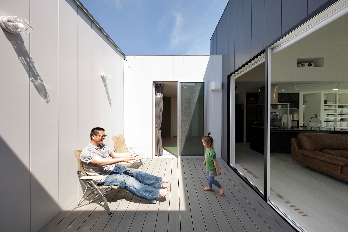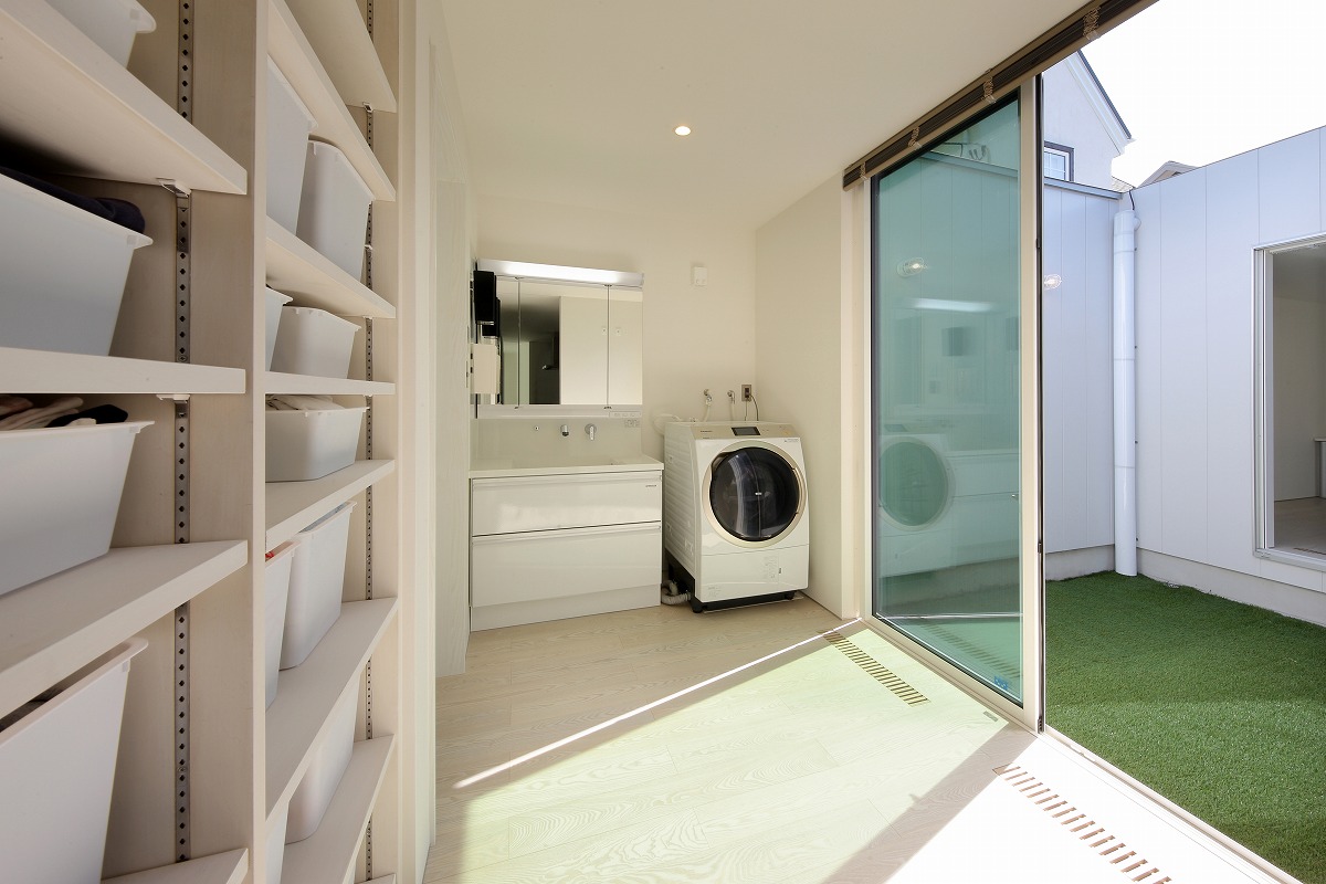 ヒアリングの結果、平屋がご希望だったこと、旦那さんが仕事で留守の期間があることなどによってプランニングを行いました。設計当初南側敷地に西側に寄せて2階建ての住宅が建設予定だったこともあり、敷地東側に配置することに。この行為によって街区入口から駐車スペースを離すことができたので生活する上でも不便なくアプローチできます。また、防犯や防音、プライバシーを確保することを目的に外周部を窓のない壁で囲む計画とし、中庭を分散させることで採光・通風を確保できるプランをご提案しました。