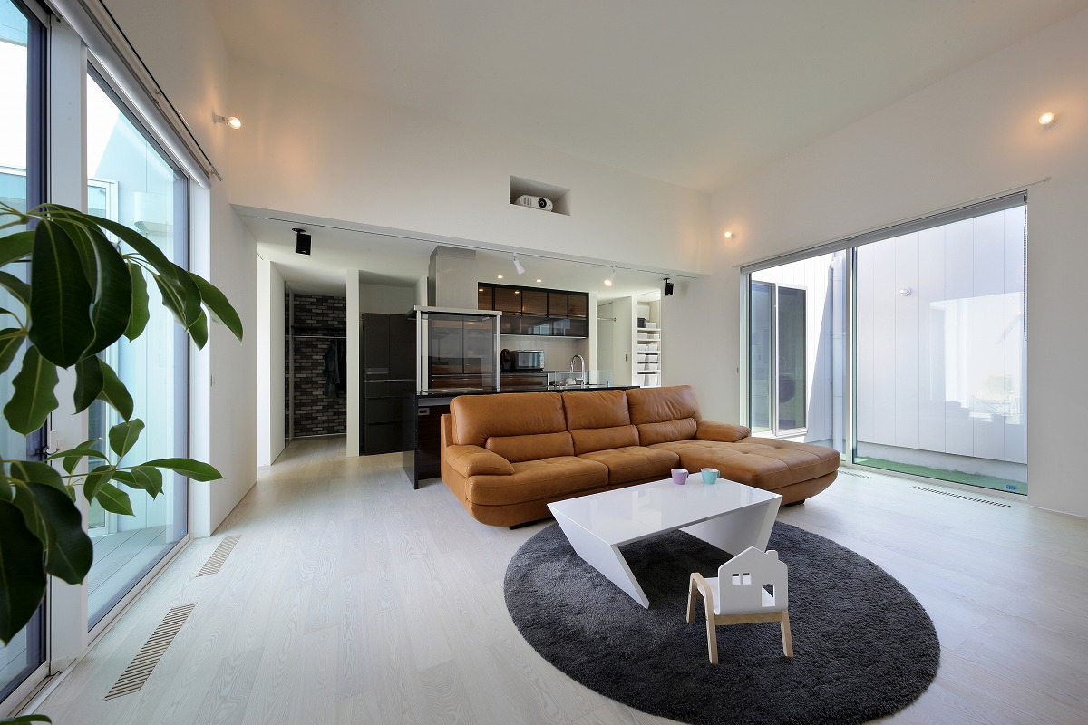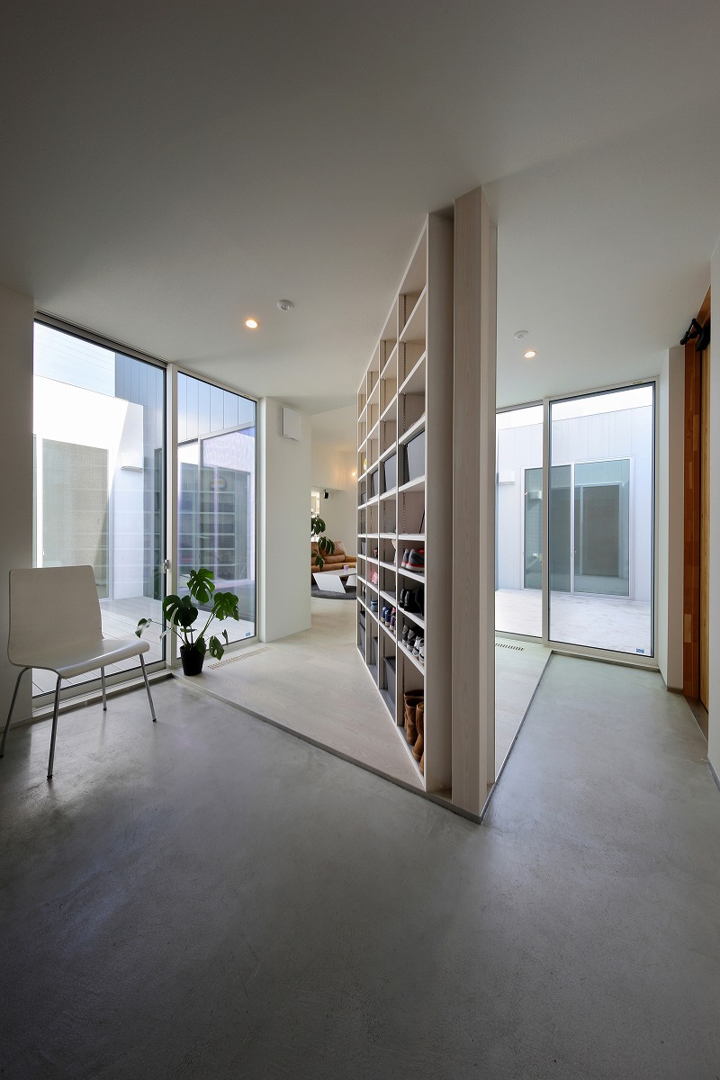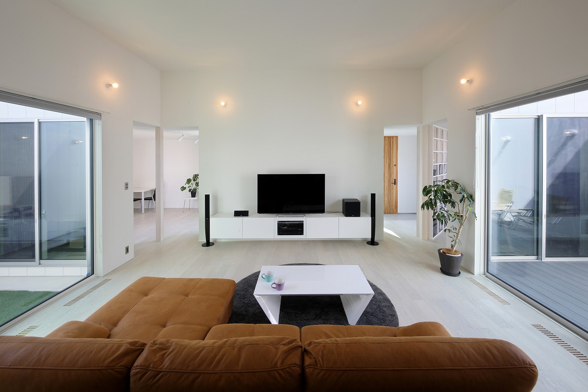 ご家族のライフスタイルとしてリビングで過ごす時間が圧倒的に多かった印象があったので中央に天井高のある開放的なリビングを配置し、そこから諸室へとアプローチできる間取りとしました。家事動線を考慮し、集中クロークを東に配置、水廻りを南側に配置。それぞれ異なる用途をもつ中庭は玄関からの動線、採光、日陰など場所によっても使い方を選べるようにしています。