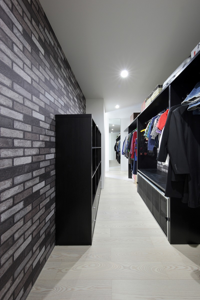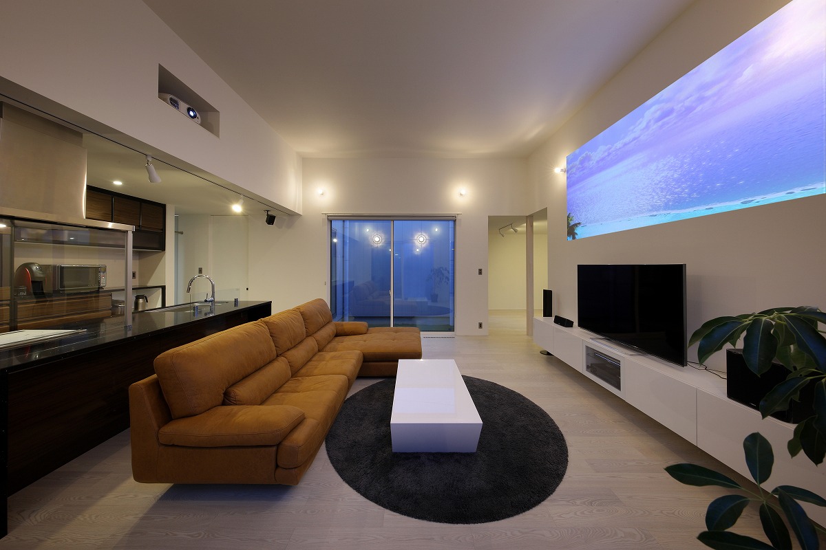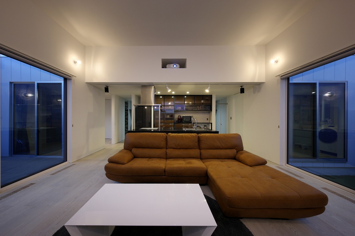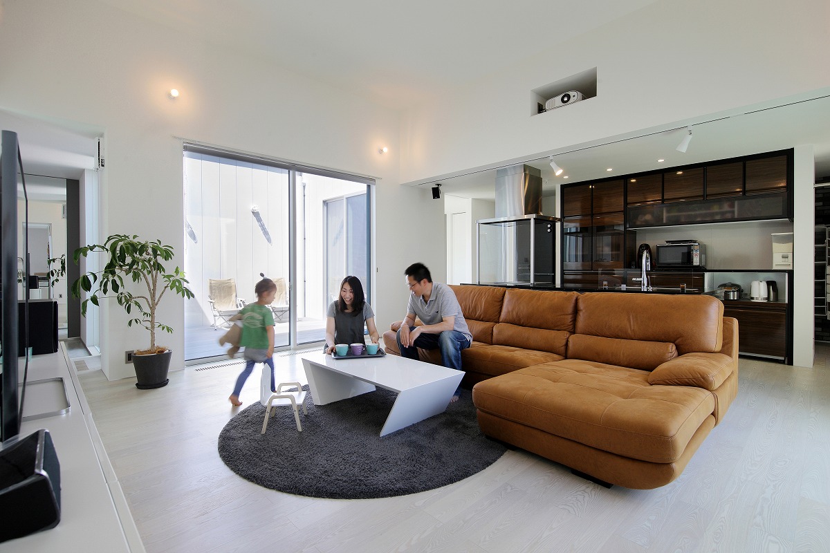 ご家族のライフスタイルとしてリビングで過ごす時間が圧倒的に多かった印象があったので中央に天井高のある開放的なリビングを配置し、そこから諸室へとアプローチできる間取りとしました。家事動線を考慮し、集中クロークを東に配置、水廻りを南側に配置。それぞれ異なる用途をもつ中庭は玄関からの動線、採光、日陰など場所によっても使い方を選べるようにしています。