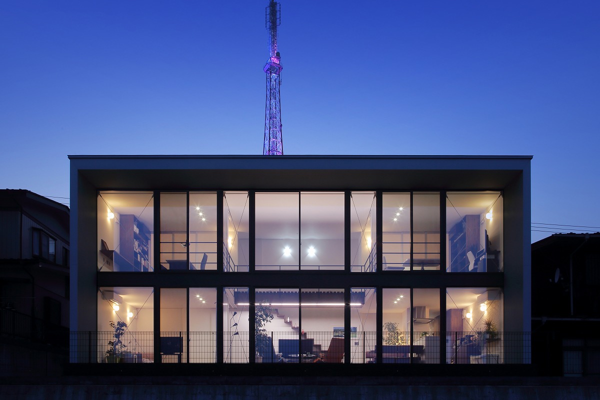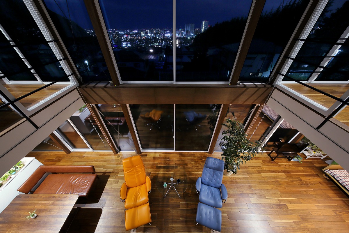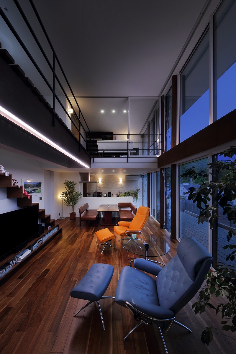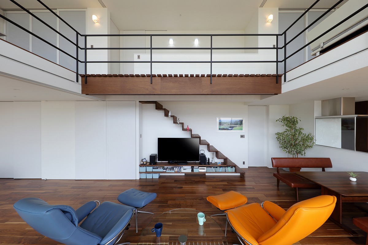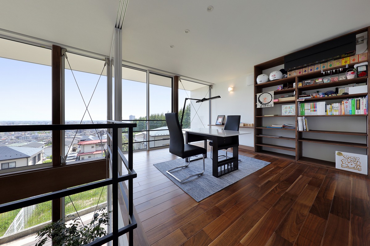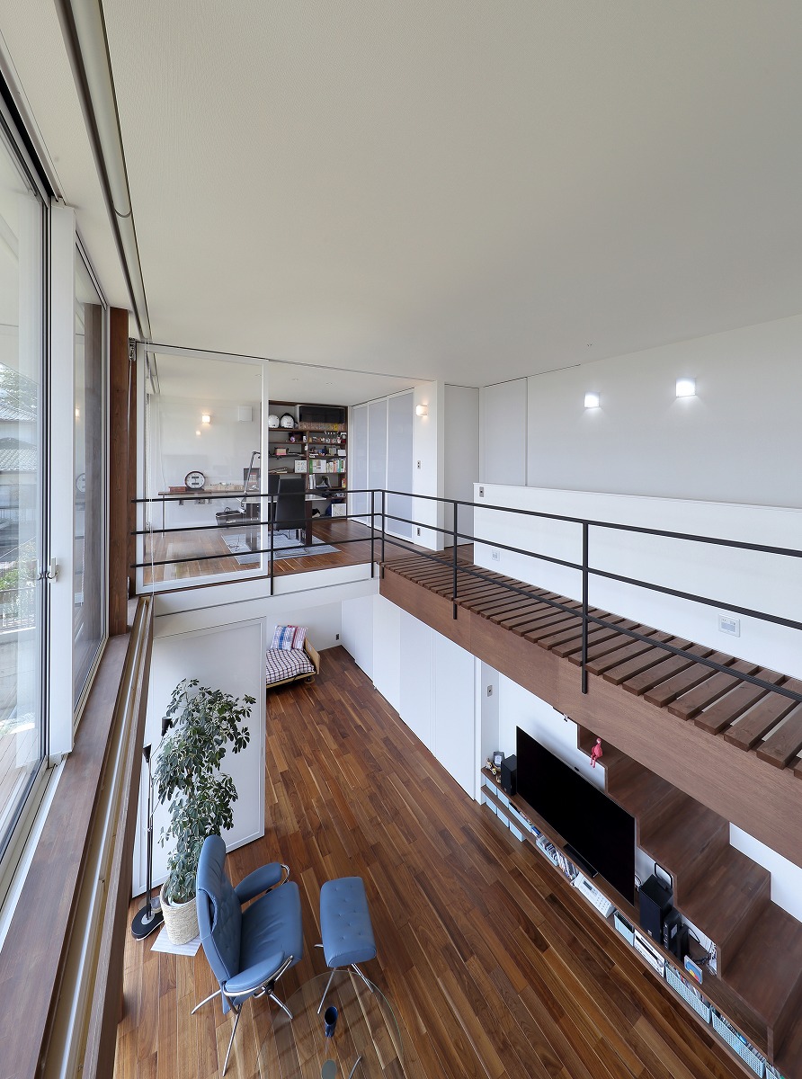 2階はプライベートルームで構成されていて、シンプルに左右に分かれています。東側は主寝室と可動間仕切りによってつながるインナーテラス、西側は客間にもなる個室と可動間仕切りによってつながるご主人の書斎があります。これらをつなぐブリッジをスノコ状にすることで1階に圧迫感を与えないように工夫しています。ブリッジを動線としてだけではなく、吹き抜けに面することで眺望を楽しめる空間にしています。