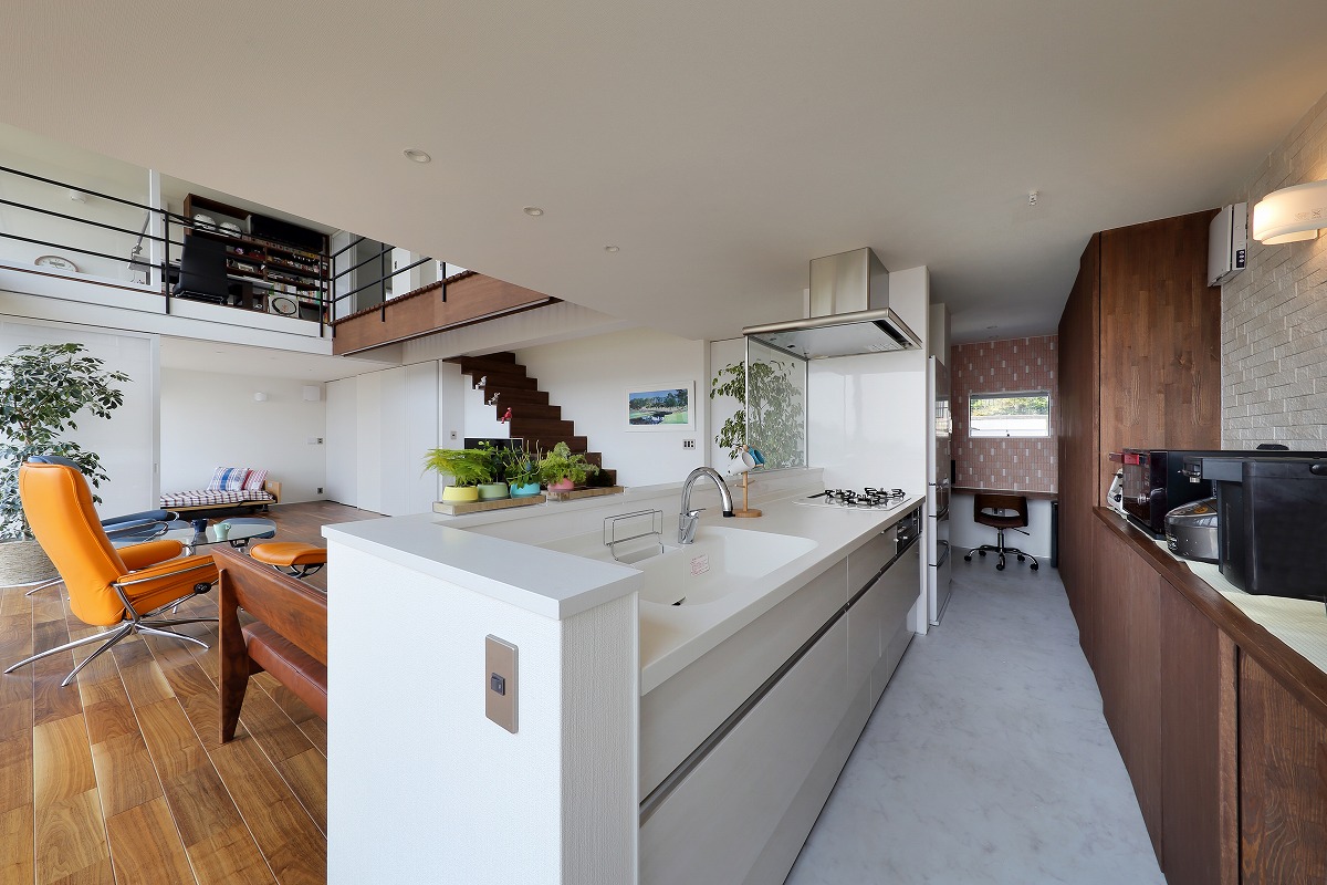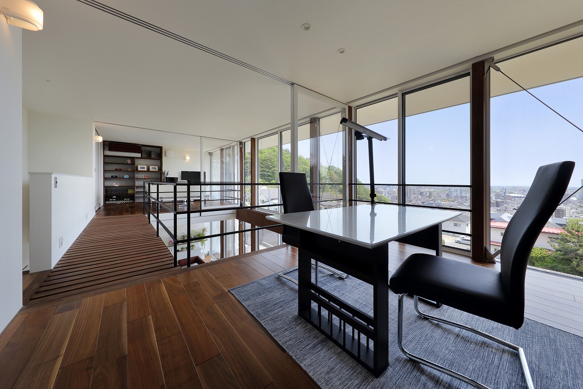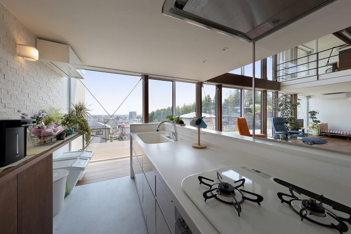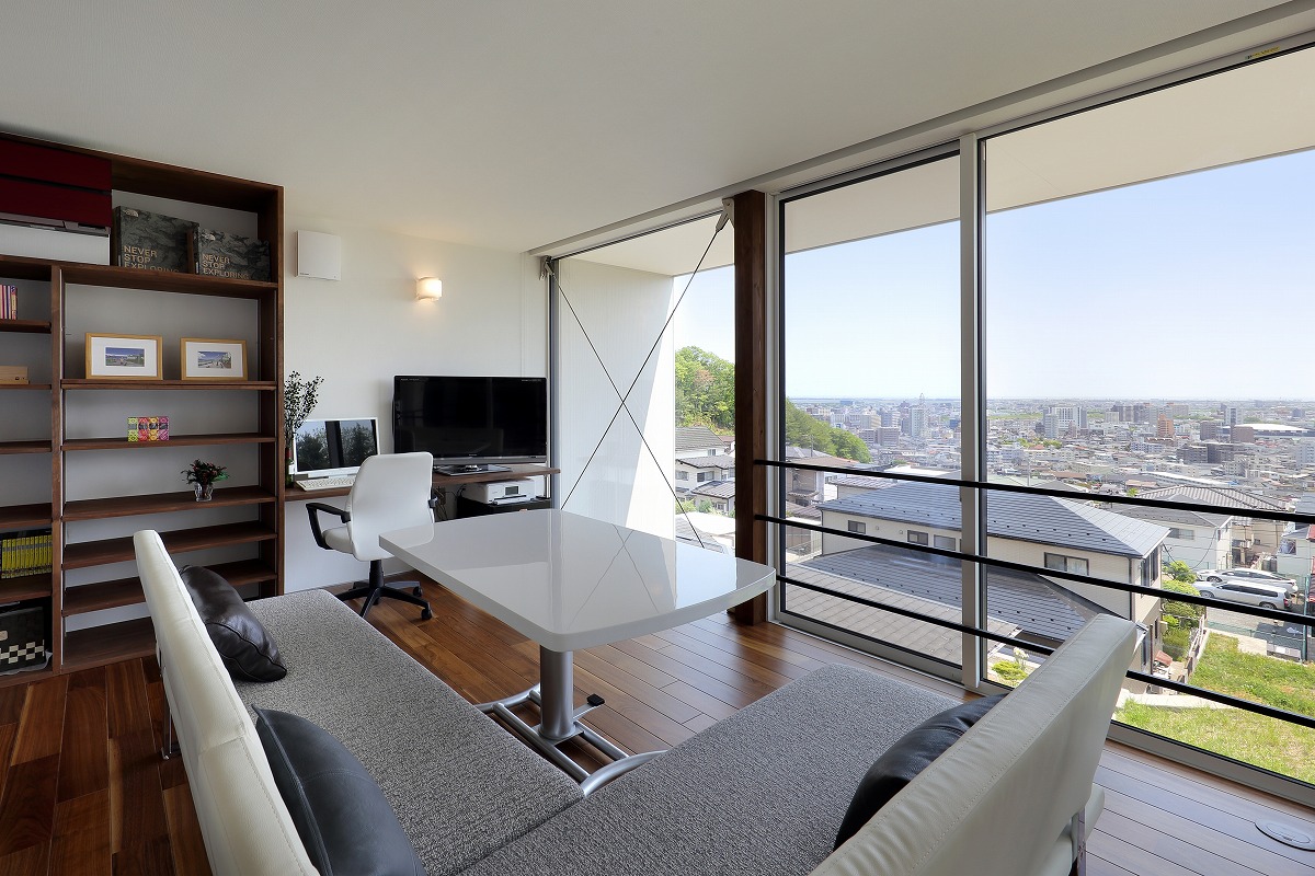 車椅子のご家族のために日頃慣れている車の乗り降りからスロープを経由して引戸の玄関へとアプローチし、個室へとつながります。玄関やトイレも車椅子での転回スペースなどを考慮しています。可動間仕切りでオープンにもできる個室と一体になったLDKからは太平洋を一望できるデッキテラスを設計し、床レベルでも広がりのある空間としています。奥さんの家事動線は回遊できるようにし、家事室で作業も可能です。浴室からは「仙台スカイキャンドル」の夜景も楽しめます。