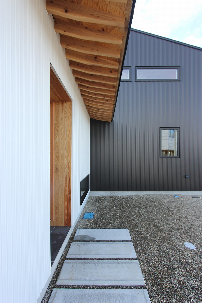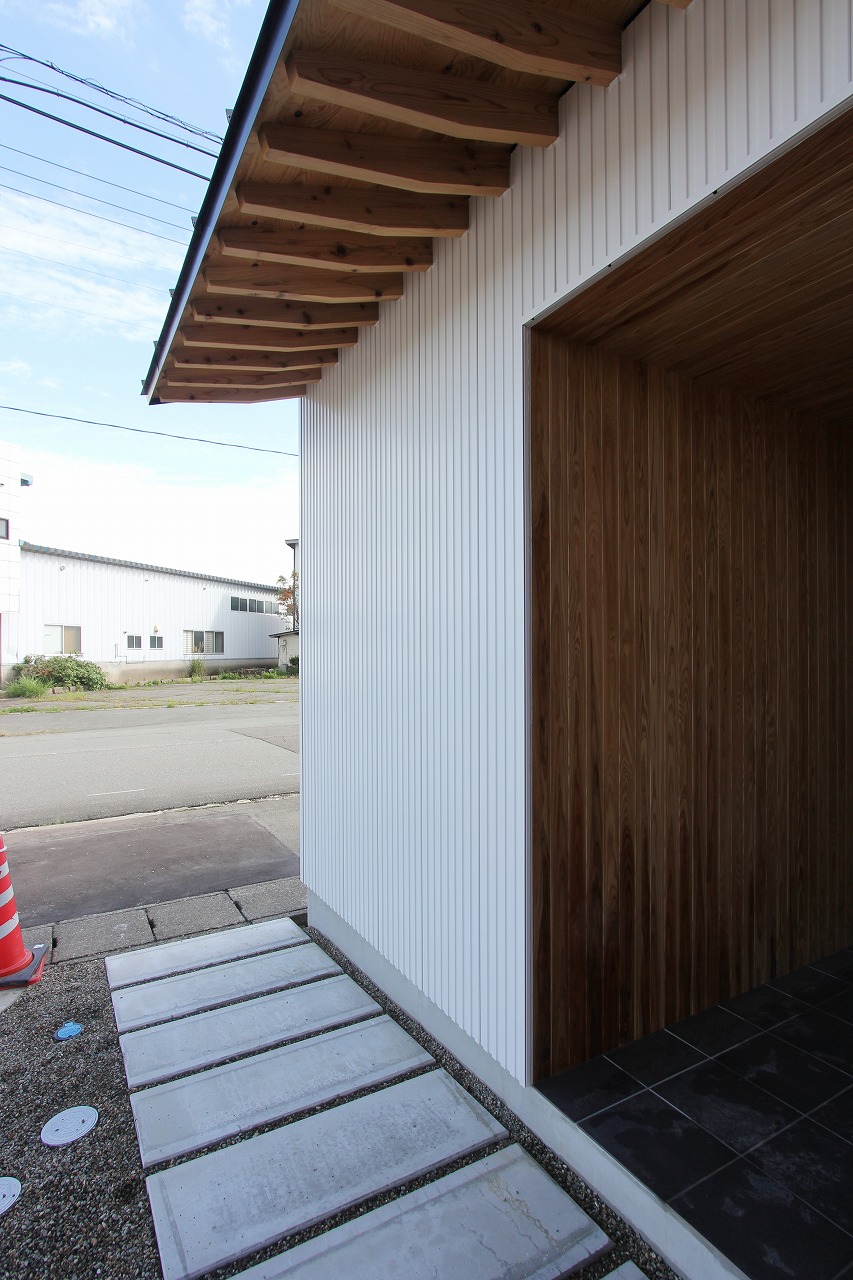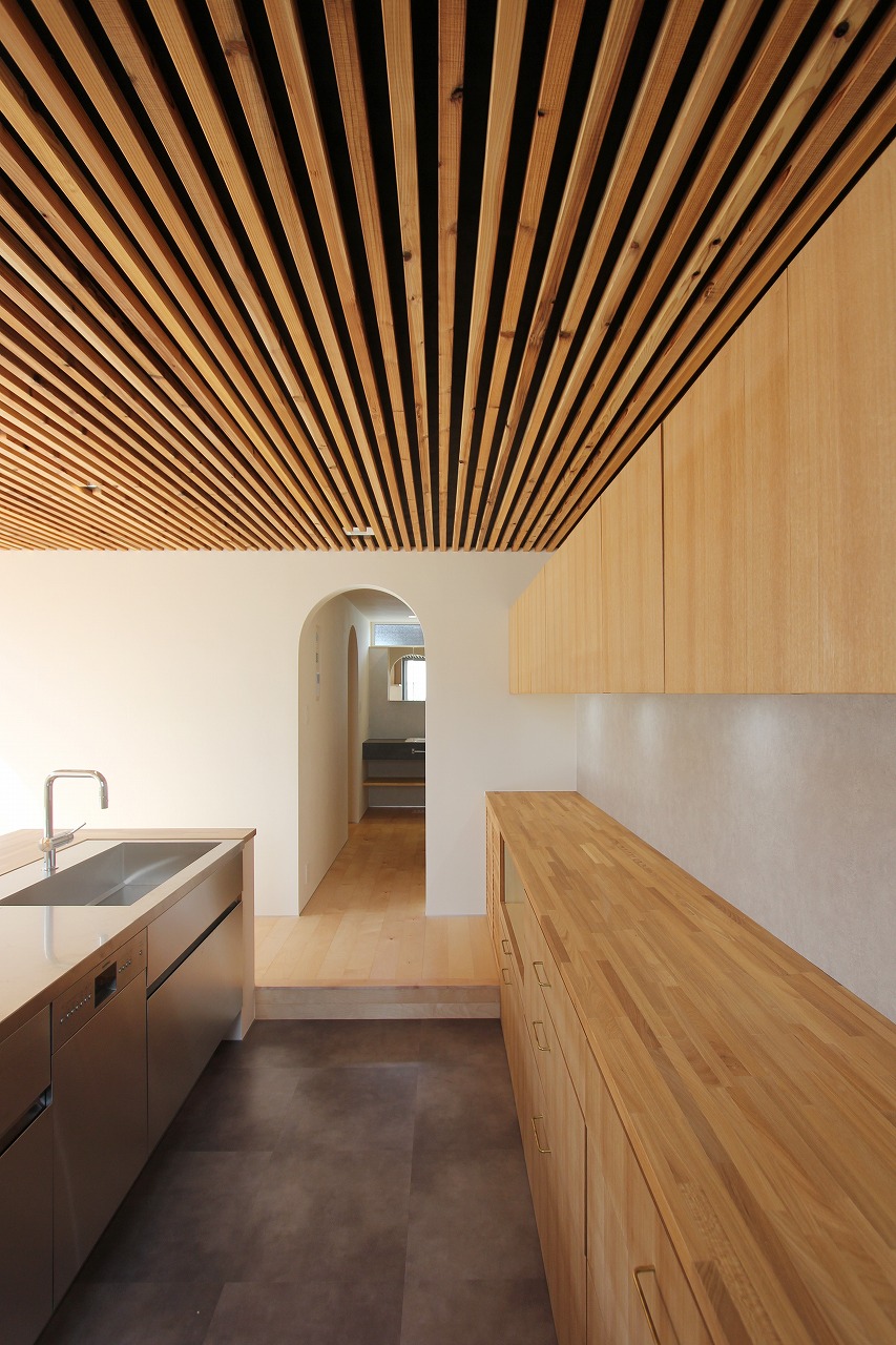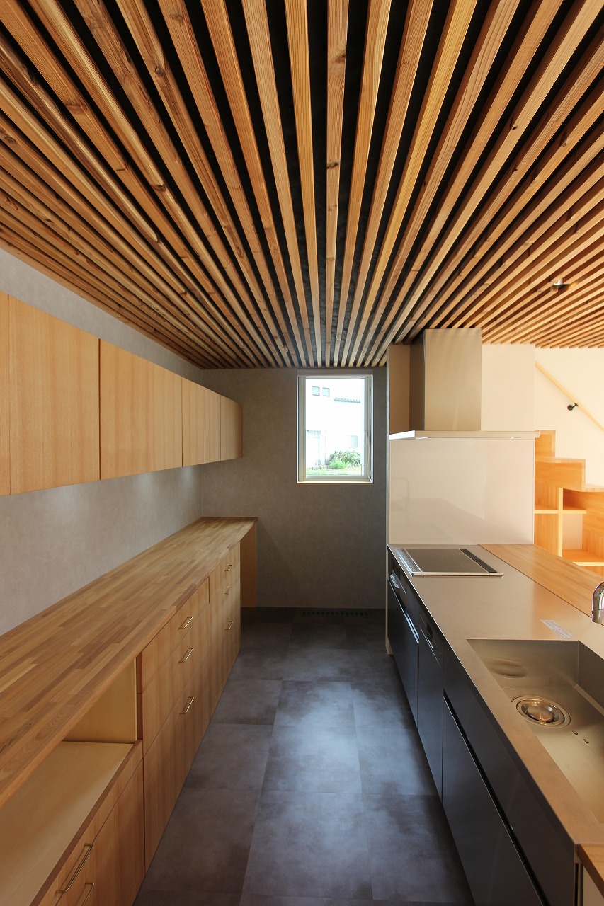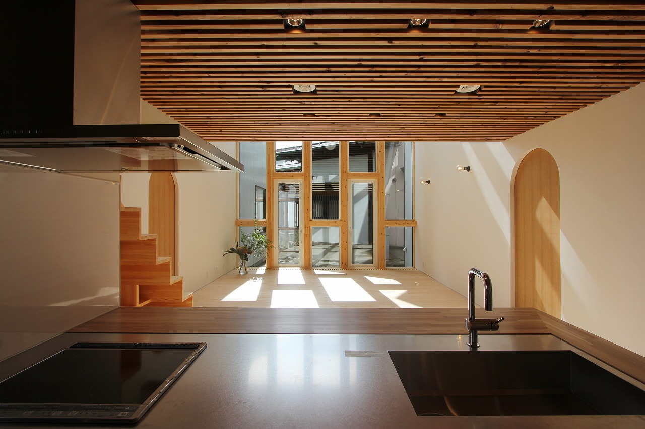 そこで道路に対してご要望であるインナーガレージを設計することとし、雁行しながらプラン配置を検討しました。また南側にご実家があり建物高さもあることから採光の取り方やご実家との関係性を模索しました。