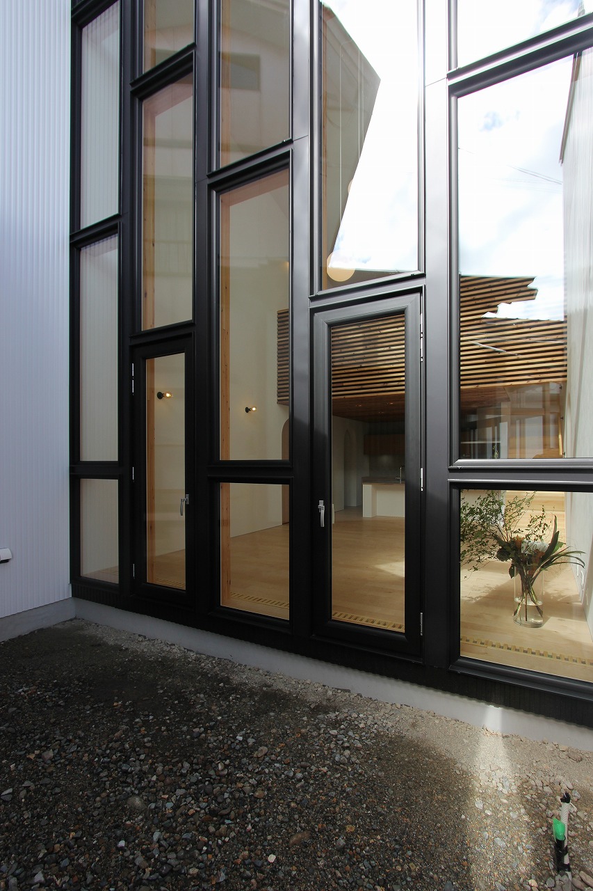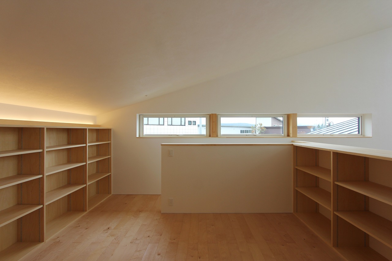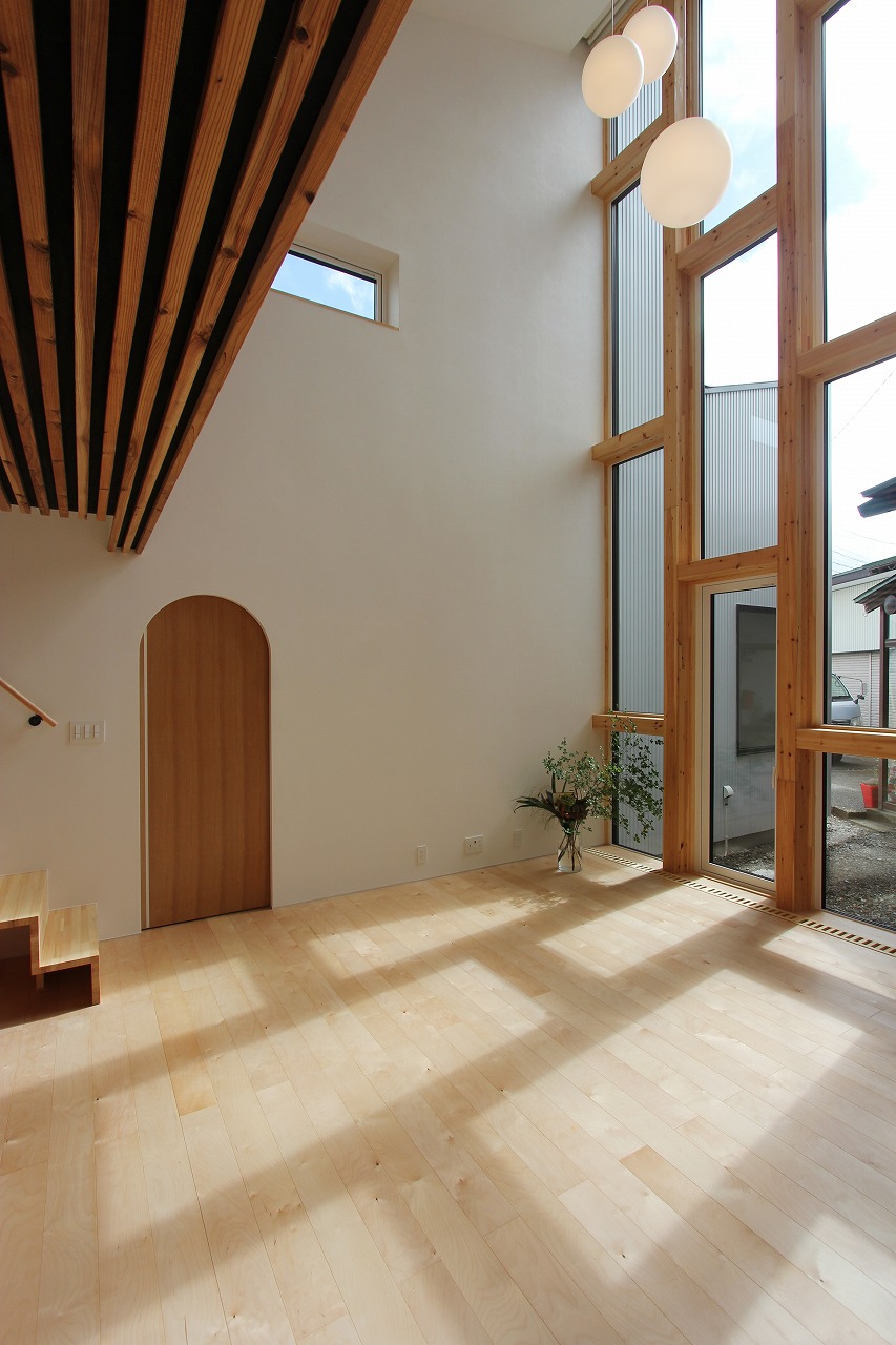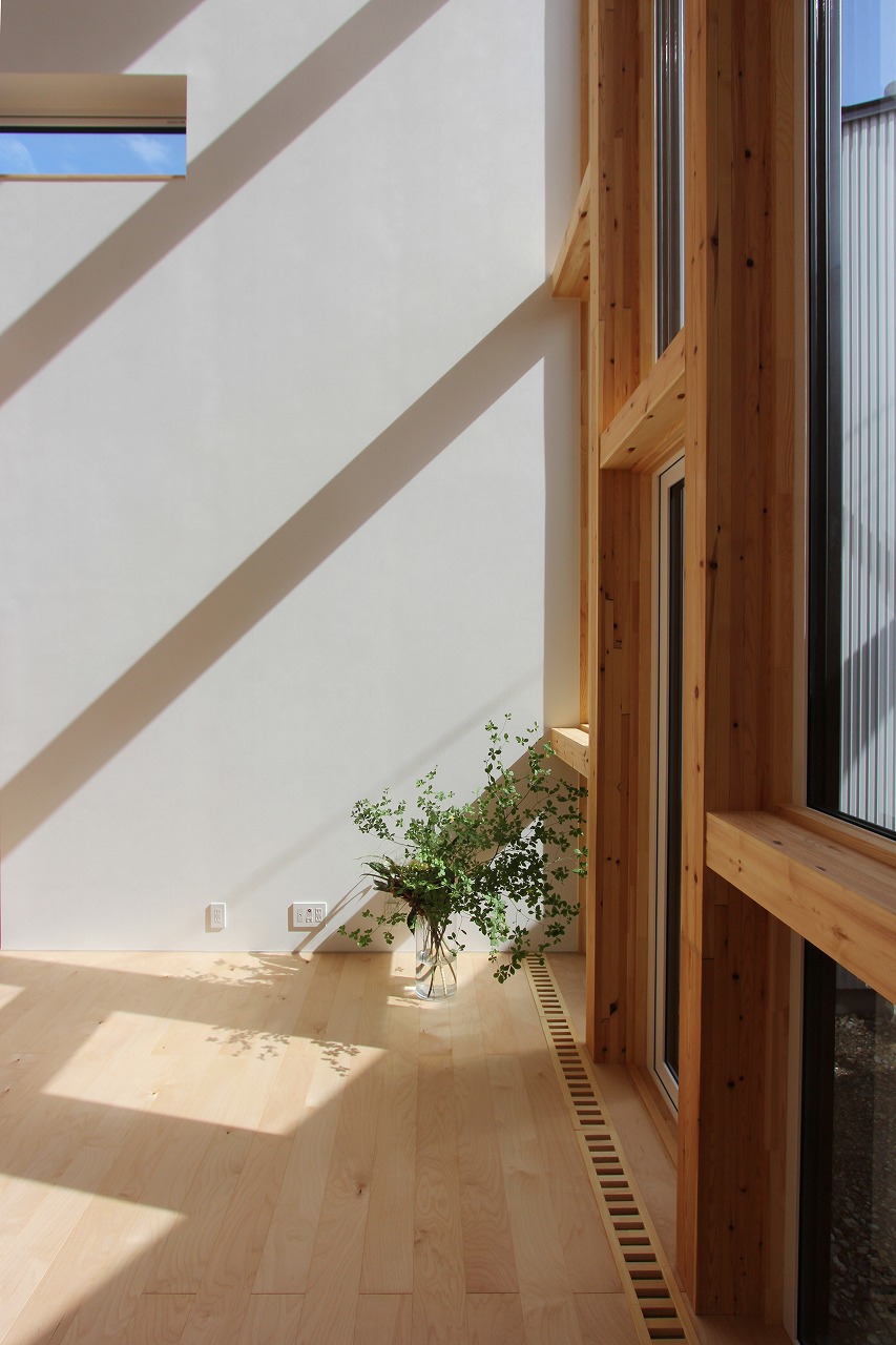 断熱性能や気密性能も雪国仕様としています。床下空間も室内という考えでエアコン1台による全館暖房を採用しました。吹き抜けに面した大開口には夏の日差しを和らげる電動スクリーンも完備しています。