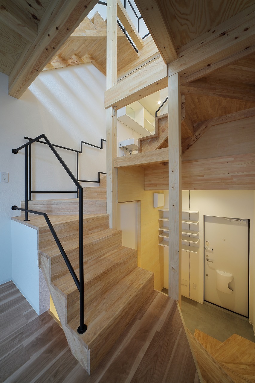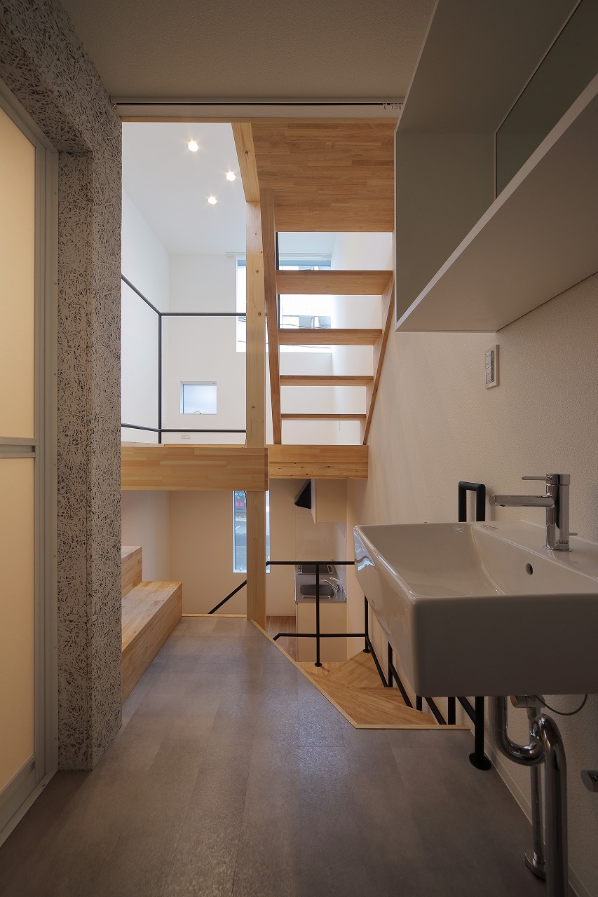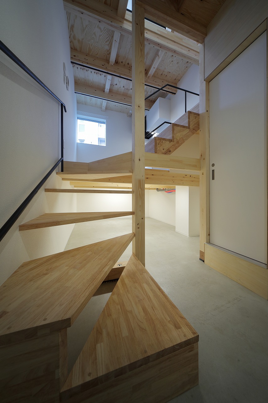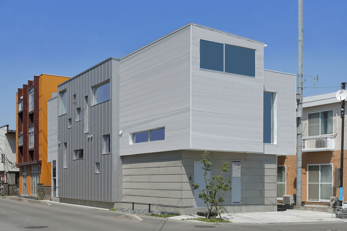 計画地は、古い建物が多く建つ市街地である。47坪の駐車場として使われていた敷地に6戸の集合住宅を作った。交通量の多い道路沿いに位置した本物件は、入居者のプライバシーを考慮するため、玄関までのアクセスを単一なものとせず、各住戸へ、多方向からアクセスするようになっている。そのため、どの入り口(玄関)からどの部分に入居しているかは、外観からはわかり分かりにくい。内部は、メゾネットとなっており、床下やロフトを有し縦に広い空間が広がる。6住戸すべて、間取りやデザインが異なり、それぞれ好みに合わせ選ぶ楽しさもある。また、住戸内の仕切りを最大限減らすことで、床面積以上の広さを感じる作りとした。