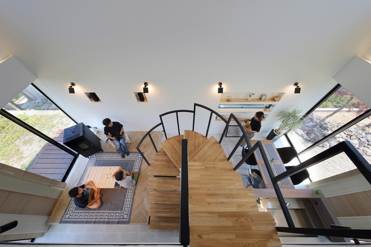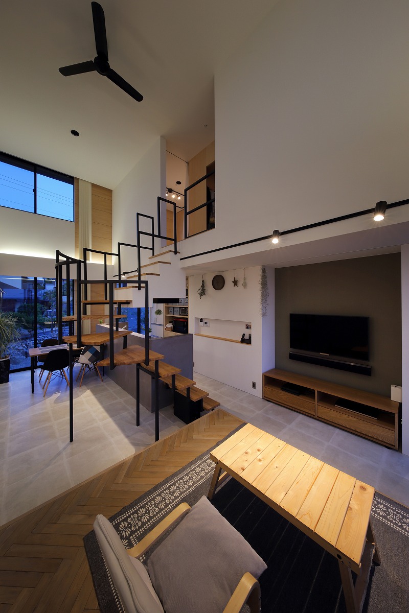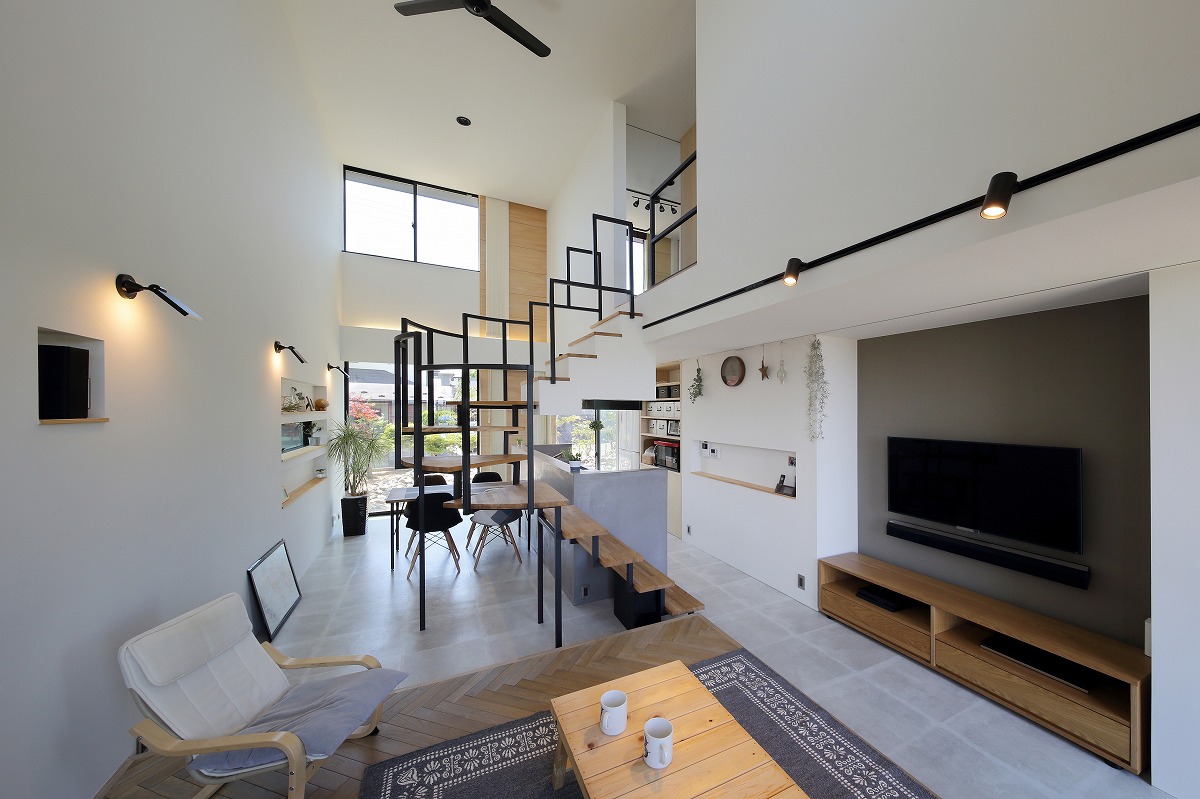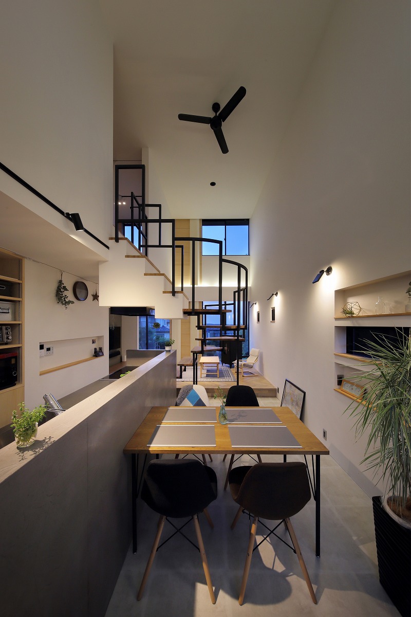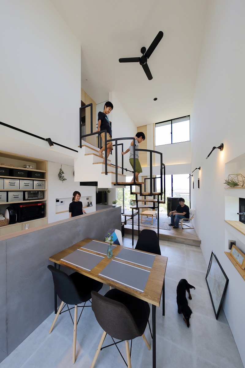 内部は吹き抜けを南北通すことで床面積以上の広がりをLDKに与えています。鉄骨階段によって緩やかにリビングとダイニングキッチンを隔てています。1階は水廻りと客間の回遊性を活かして、行き止まりのない空間構成によって狭さを感じない工夫もしています。