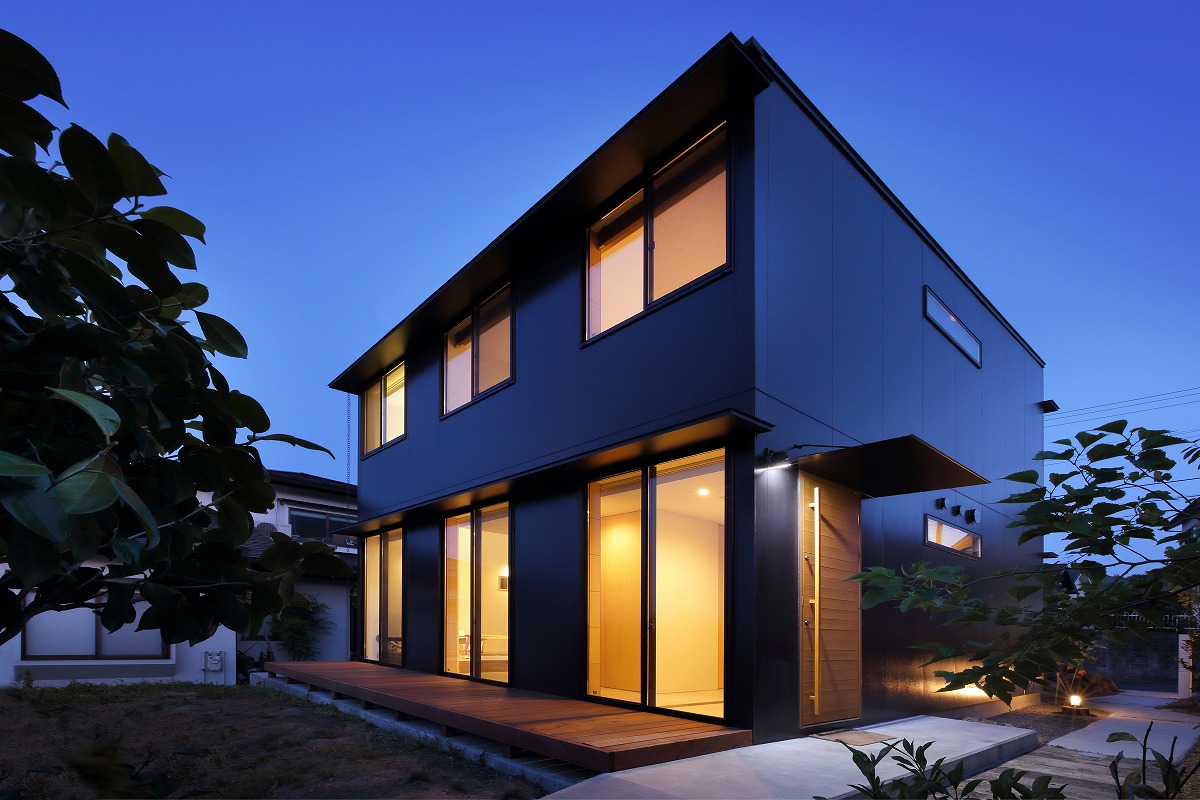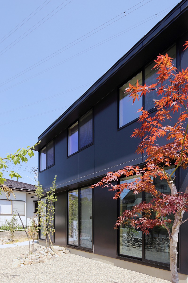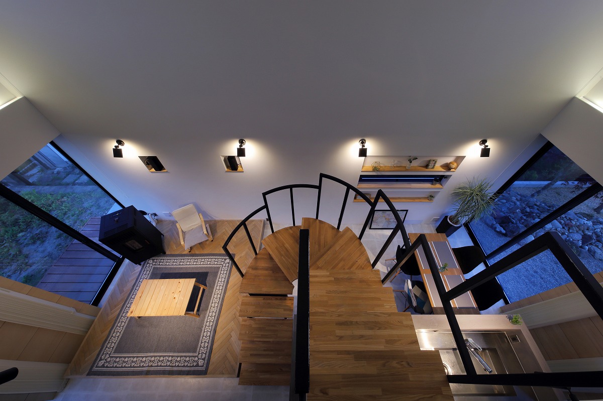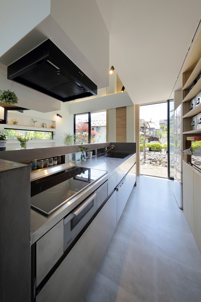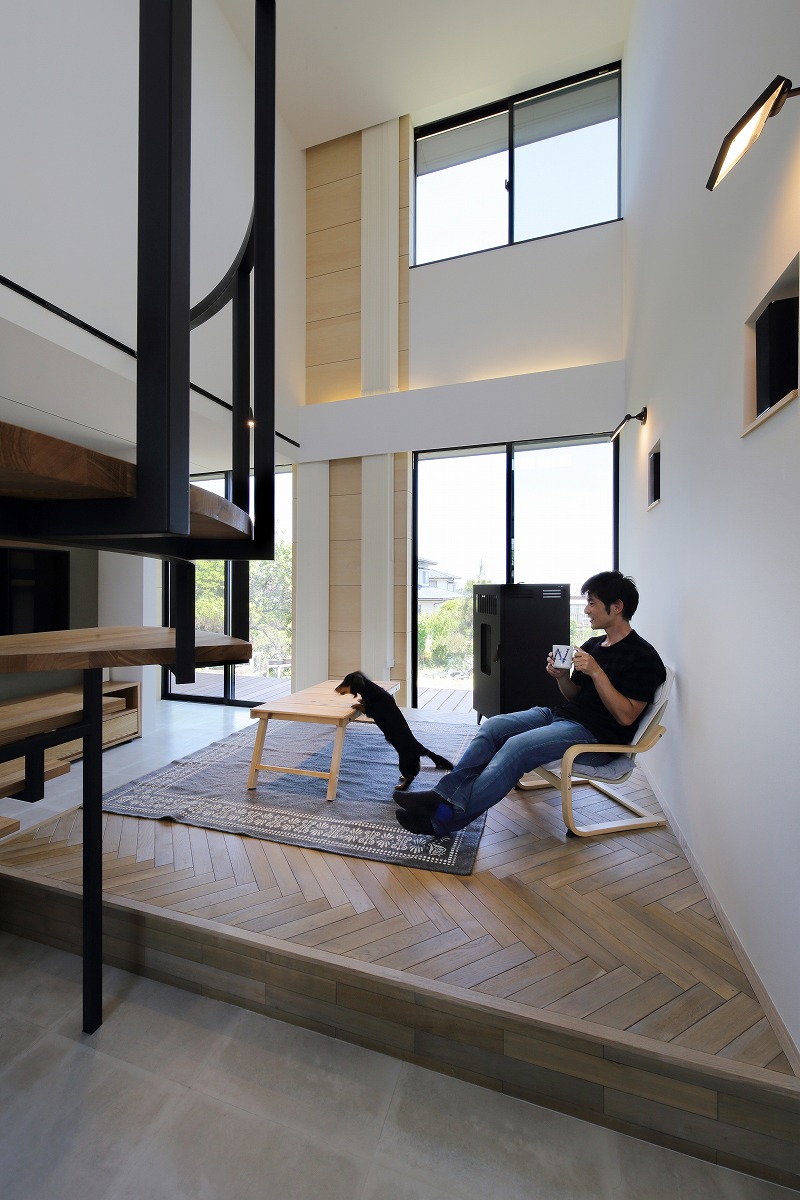 内部は吹き抜けを南北通すことで床面積以上の広がりをLDKに与えています。鉄骨階段によって緩やかにリビングとダイニングキッチンを隔てています。1階は水廻りと客間の回遊性を活かして、行き止まりのない空間構成によって狭さを感じない工夫もしています。