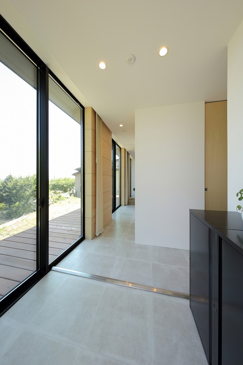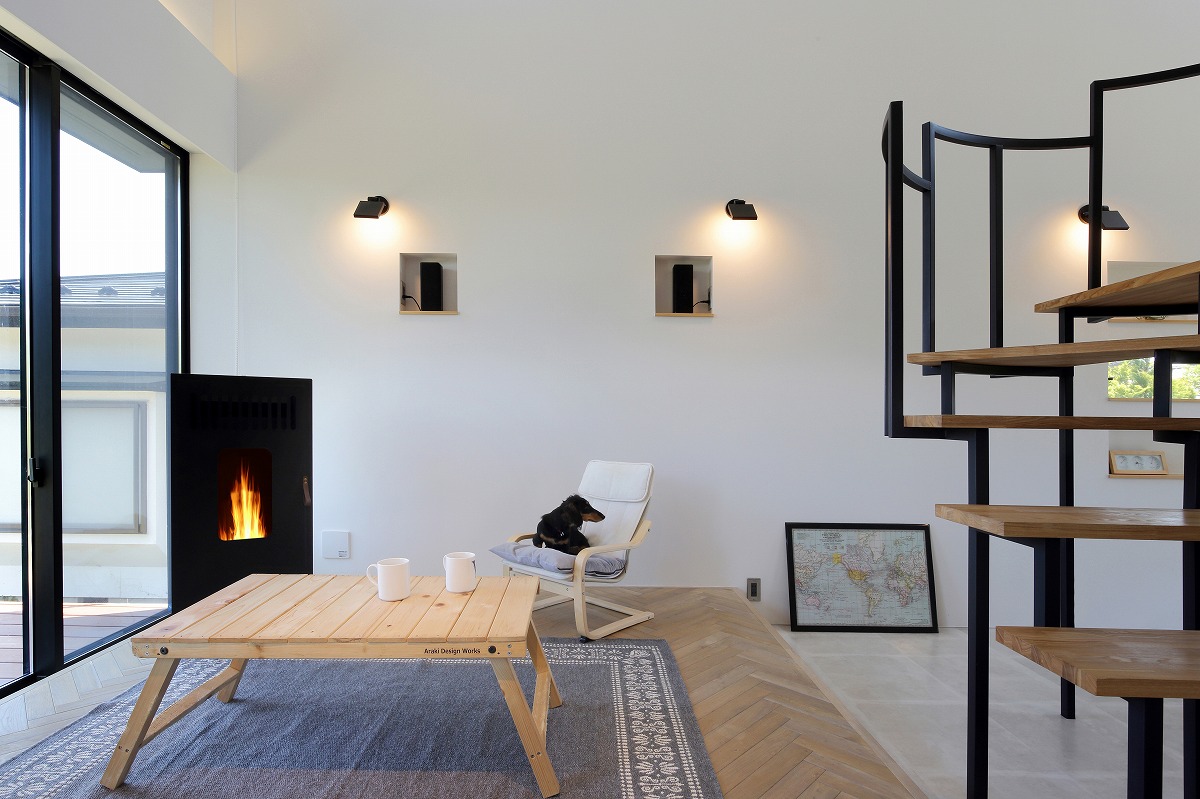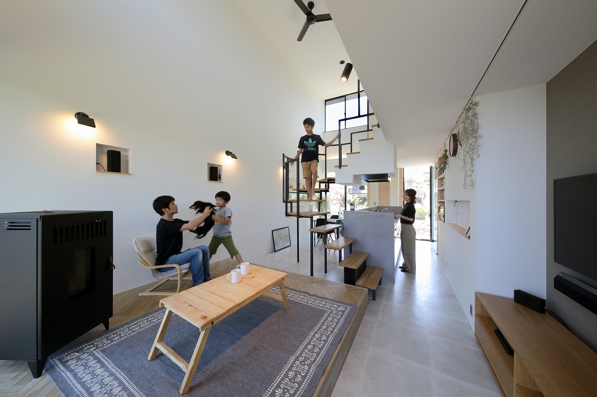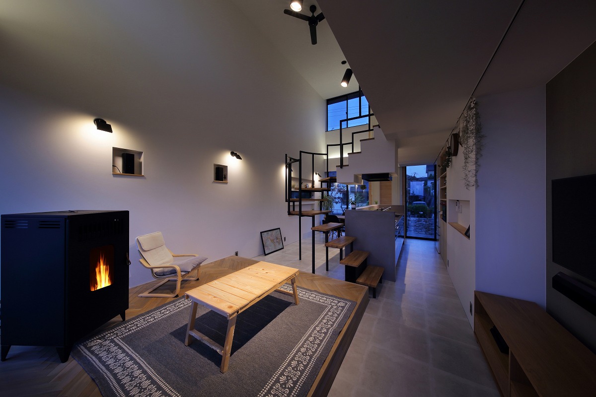 プランの構成上ワンルーム型の建物は間仕切りも少ないことから全館暖房を採用してエアコンによって各部屋に供給される計画としました。リビング空間には旦那さんご希望のペレットストーブも配置しています。
