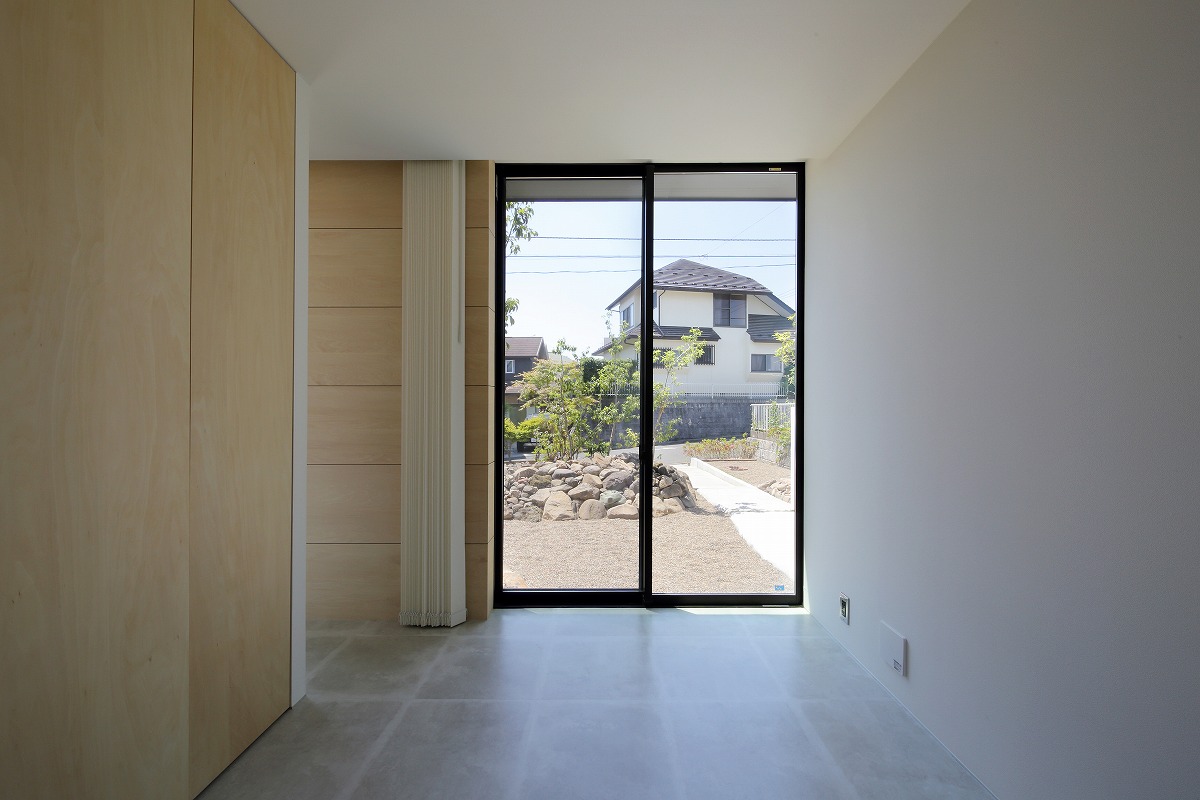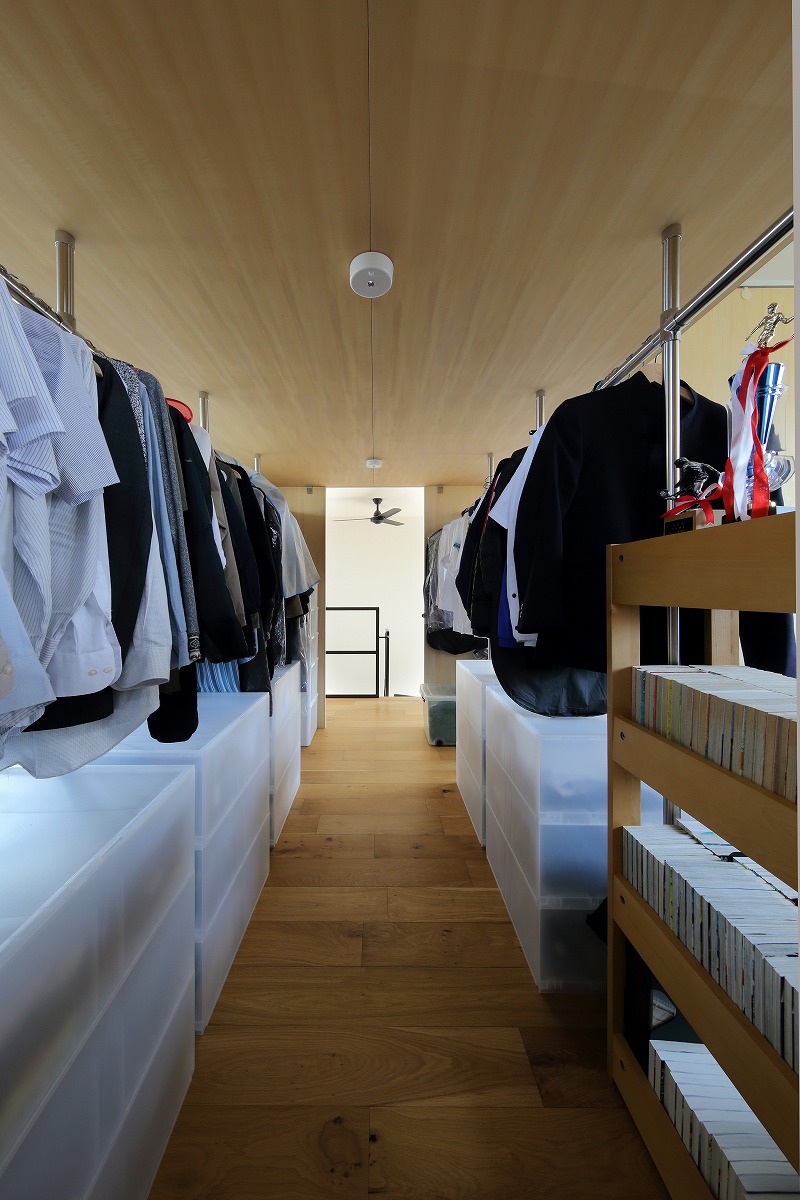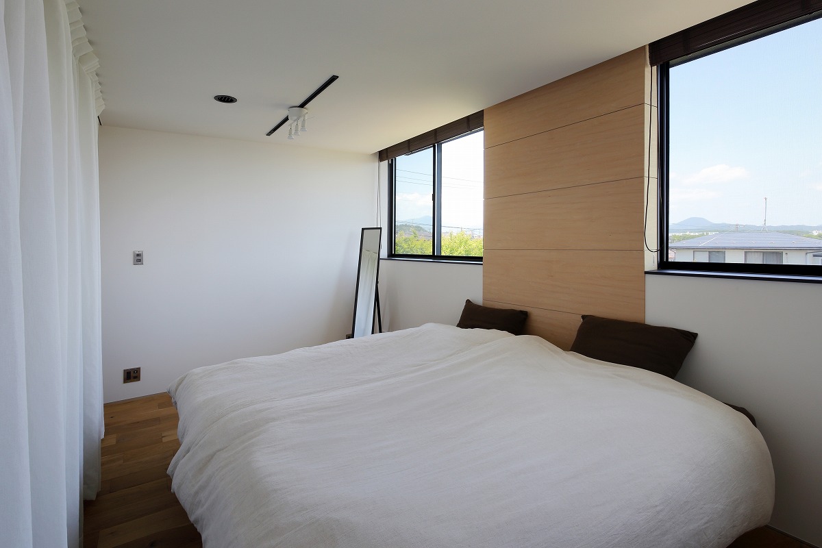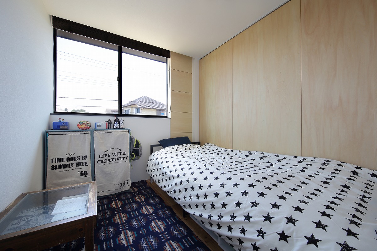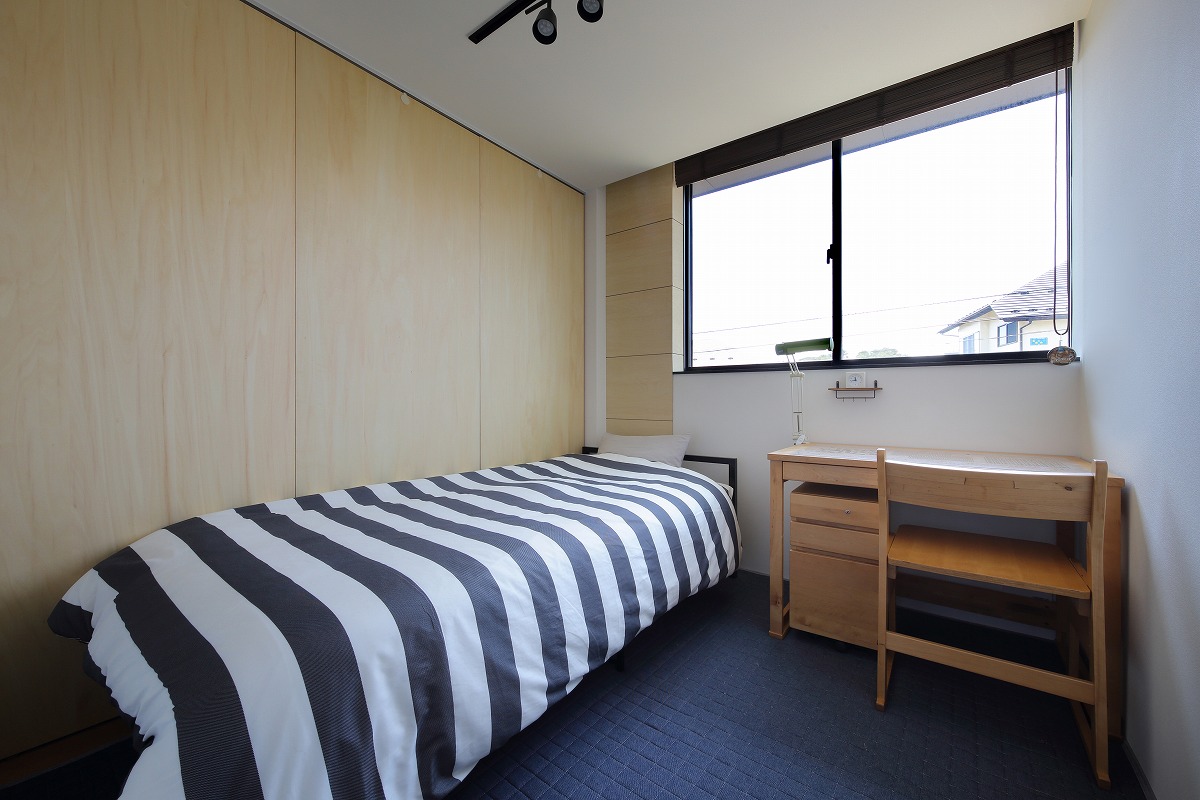 2階はワンルーム型とし、建具を設けないことでコストを抑えています。中央に配置した収納のコアは各部屋からも使用することができるように。南側の環境がよい空間を子供部屋とし、可動間仕切りで仕切ることで将来のプラン構成に自由度を与えています。北側の景色を眺められる落ち着いた空間には寝室を配置しています。