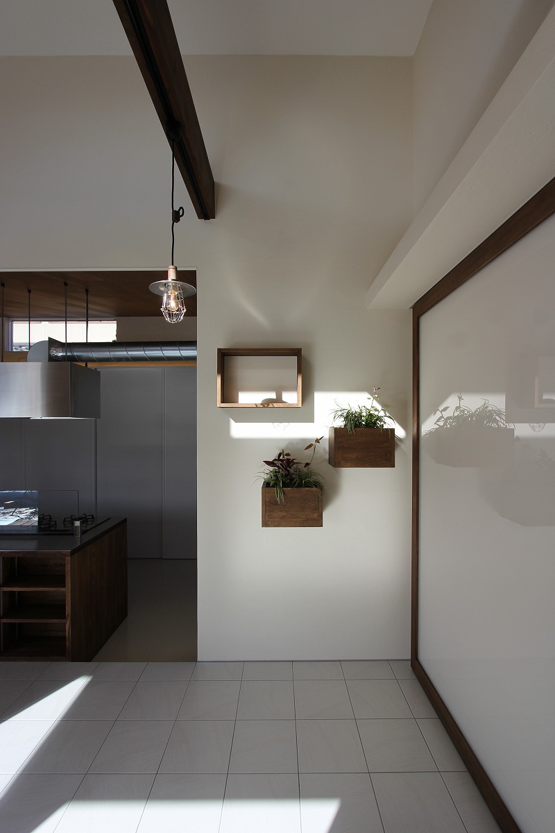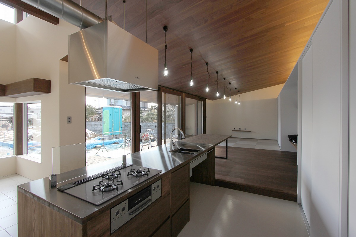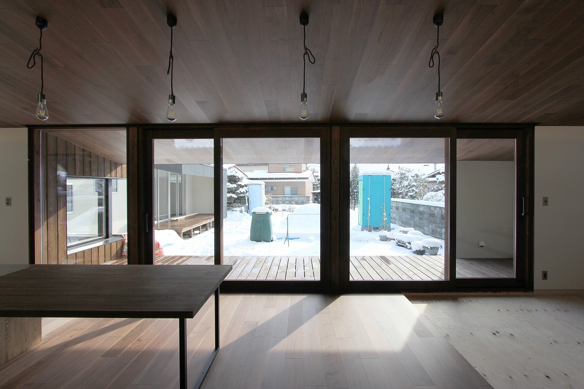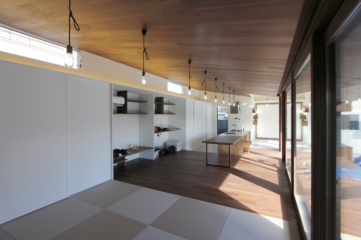 共通の趣味である植物をみんなが集まる部屋の入口にサンルームとして配置し、普段の生活の中でいつでも観賞できるようにした。広々としたLDKはキッチンと連続したダイニングテーブルなど最大13名集まることもある団らんを考慮している。北側には収納スペースを確保し、南側には庭へとつながるテラスを配置している。深い庇のもと、ハンモックなど趣味を味わえる空間とした。