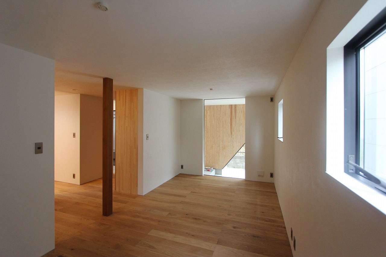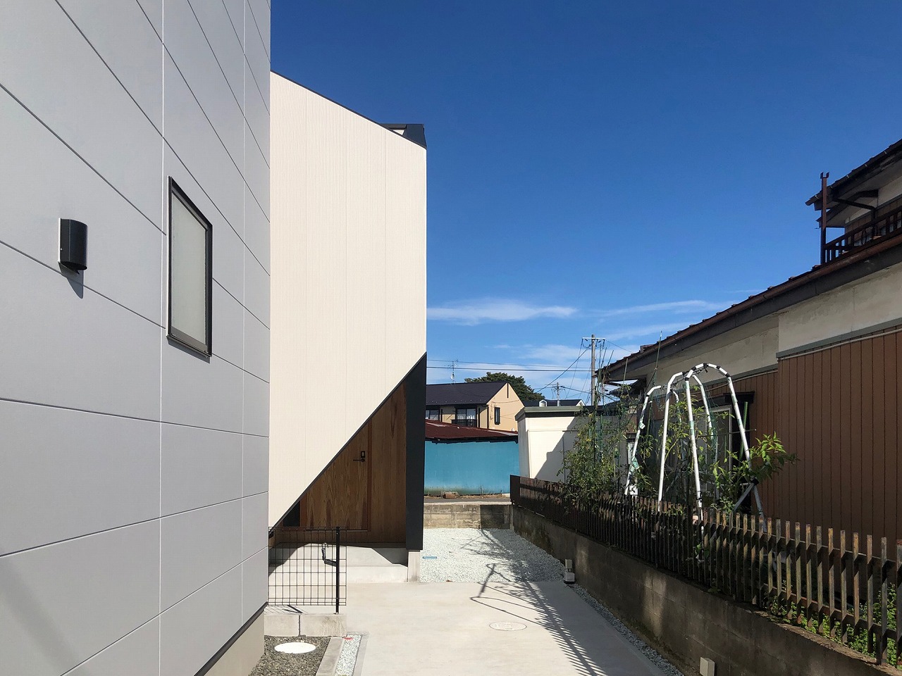 計画地は70坪ほどの敷地を分割された旗竿地です。37坪ほどの敷地ですが通路部分を除くと27坪程度になります。ご家族4人の住まいを計画しました。一番気になっていたことは日当たりのことでした。当初は南側隣地にどのような建物が建設されるかわからなかったのですが1階部分の日当たりは良くないことは想像できました。そこで2階に家族が集まるLDKを計画しました。1階部分はプライベートな居室と水廻りを配置しました。限られた面積の中にトイレもフロアごとに計画できました。南東角が一番環境がよいこともありただの壁や庇だけでデザインすることにプラスしてつまんだように角を上げ下げすることで外観にもメリハリができました。