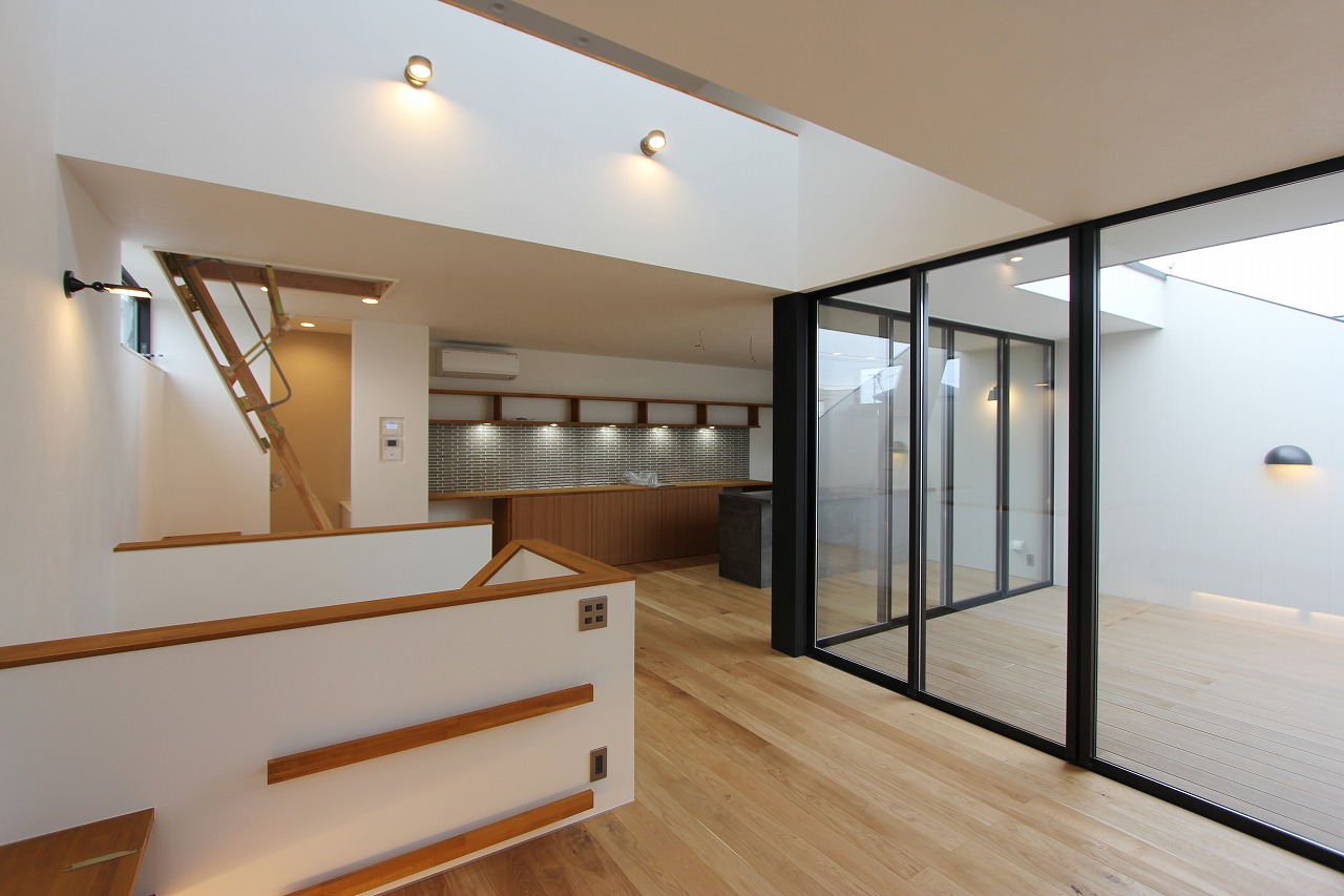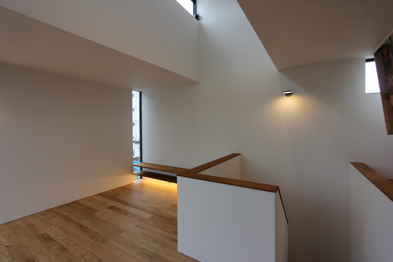 2階はテラスより採光を得ることに加え、ロフトと吹き抜けを設け、ハイサイドライトからの採光も追加しました。リビング部分の上部に設けたこの吹き抜けは開放感にも寄与します。また階段部分にも光を落とすことから1階までほのかに明るい空間になります。