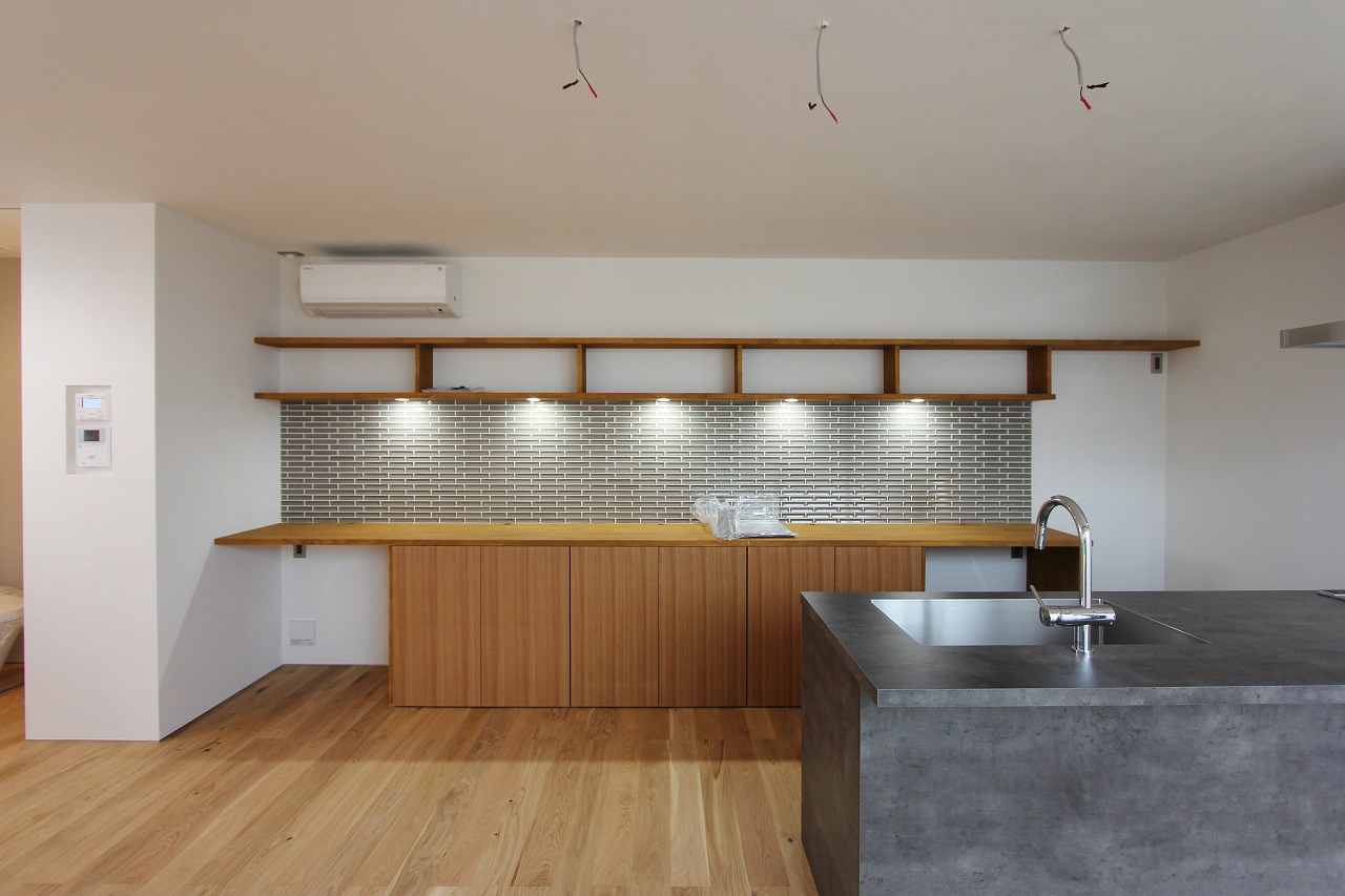 2階のテラスを囲うようにL型に窓を配置し、ゆるやかにリビングとダイニングキッチンを分けています。ダイニングの脇にはお子さんがフリーに使用できるカウンターもあります。このフロアで歯磨きなども完結できるようにトイレの手洗器は洗面としての機能も持たせています。