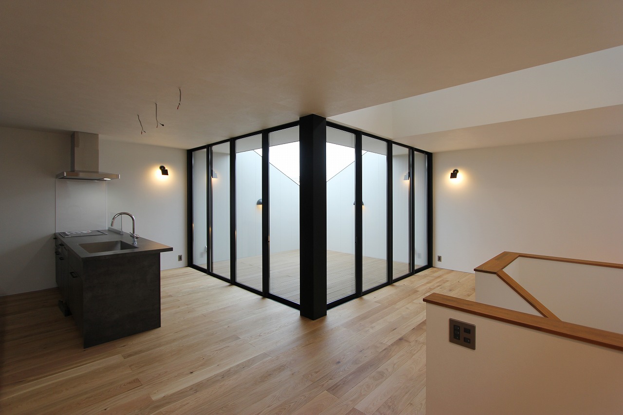 庭のないコンパクトな住まいですがテラスや吹き抜けなど外部空間を取り込む仕掛けによって開放的な住まいとなりました。