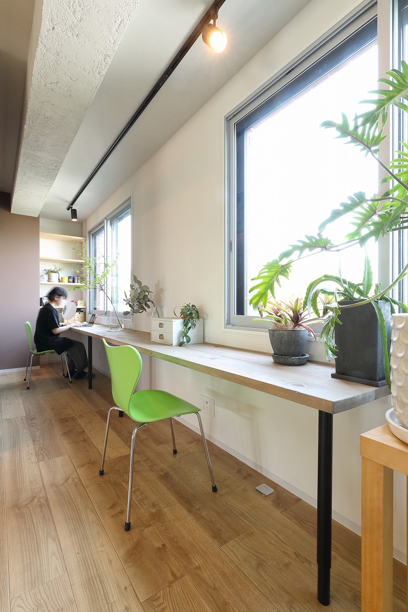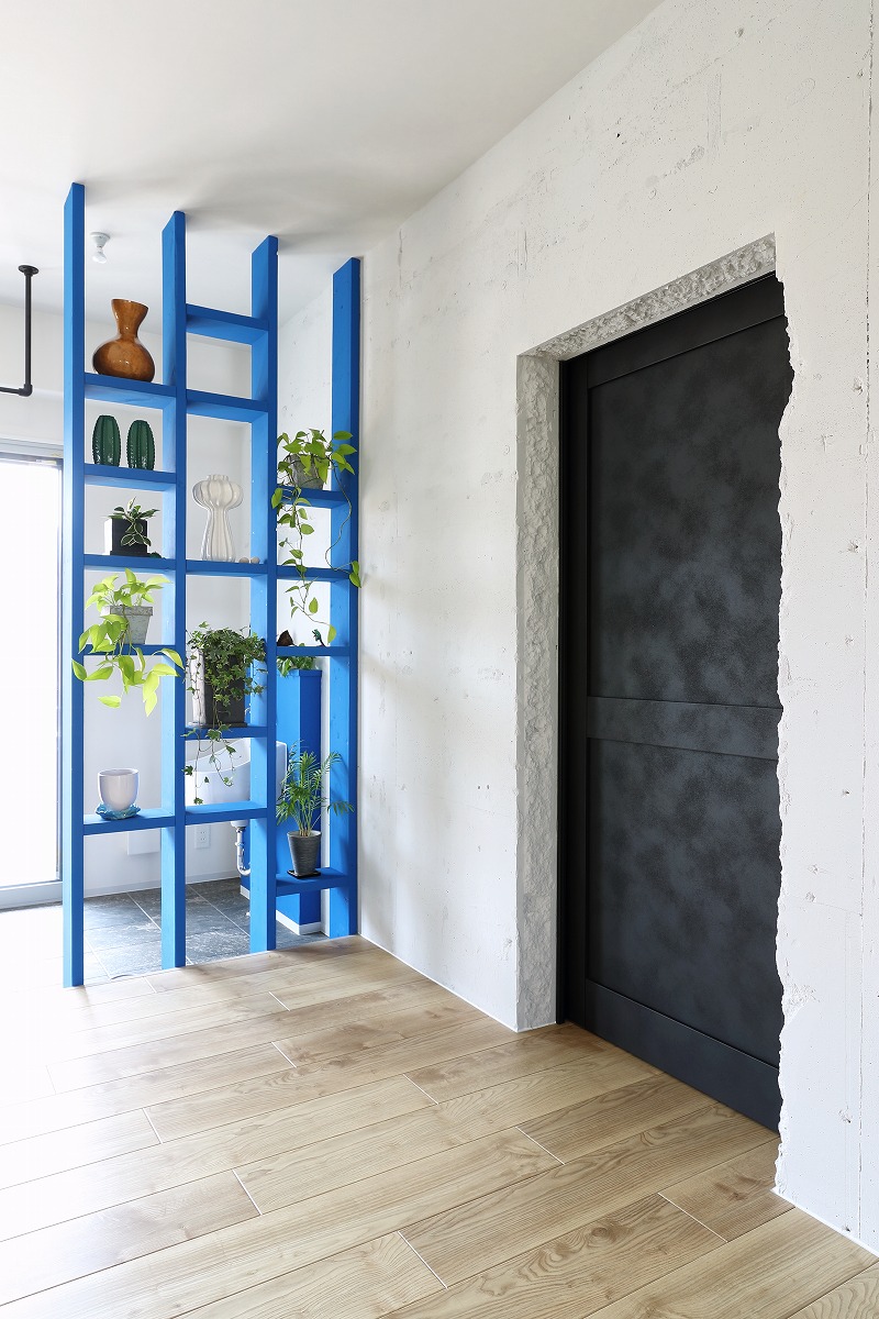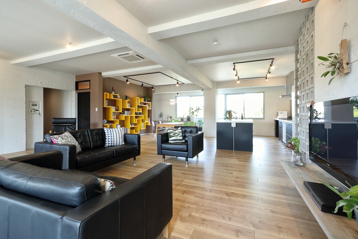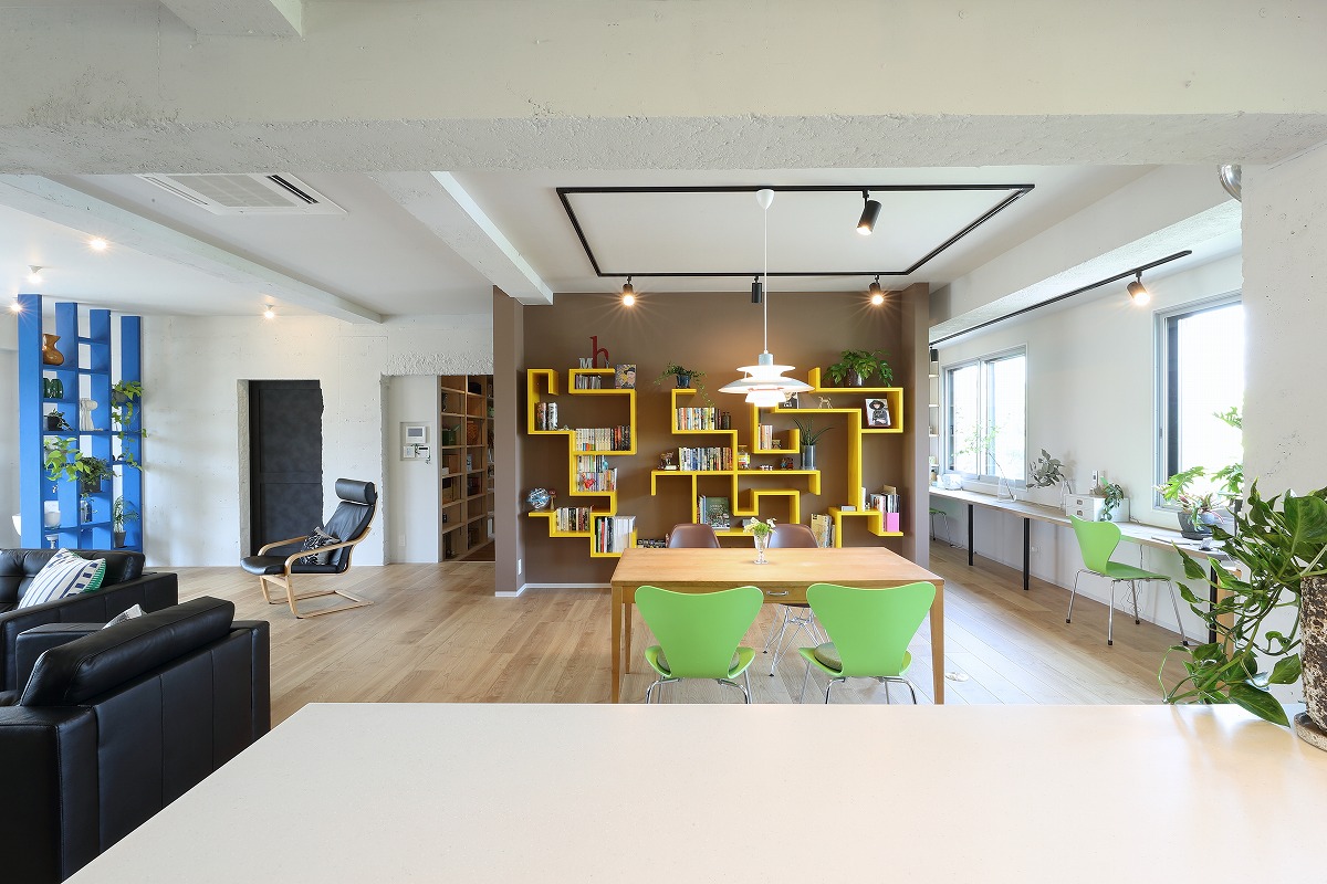 中廊下で区切られていた南北の居室を必要な構造は残しつつ解体し、ワンルームとすることで南側だけではなく、北側の安定した採光や街路樹を取り込むことができる大空間を実現しています。柱や壁、梁といった以前は隠れていた構造を仕上に使うとともに、有孔ブロックや単管足場、足場板などラフ&ワイルドを継承する仕上も取り入れています。アクセントとして要所に取り入れたビビットカラーによって新旧入り混じった不思議な空間を演出しています。