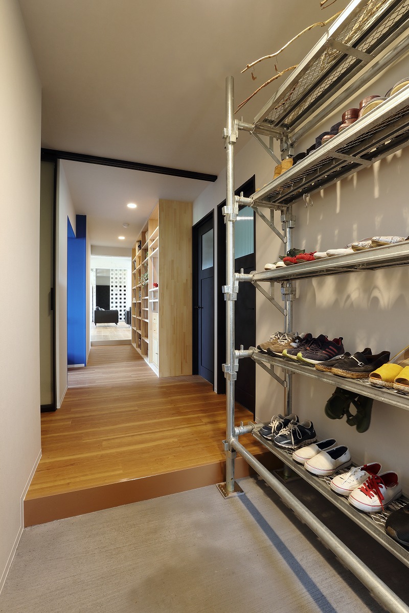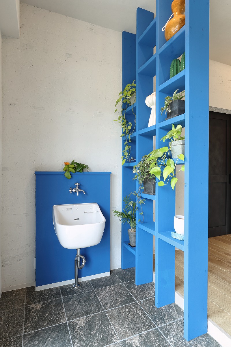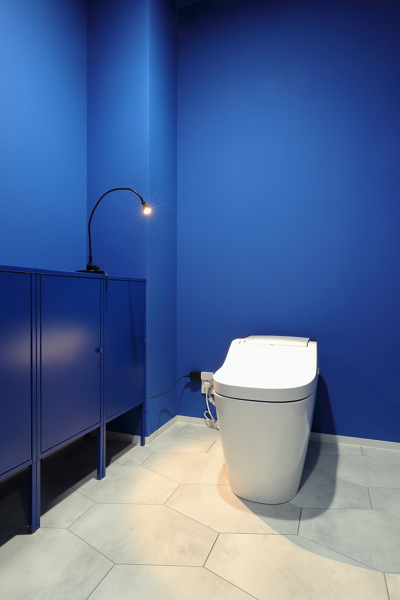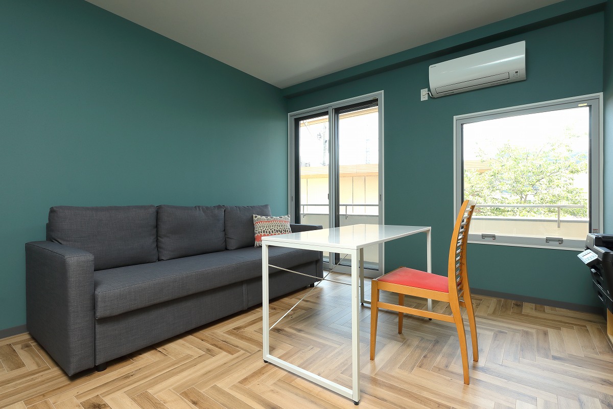 中廊下で区切られていた南北の居室を必要な構造は残しつつ解体し、ワンルームとすることで南側だけではなく、北側の安定した採光や街路樹を取り込むことができる大空間を実現しています。柱や壁、梁といった以前は隠れていた構造を仕上に使うとともに、有孔ブロックや単管足場、足場板などラフ&ワイルドを継承する仕上も取り入れています。アクセントとして要所に取り入れたビビットカラーによって新旧入り混じった不思議な空間を演出しています。