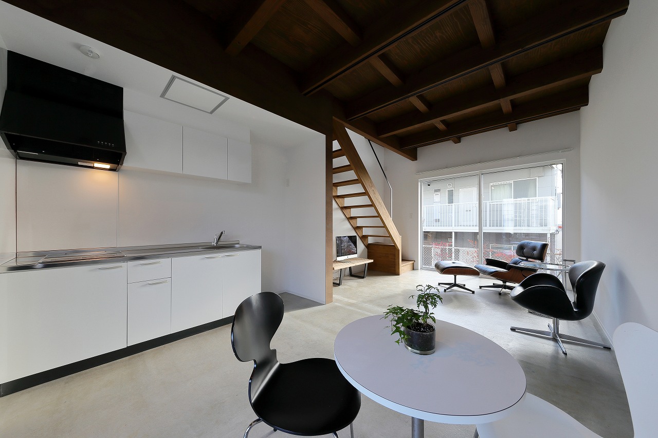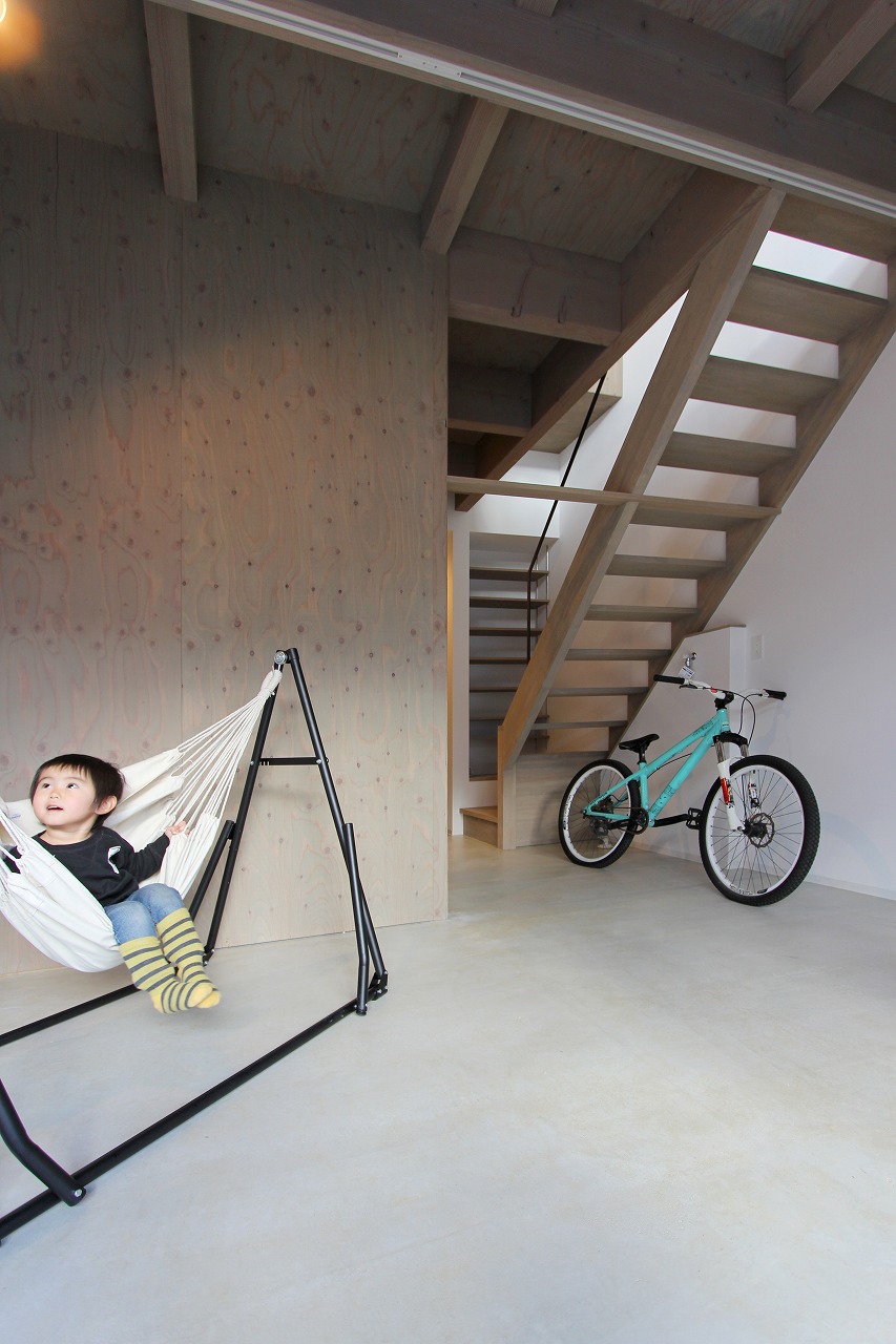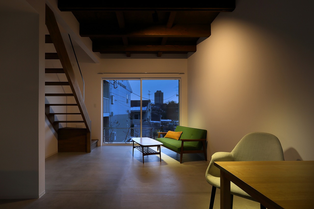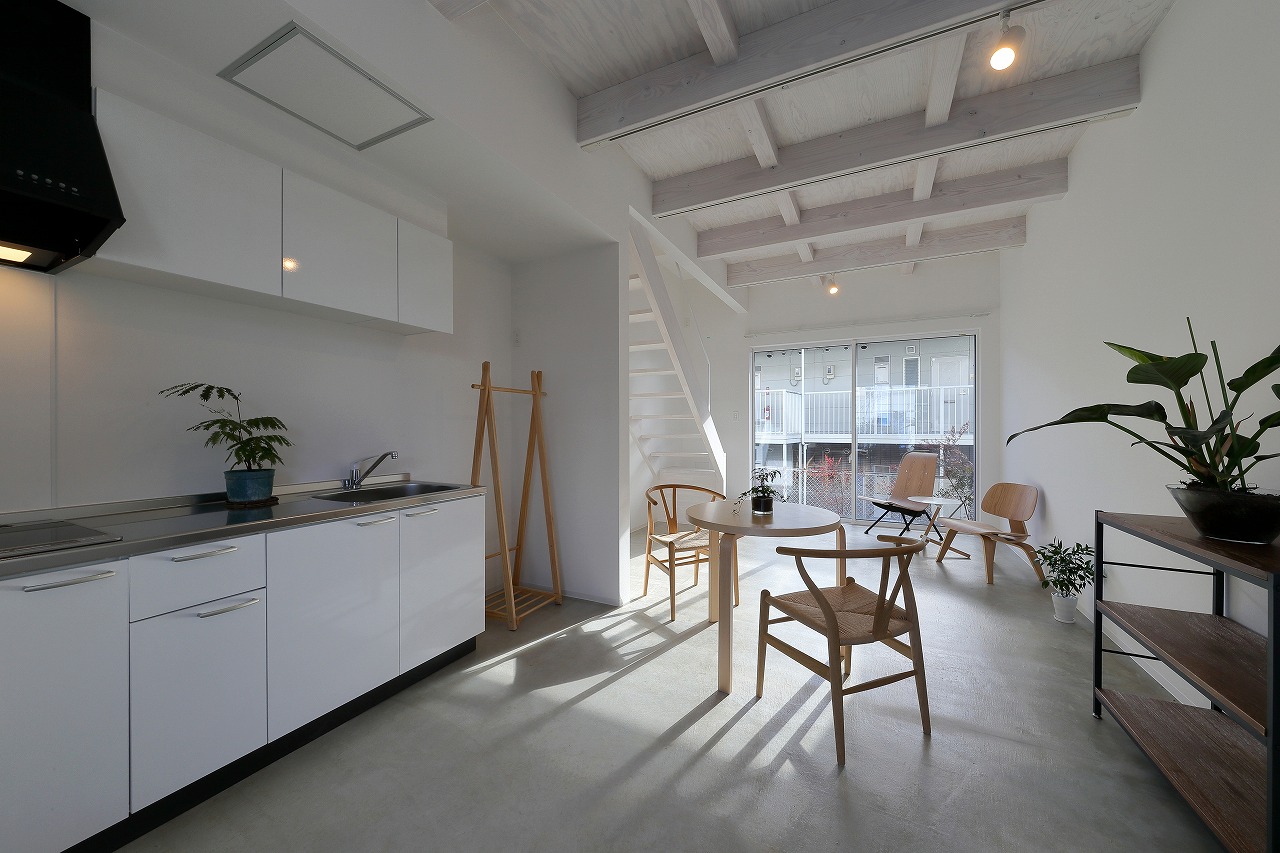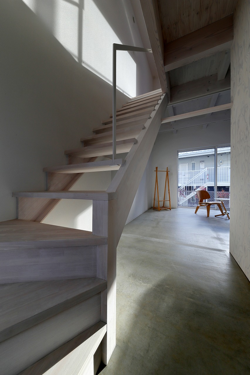 間取りは、「森に開く長屋」と同じものが2つと1階に水回りをまとめた新なプランの3種ある。「森に開く長屋」同様、構造体の梁を表し1階は基礎をそのまま床として利用している。建築コストの削減と共に、建物がもともと持っている素材感を感じることができる。