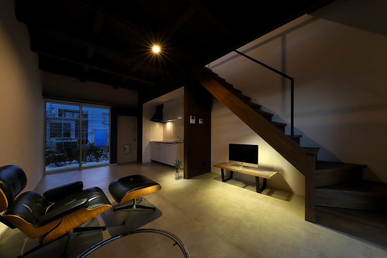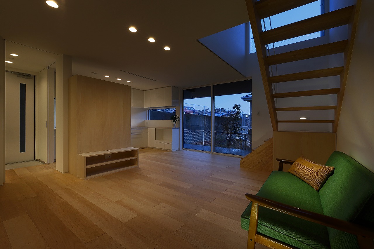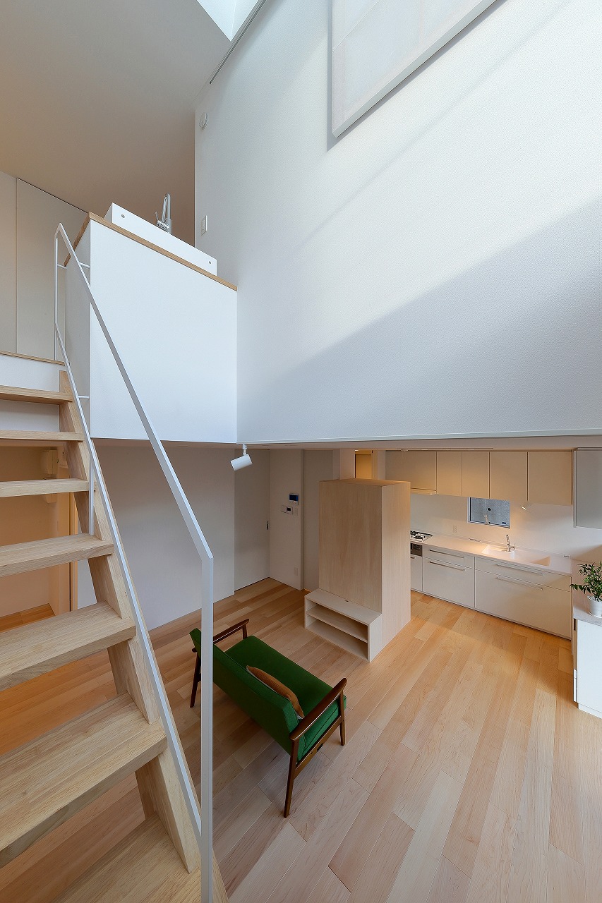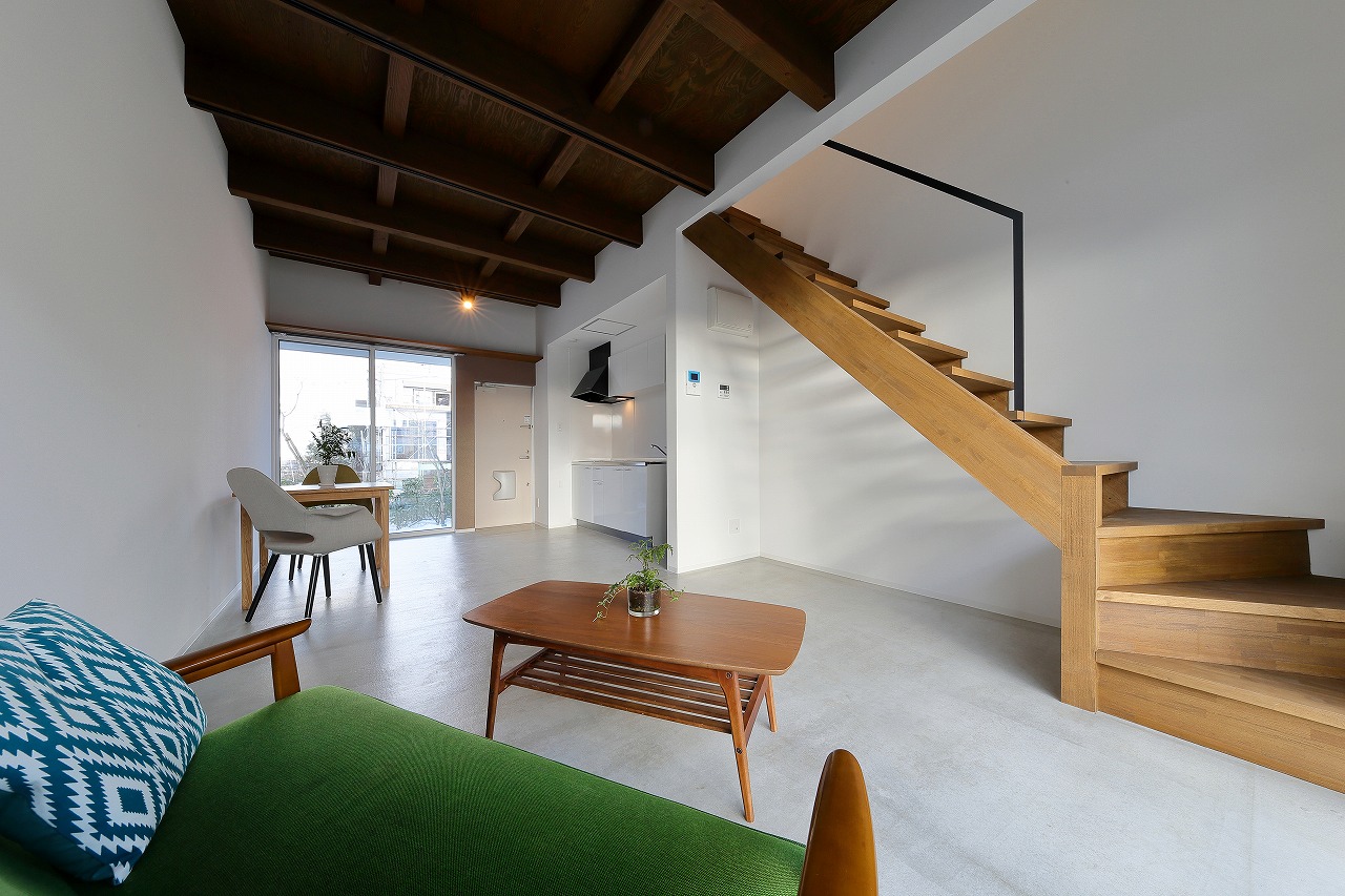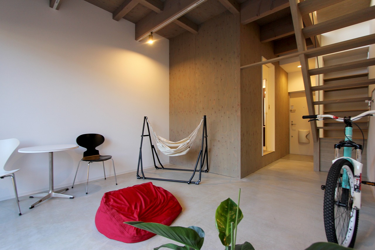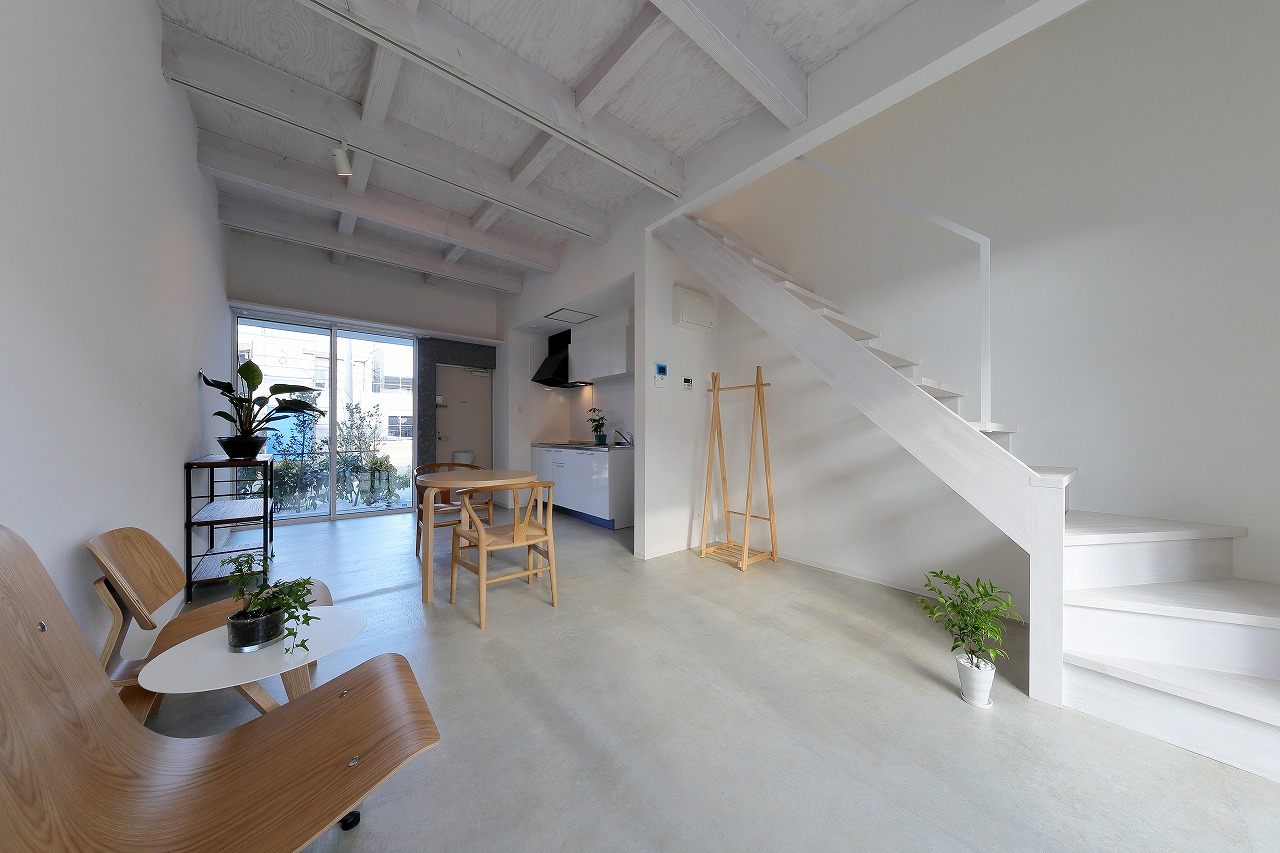 間取りは、「森に開く長屋」と同じものが2つと1階に水回りをまとめた新なプランの3種ある。「森に開く長屋」同様、構造体の梁を表し1階は基礎をそのまま床として利用している。建築コストの削減と共に、建物がもともと持っている素材感を感じることができる。