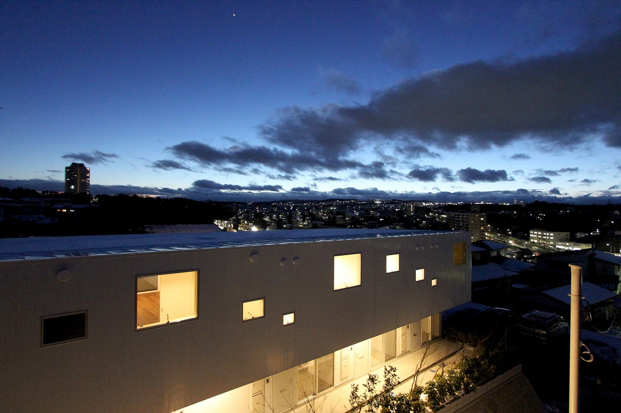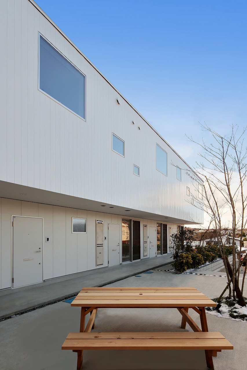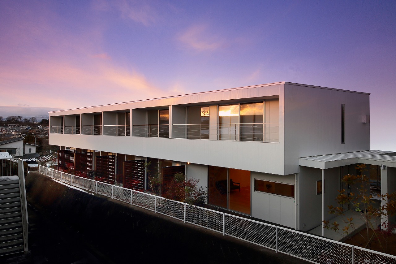 「ROW HOUSE SORA」は、「森に開く長屋」と同時期に計画を行ったが敷地の造成工事完了後に建築工事が始まった。