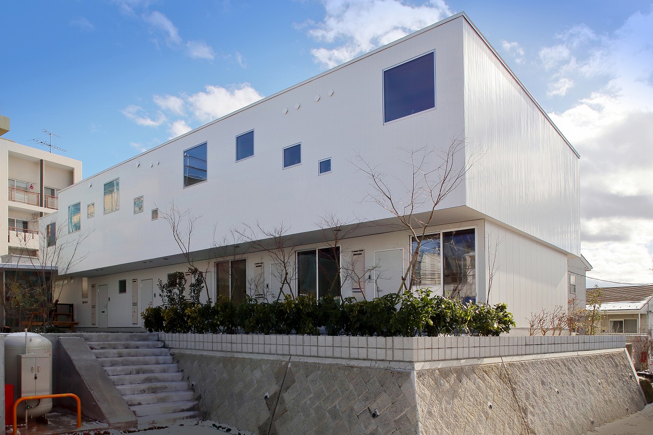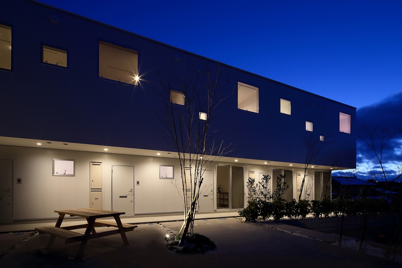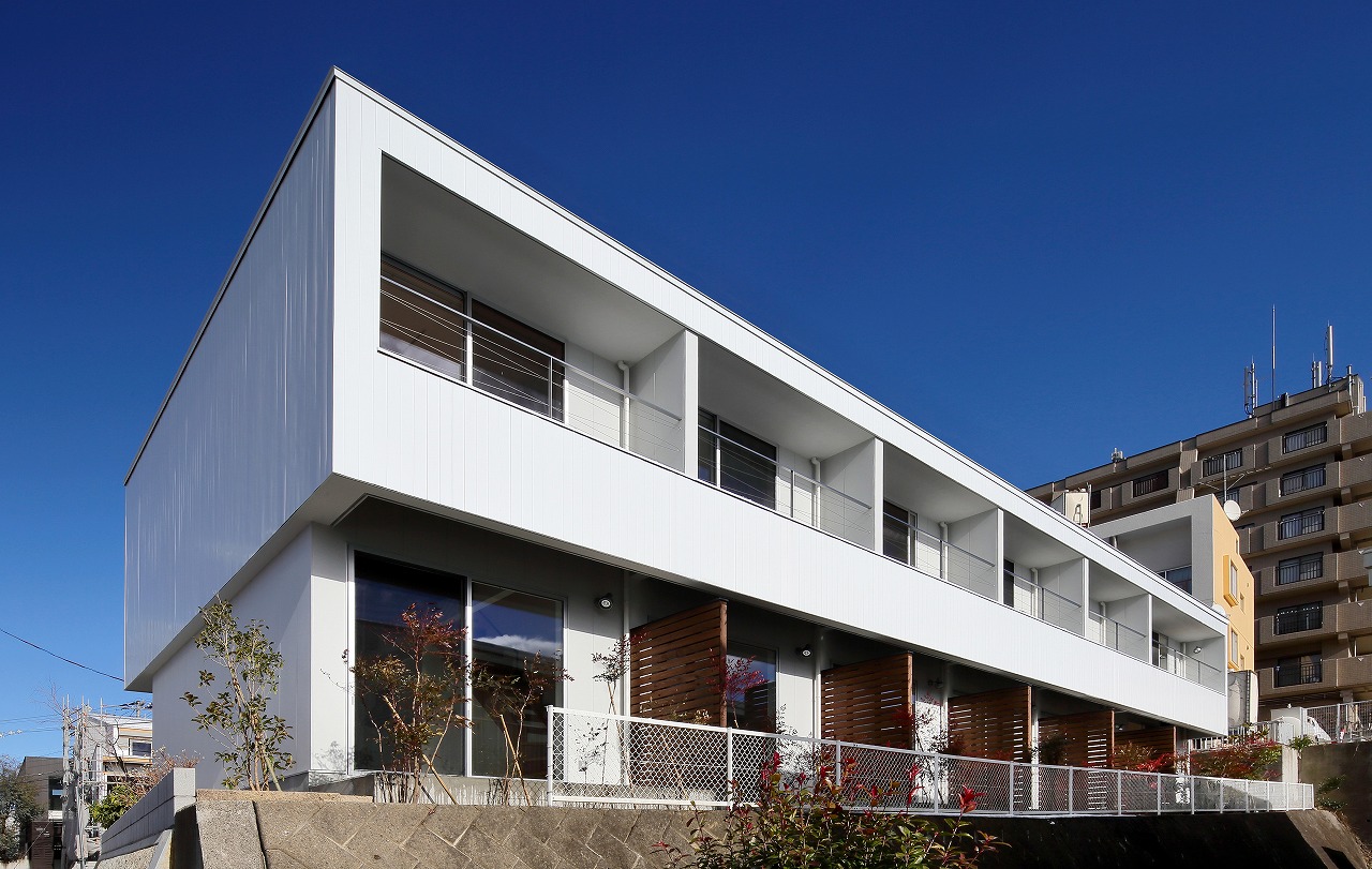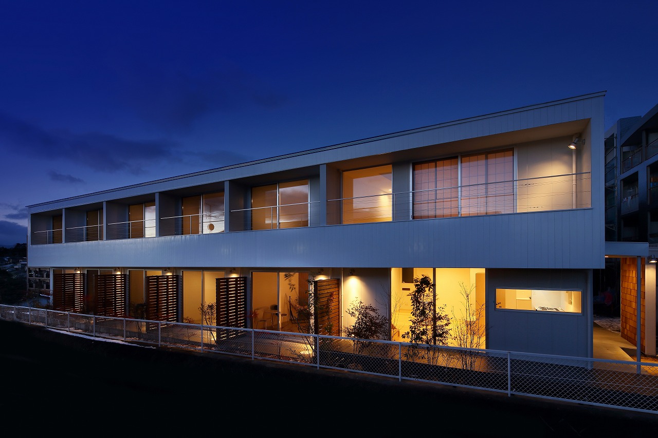 「ROW HOUSE SORA」は、「森に開く長屋」と同時期に計画を行ったが敷地の造成工事完了後に建築工事が始まった。