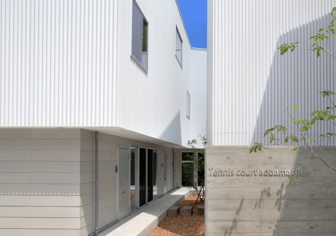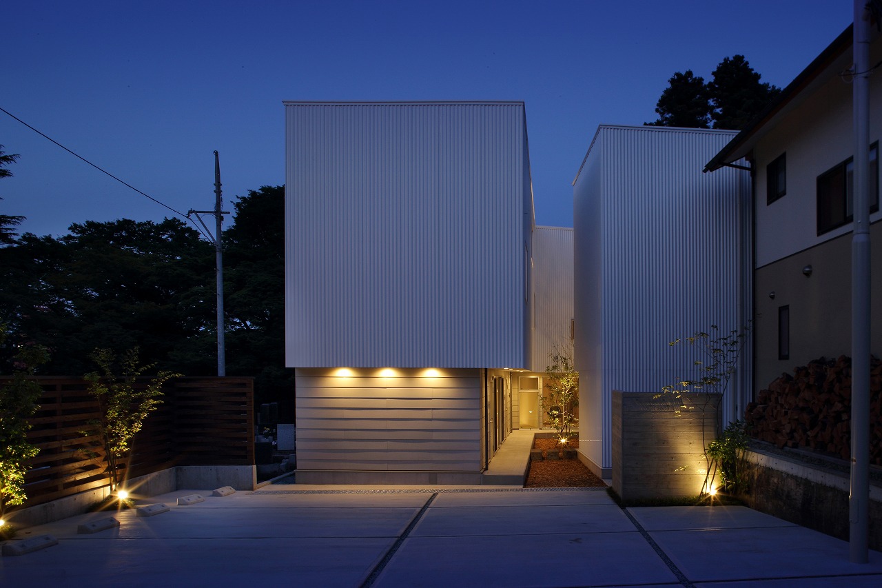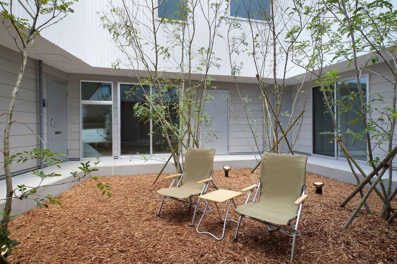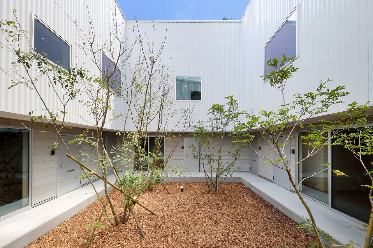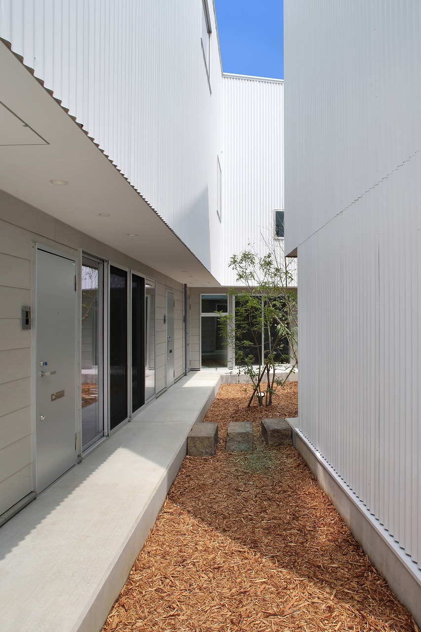 計画地は周囲3方を墓地に囲まれている。賃貸住宅を計画するうえで、不特定の今後入居する方に「お墓の隣に住む」という大きな特徴を受け入れてもらう必要があった。まず、この敷地で最大住戸数と駐車台数を確保できる配置計画を検討する中で、西側に建物を寄せ、南北に2つのボリュームで建てることで、最大数を確保できることがわかった。さらに各住戸の床面積を広く確保するため、敷地形状に合わせた建物形状とすることでG型のような中庭を有する建物とした。中庭を有することで、外の墓地側に開かず中庭側に開くことができ、隣地の墓地を感じることなく生活ができるものを考えた。また2階の吹き抜けに面したハイサイドライトから南の採光が全室に得られる作りとなっている。