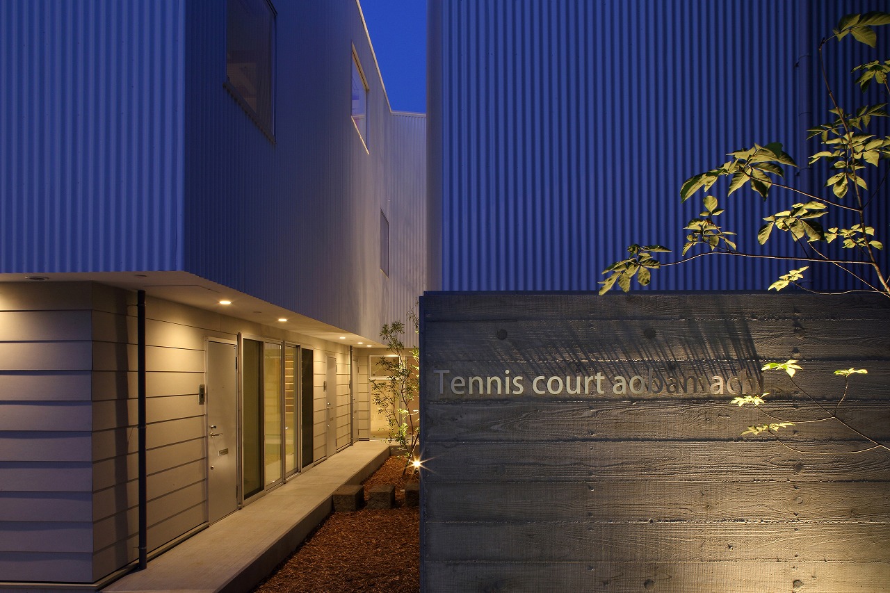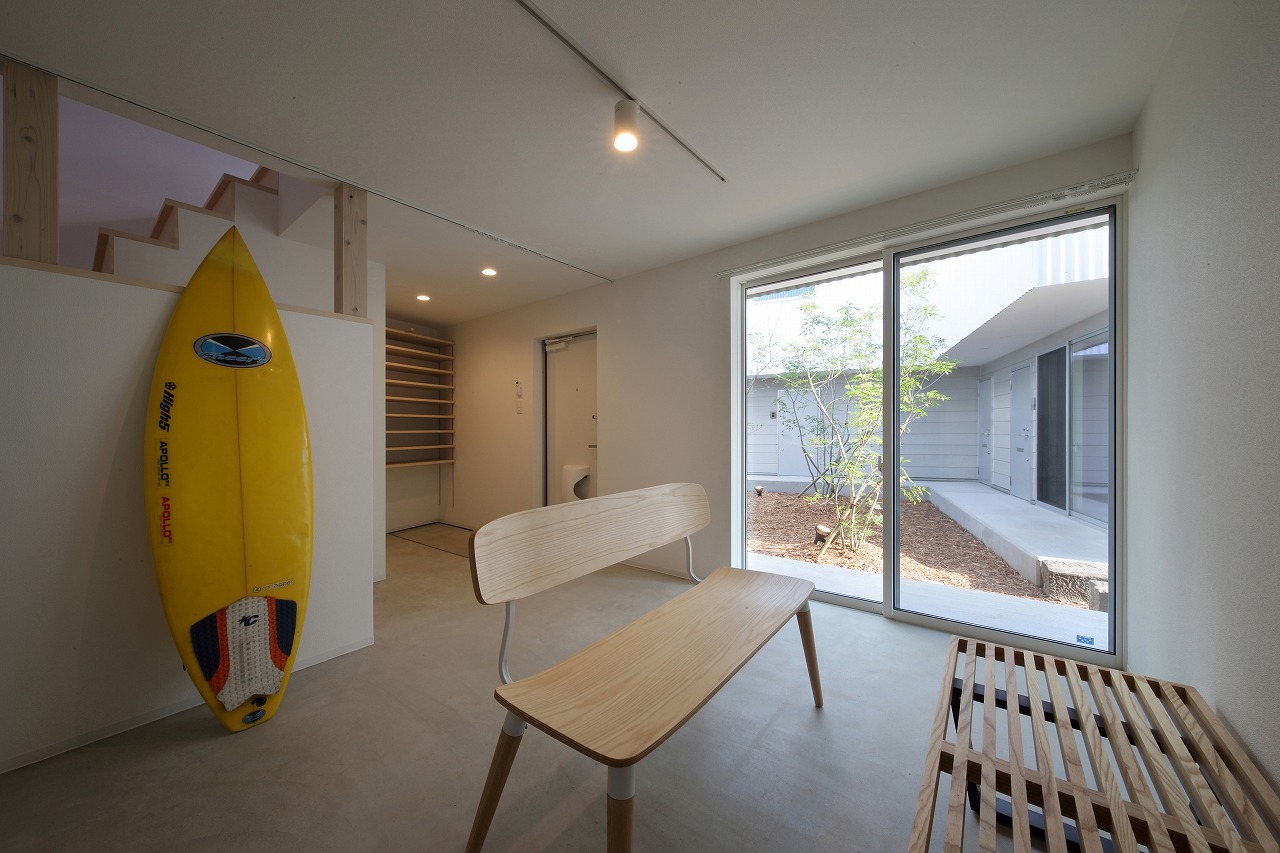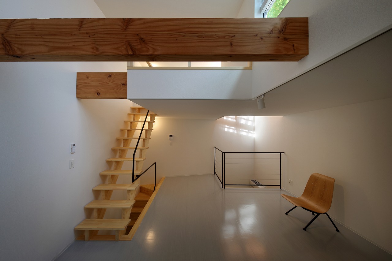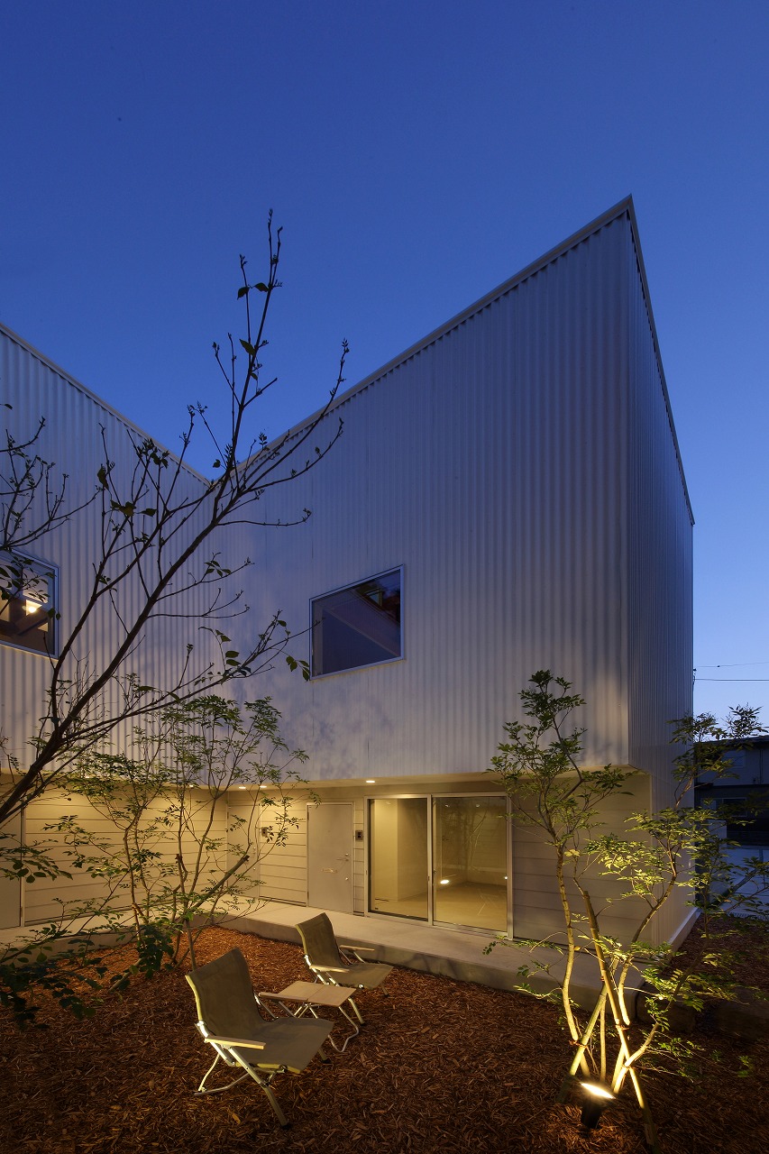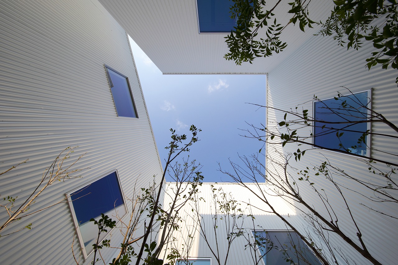 計画地は周囲3方を墓地に囲まれている。賃貸住宅を計画するうえで、不特定の今後入居する方に「お墓の隣に住む」という大きな特徴を受け入れてもらう必要があった。まず、この敷地で最大住戸数と駐車台数を確保できる配置計画を検討する中で、西側に建物を寄せ、南北に2つのボリュームで建てることで、最大数を確保できることがわかった。さらに各住戸の床面積を広く確保するため、敷地形状に合わせた建物形状とすることでG型のような中庭を有する建物とした。中庭を有することで、外の墓地側に開かず中庭側に開くことができ、隣地の墓地を感じることなく生活ができるものを考えた。また2階の吹き抜けに面したハイサイドライトから南の採光が全室に得られる作りとなっている。