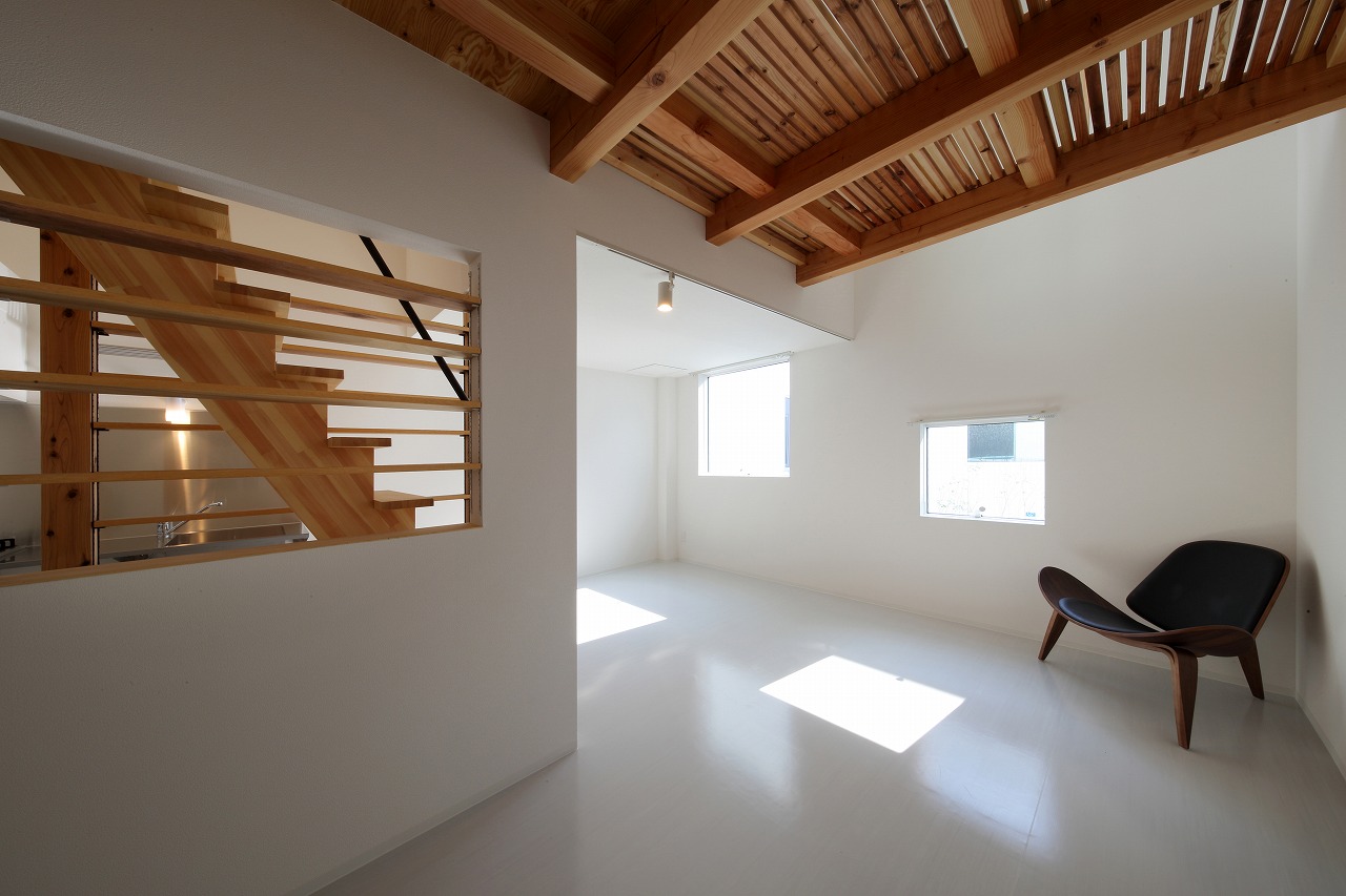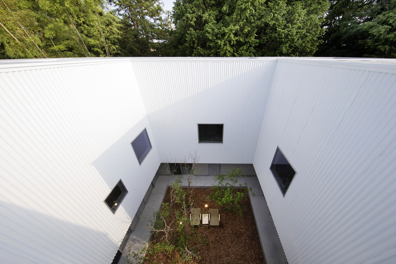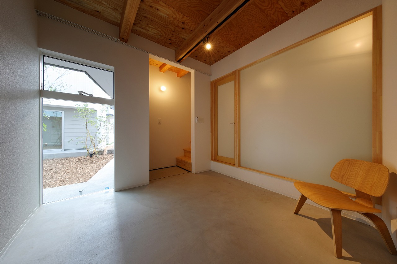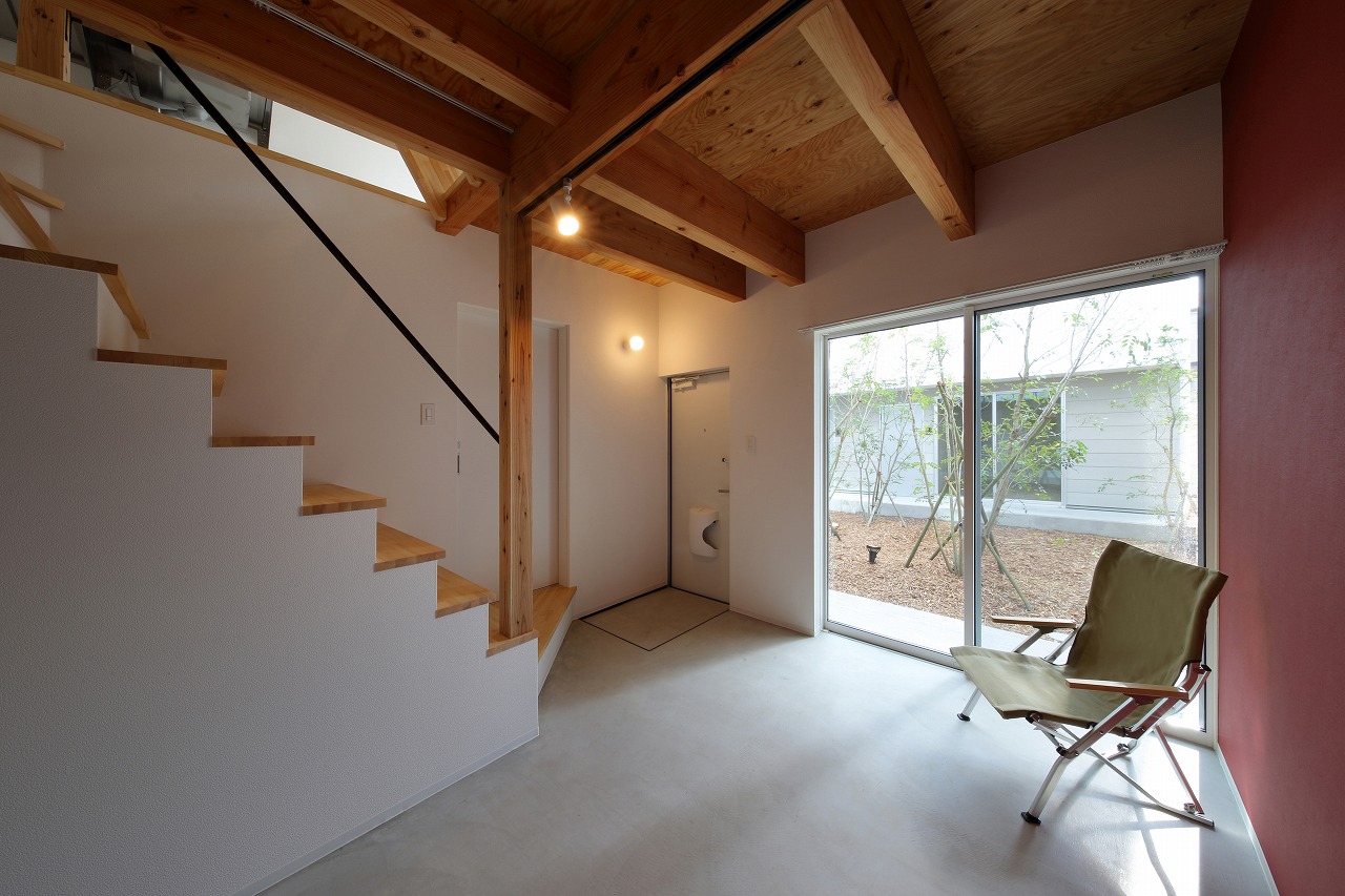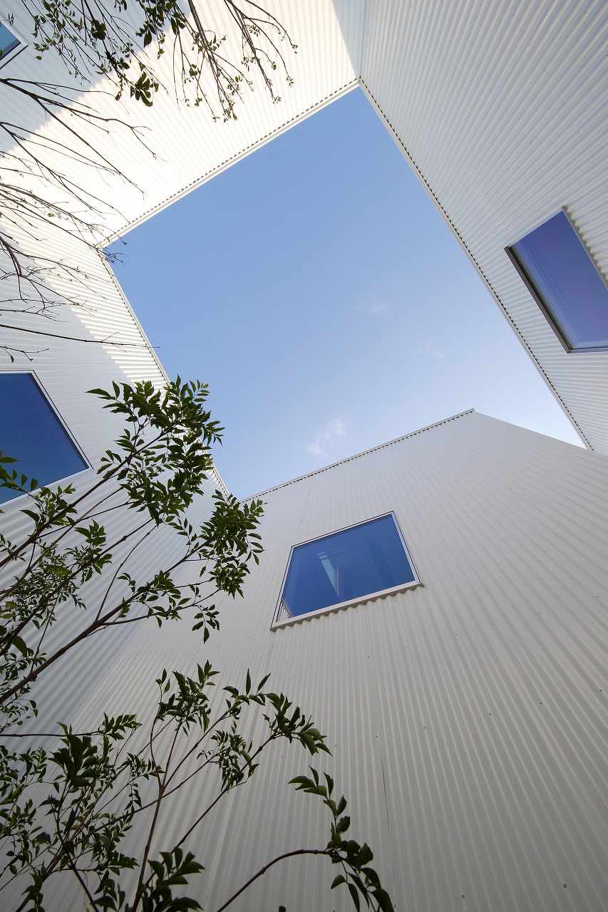 計画地は周囲3方を墓地に囲まれている。賃貸住宅を計画するうえで、不特定の今後入居する方に「お墓の隣に住む」という大きな特徴を受け入れてもらう必要があった。まず、この敷地で最大住戸数と駐車台数を確保できる配置計画を検討する中で、西側に建物を寄せ、南北に2つのボリュームで建てることで、最大数を確保できることがわかった。さらに各住戸の床面積を広く確保するため、敷地形状に合わせた建物形状とすることでG型のような中庭を有する建物とした。中庭を有することで、外の墓地側に開かず中庭側に開くことができ、隣地の墓地を感じることなく生活ができるものを考えた。また2階の吹き抜けに面したハイサイドライトから南の採光が全室に得られる作りとなっている。