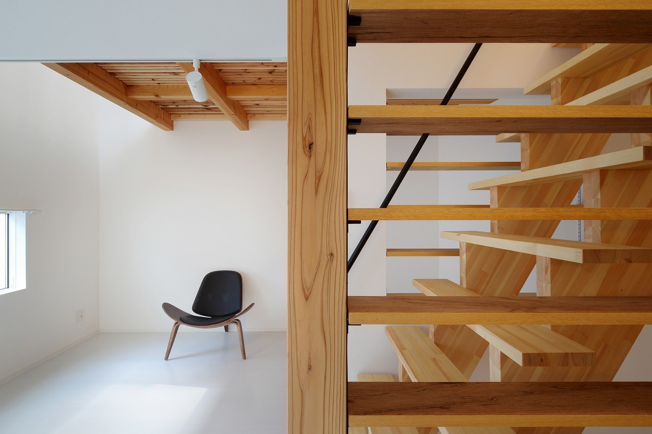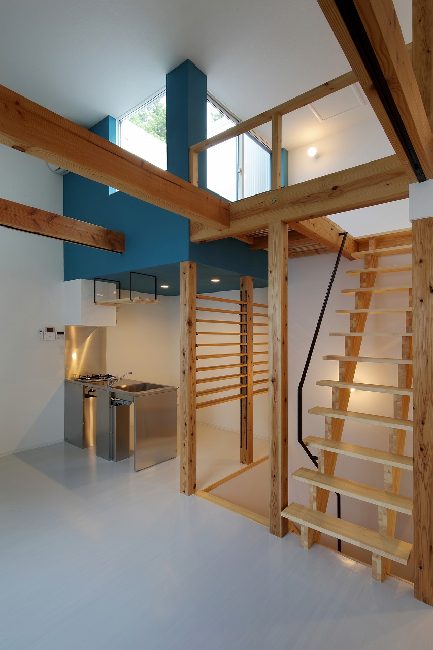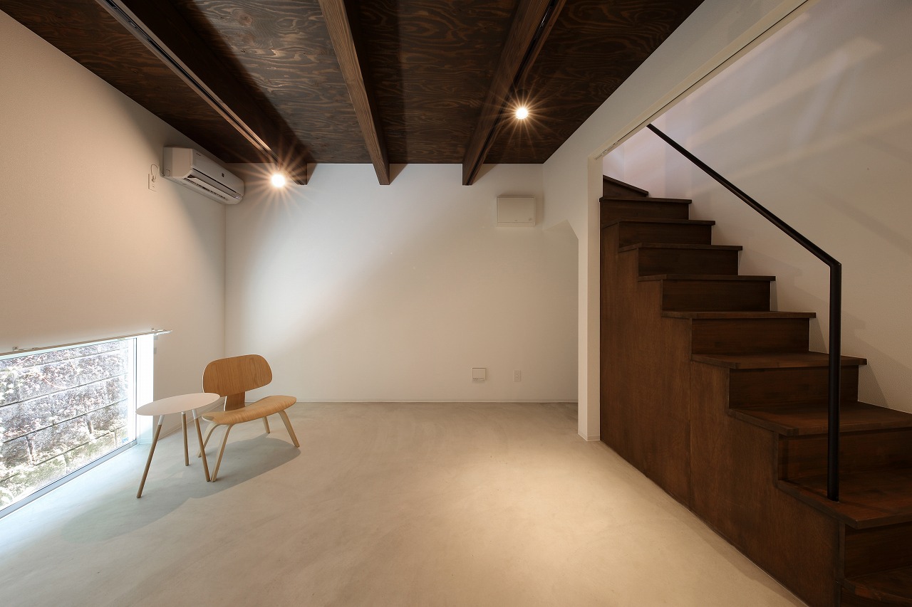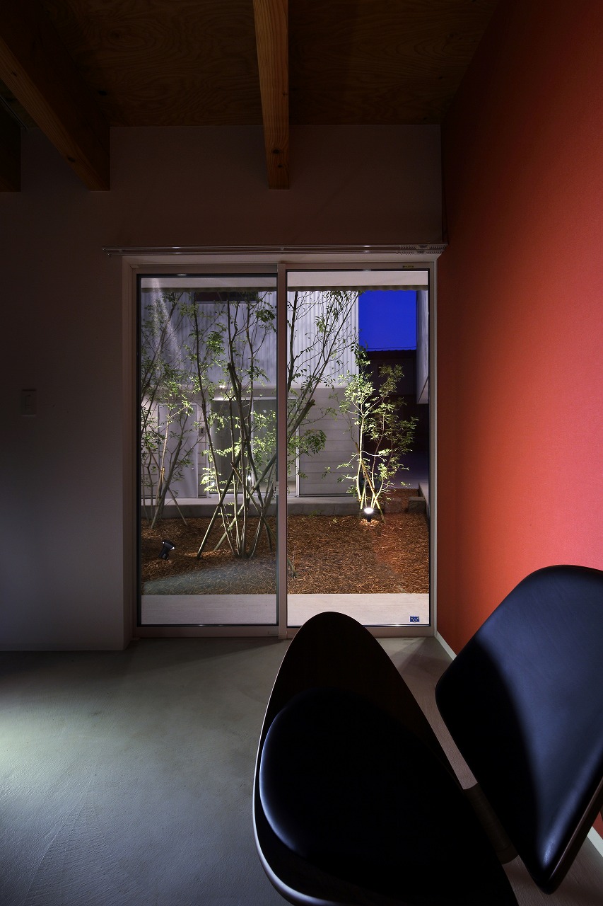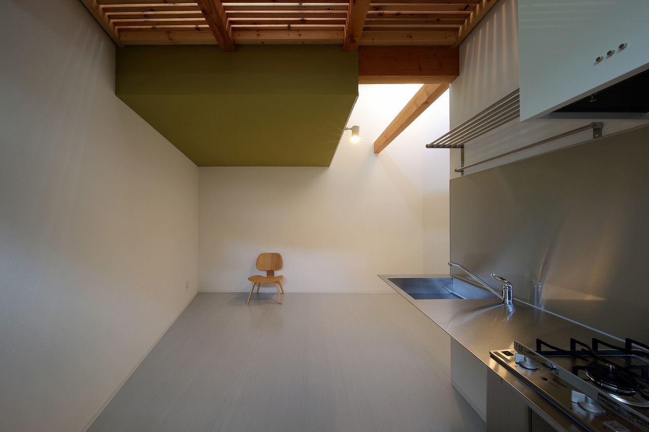 計画地は周囲3方を墓地に囲まれている。賃貸住宅を計画するうえで、不特定の今後入居する方に「お墓の隣に住む」という大きな特徴を受け入れてもらう必要があった。まず、この敷地で最大住戸数と駐車台数を確保できる配置計画を検討する中で、西側に建物を寄せ、南北に2つのボリュームで建てることで、最大数を確保できることがわかった。さらに各住戸の床面積を広く確保するため、敷地形状に合わせた建物形状とすることでG型のような中庭を有する建物とした。中庭を有することで、外の墓地側に開かず中庭側に開くことができ、隣地の墓地を感じることなく生活ができるものを考えた。また2階の吹き抜けに面したハイサイドライトから南の採光が全室に得られる作りとなっている。