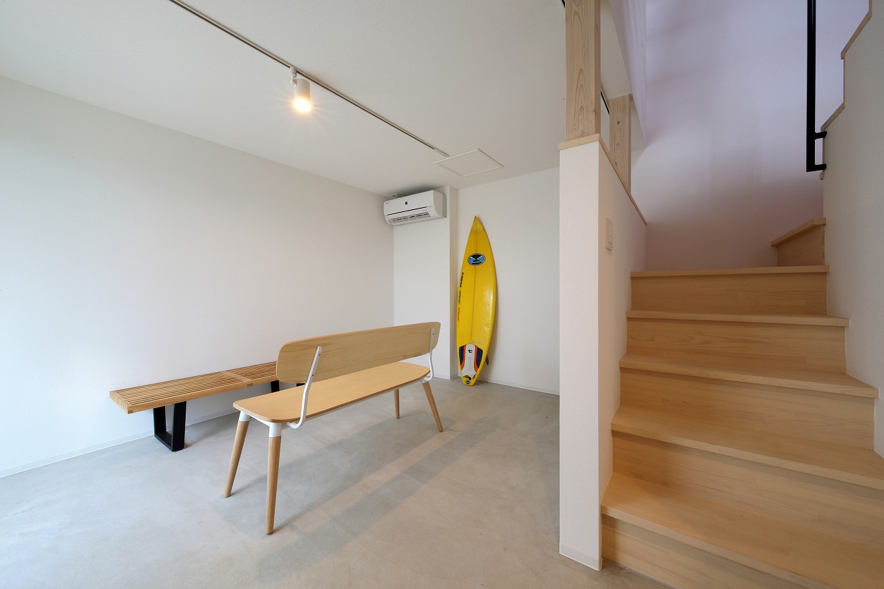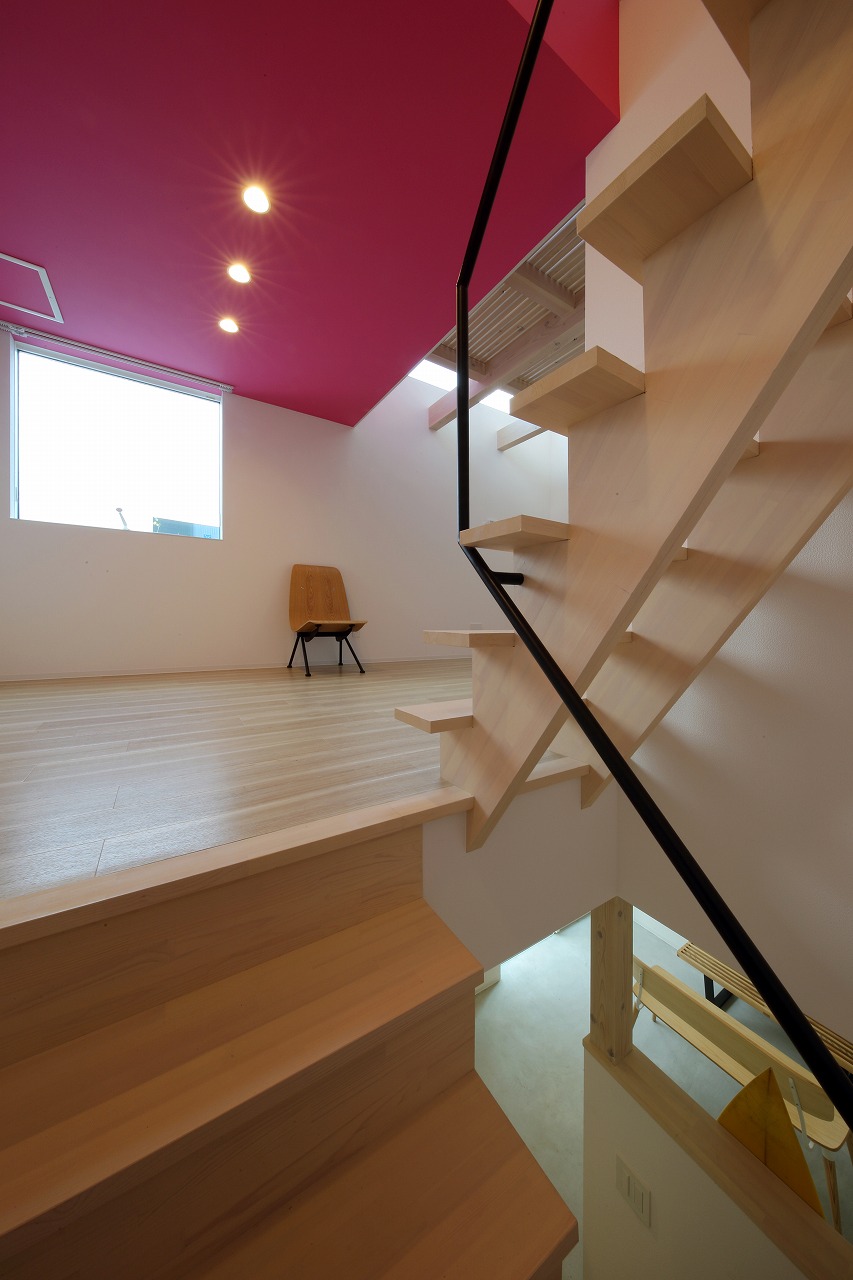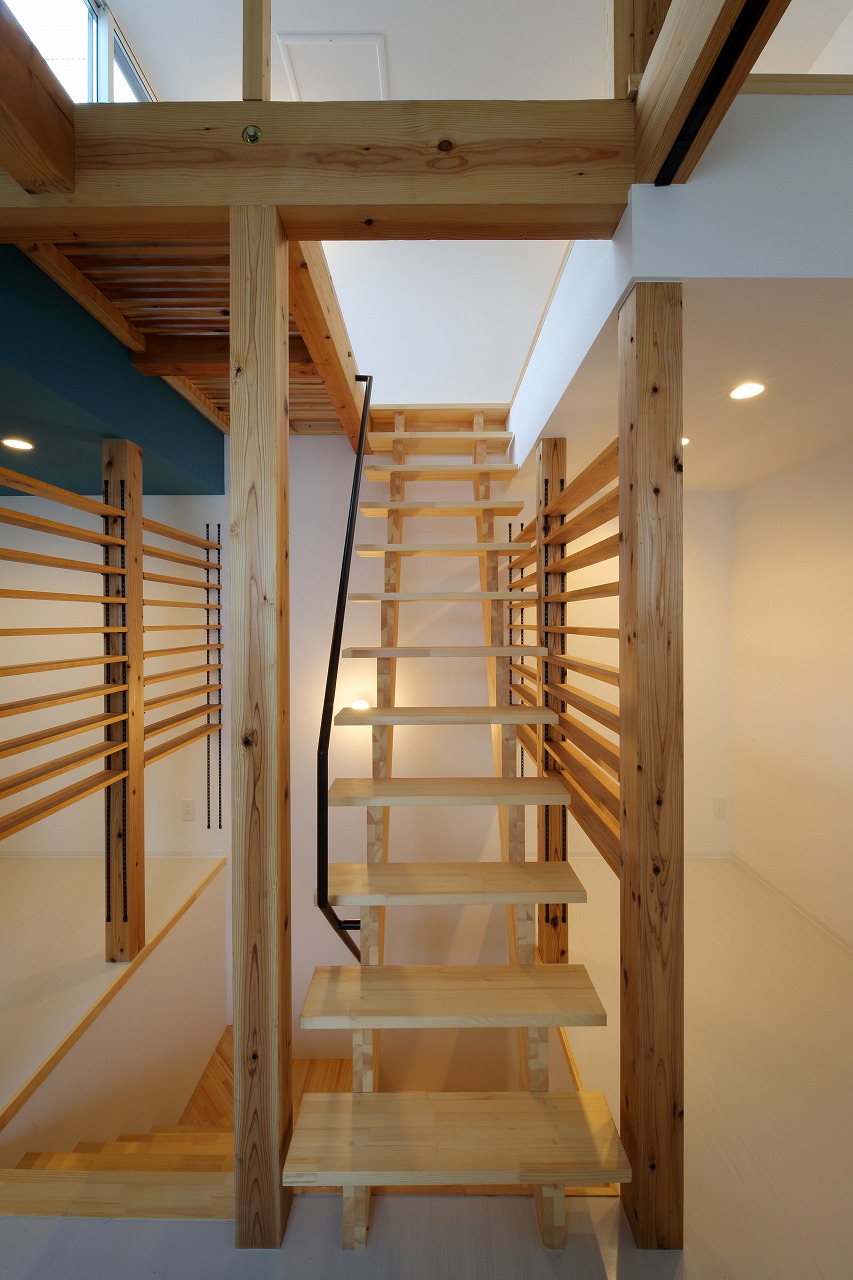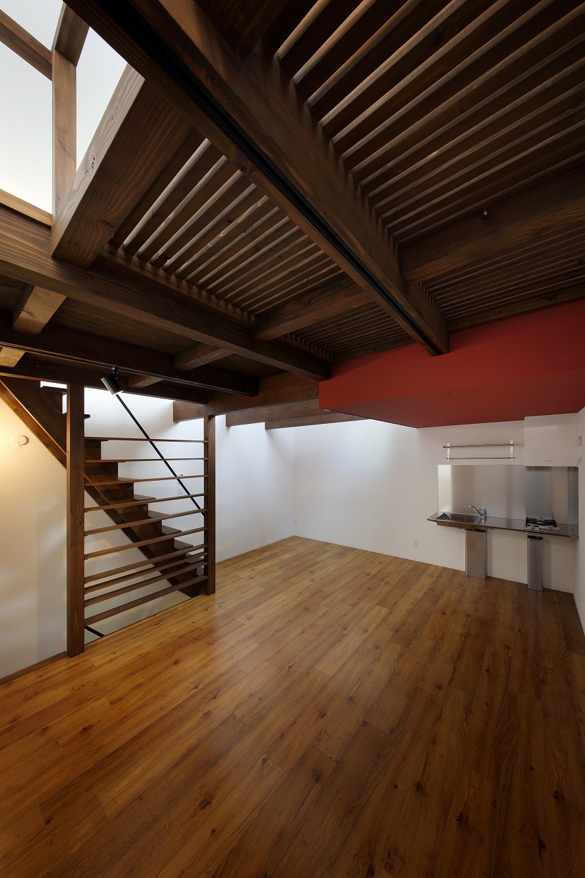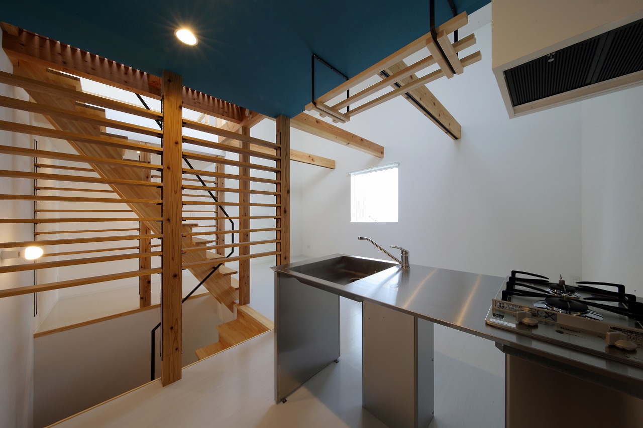 計画地は周囲3方を墓地に囲まれている。賃貸住宅を計画するうえで、不特定の今後入居する方に「お墓の隣に住む」という大きな特徴を受け入れてもらう必要があった。まず、この敷地で最大住戸数と駐車台数を確保できる配置計画を検討する中で、西側に建物を寄せ、南北に2つのボリュームで建てることで、最大数を確保できることがわかった。さらに各住戸の床面積を広く確保するため、敷地形状に合わせた建物形状とすることでG型のような中庭を有する建物とした。中庭を有することで、外の墓地側に開かず中庭側に開くことができ、隣地の墓地を感じることなく生活ができるものを考えた。また2階の吹き抜けに面したハイサイドライトから南の採光が全室に得られる作りとなっている。