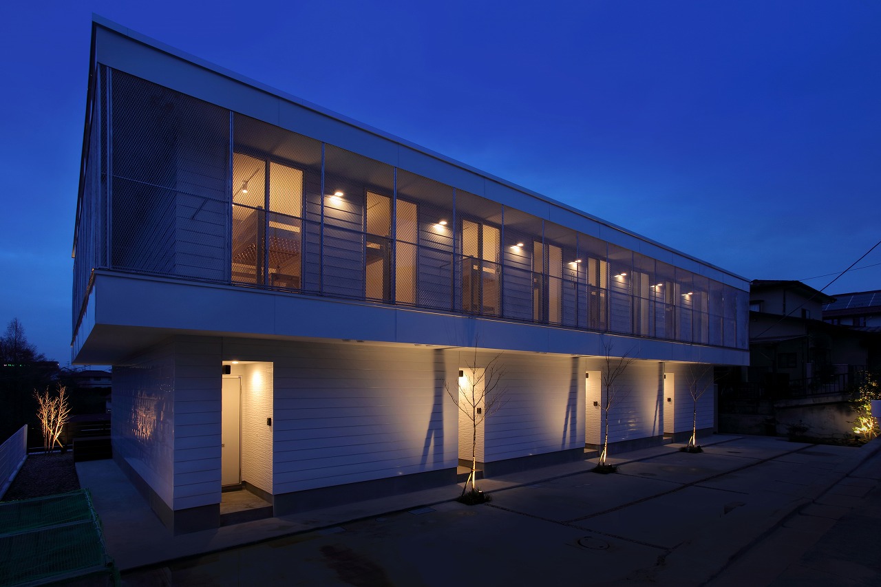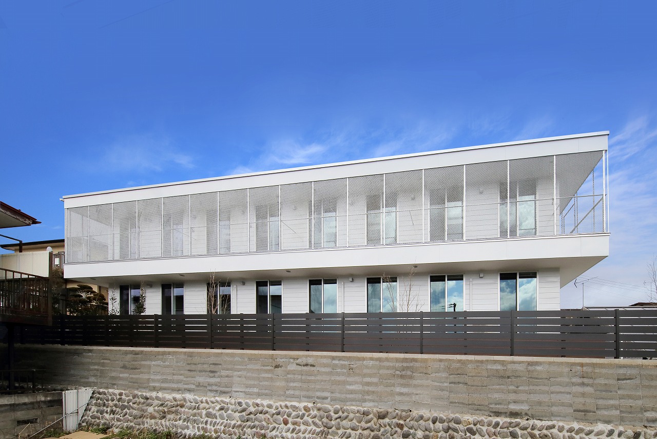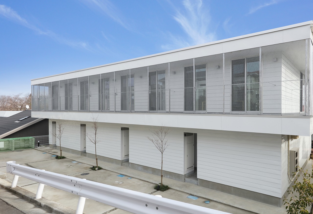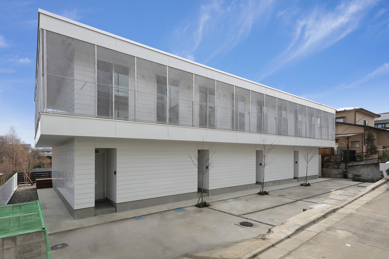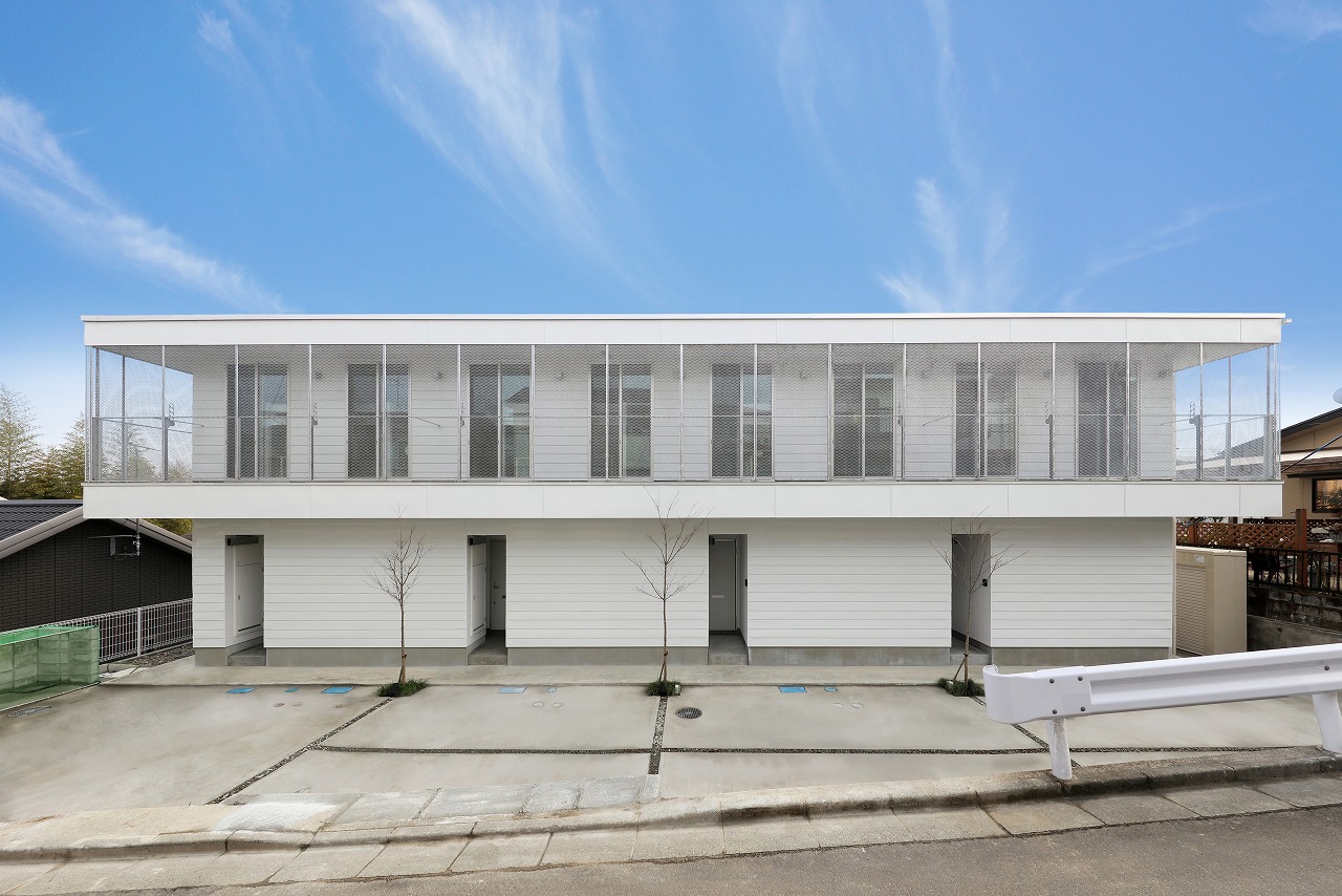 計画地は、仙台市青葉区の閑静な住宅街に位置している。この場所に4LDKの長屋を計画した。敷地は南側と東側に高低差があり、擁壁は玉石であった。そこで建物の安全性を確保するために、玉石擁壁側に土圧が掛かる部分を深基礎とした。建物は住み手が設計の段階から想定できていたこともあり、シェア型の共同住宅として計画した。1階部分は一部天井の構造材をあらわしとした。また、壁面収納にも木を使用することであたたかみのある空間を目指した。2階は明るさが極力均一になるように一部にハト小屋を設け、上部の側窓からの採光を取り入れるように計画した。2階の各部屋は四方を囲むように設けた外部のテラスによりつないでいる。このテラスはエキスパンドメタルで外周部が囲まれている。それにより2階の全ての部屋にプライバシーが確保された私的な外部空間を設けることができた。外部仕上げ材は白系に統一することですっきりとした外観となった。