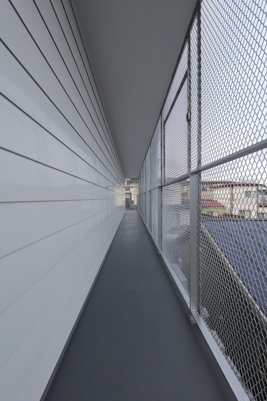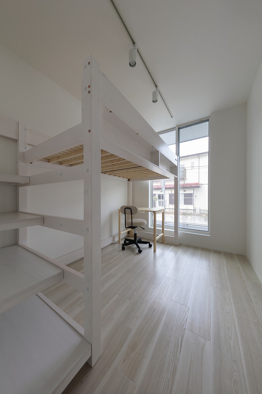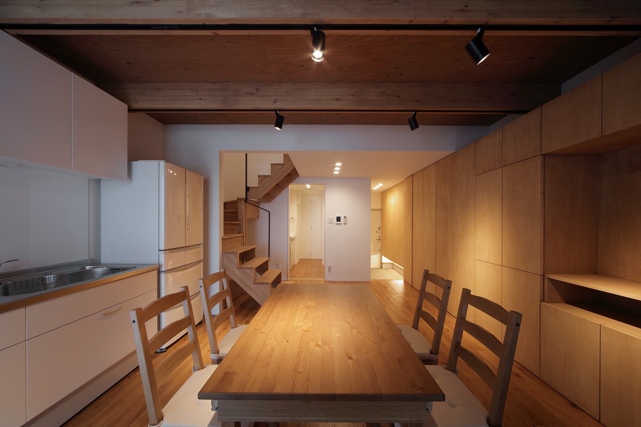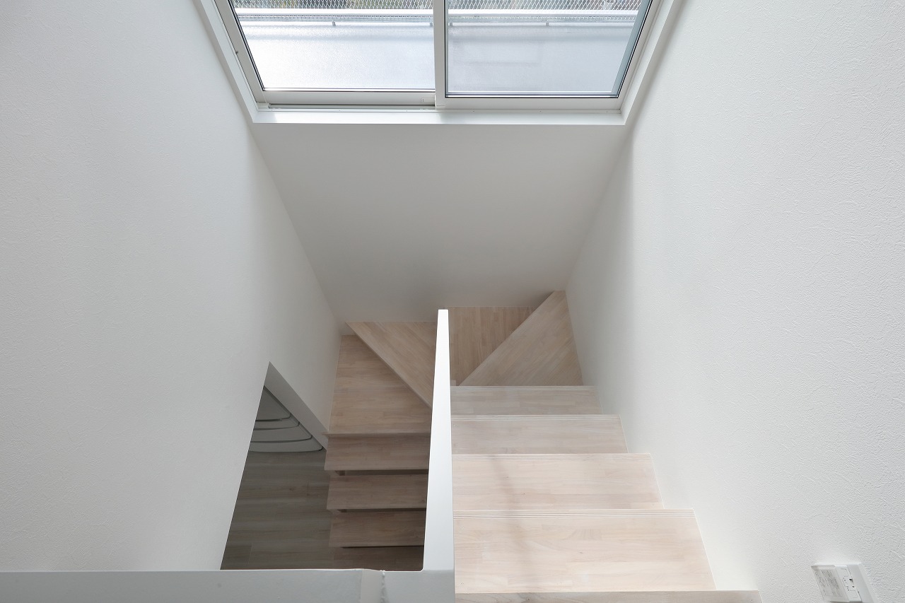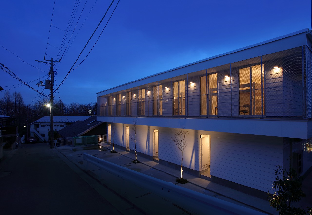 計画地は、仙台市青葉区の閑静な住宅街に位置している。この場所に4LDKの長屋を計画した。敷地は南側と東側に高低差があり、擁壁は玉石であった。そこで建物の安全性を確保するために、玉石擁壁側に土圧が掛かる部分を深基礎とした。建物は住み手が設計の段階から想定できていたこともあり、シェア型の共同住宅として計画した。1階部分は一部天井の構造材をあらわしとした。また、壁面収納にも木を使用することであたたかみのある空間を目指した。2階は明るさが極力均一になるように一部にハト小屋を設け、上部の側窓からの採光を取り入れるように計画した。2階の各部屋は四方を囲むように設けた外部のテラスによりつないでいる。このテラスはエキスパンドメタルで外周部が囲まれている。それにより2階の全ての部屋にプライバシーが確保された私的な外部空間を設けることができた。外部仕上げ材は白系に統一することですっきりとした外観となった。