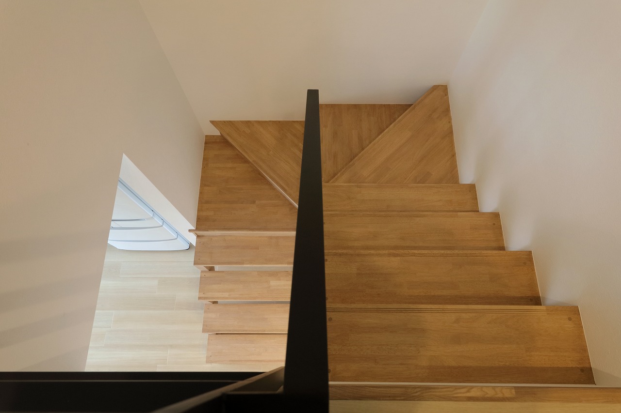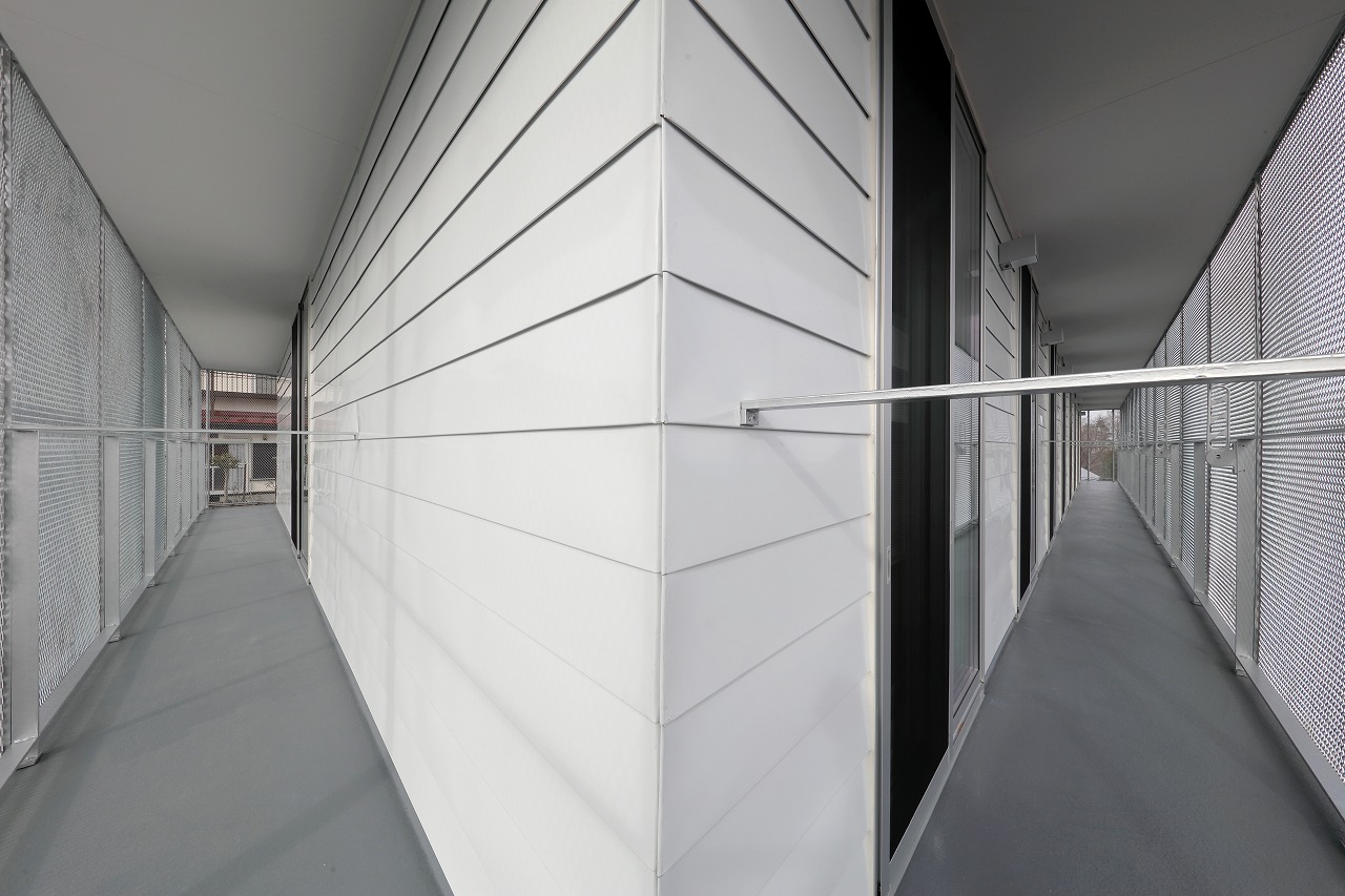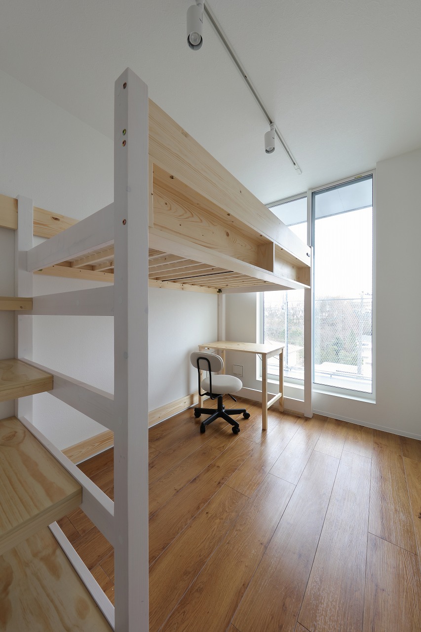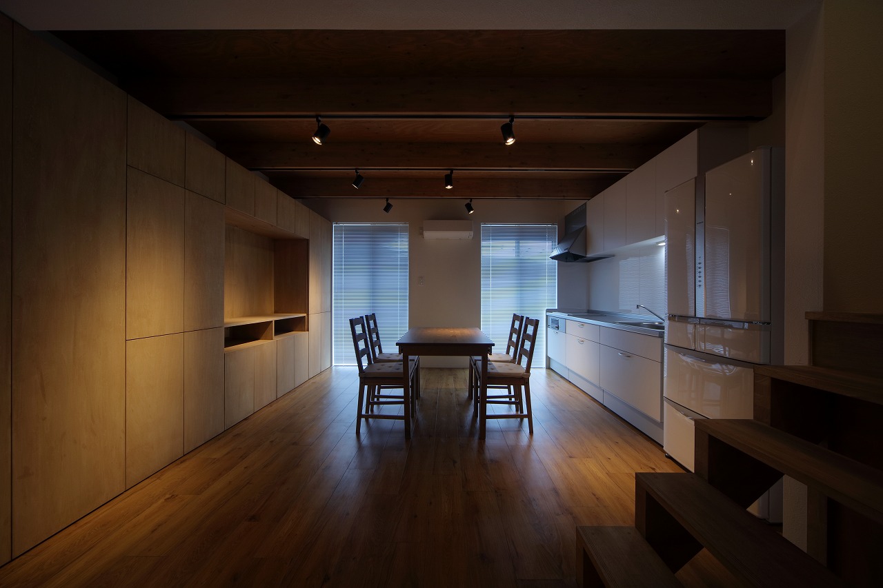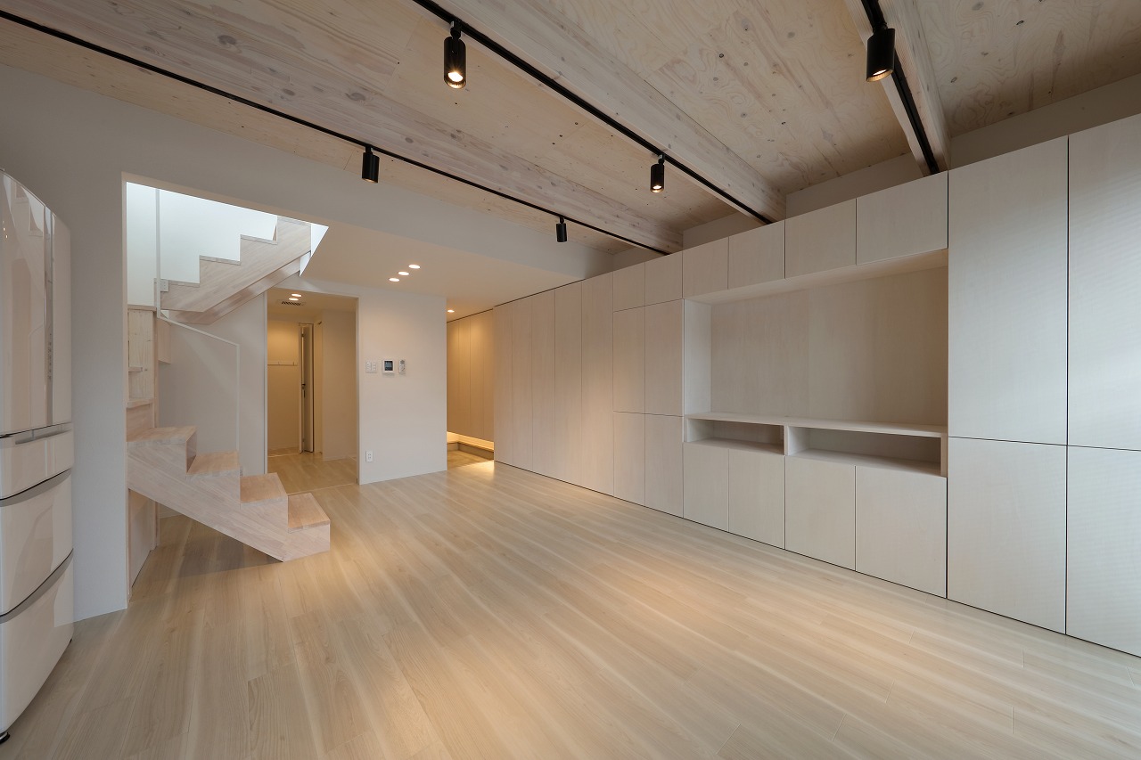 計画地は、仙台市青葉区の閑静な住宅街に位置している。この場所に4LDKの長屋を計画した。敷地は南側と東側に高低差があり、擁壁は玉石であった。そこで建物の安全性を確保するために、玉石擁壁側に土圧が掛かる部分を深基礎とした。建物は住み手が設計の段階から想定できていたこともあり、シェア型の共同住宅として計画した。1階部分は一部天井の構造材をあらわしとした。また、壁面収納にも木を使用することであたたかみのある空間を目指した。2階は明るさが極力均一になるように一部にハト小屋を設け、上部の側窓からの採光を取り入れるように計画した。2階の各部屋は四方を囲むように設けた外部のテラスによりつないでいる。このテラスはエキスパンドメタルで外周部が囲まれている。それにより2階の全ての部屋にプライバシーが確保された私的な外部空間を設けることができた。外部仕上げ材は白系に統一することですっきりとした外観となった。