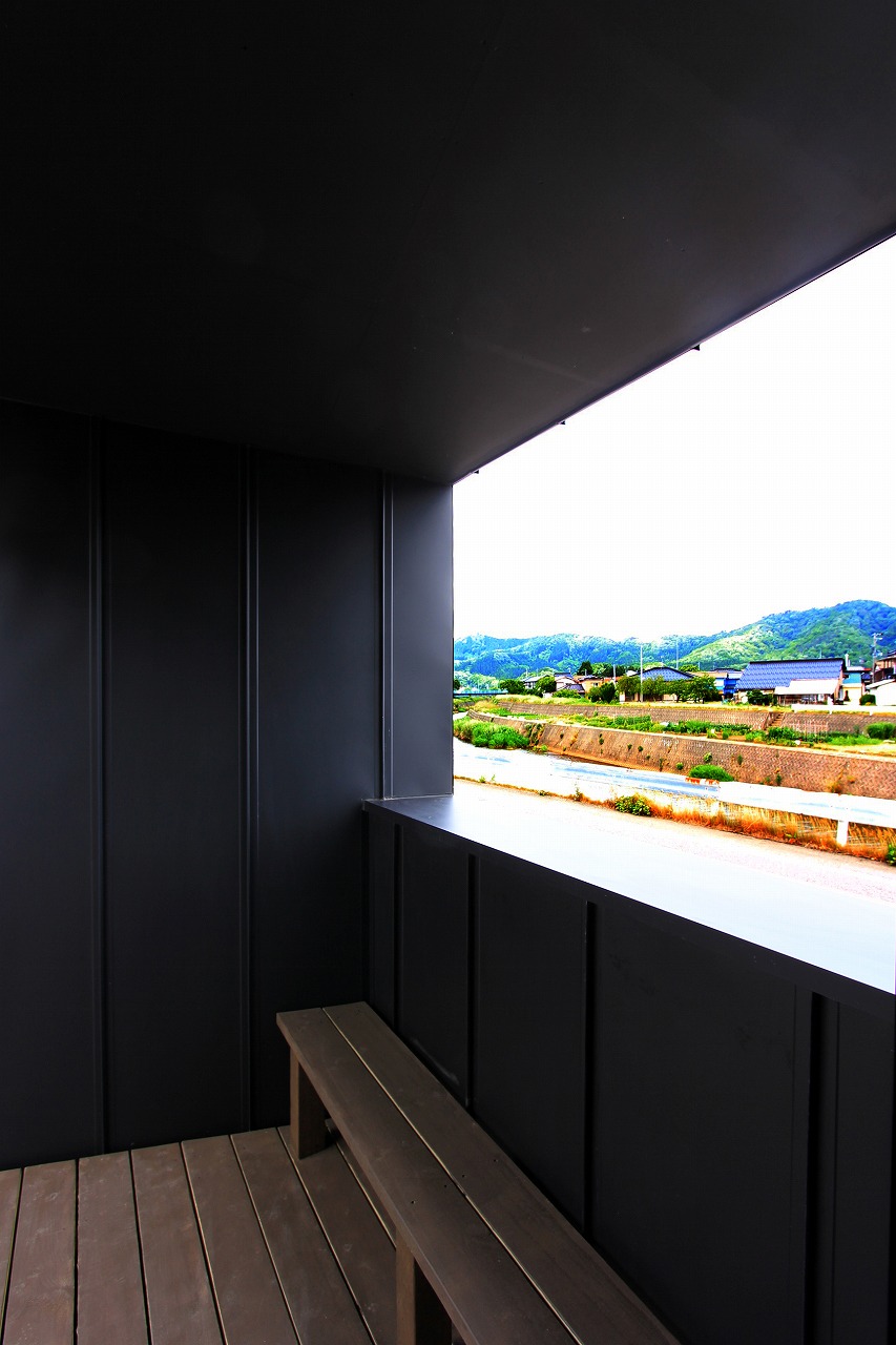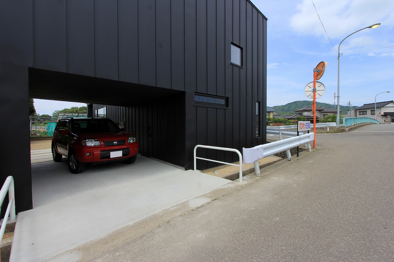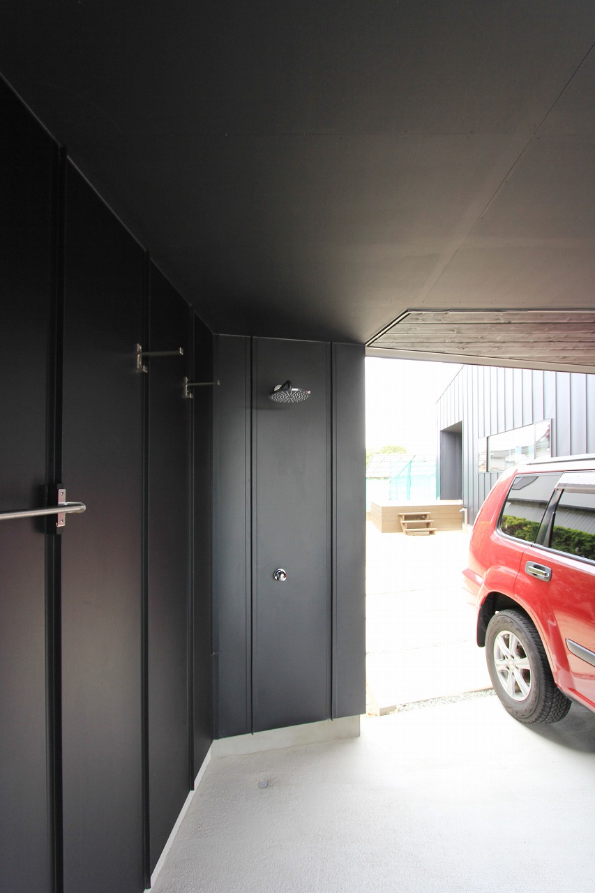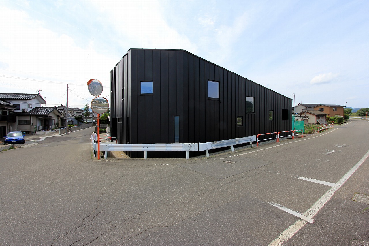 計画地は鶴岡市大山駅にほど近い住宅地の角地にある。敷地の北側にある大山川への景観も期待でき、道路境界との境には堀があり、車の乗り入れも考慮すべき立地条件であった。敷地と道路のレベル差が少ない南西から乗り入れを計画し、インナーガレージを含めて2台分の車スペースを確保。サーフィンをされるとのことでシャワーも完備した。建物形状は敷地形状に合わせて計画し、敷地いっぱいに設計することで庭のスペースを確保した。不整形な建物は建物内外において独特な印象をもたらしている。