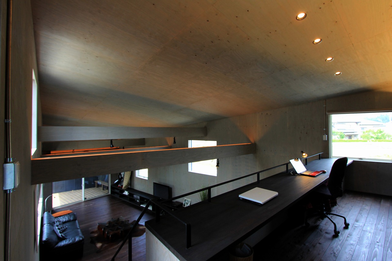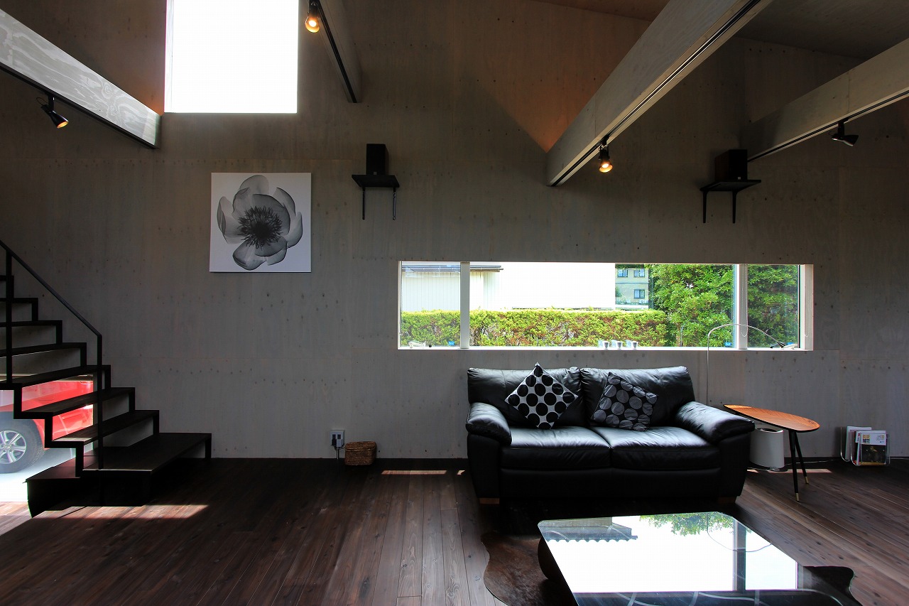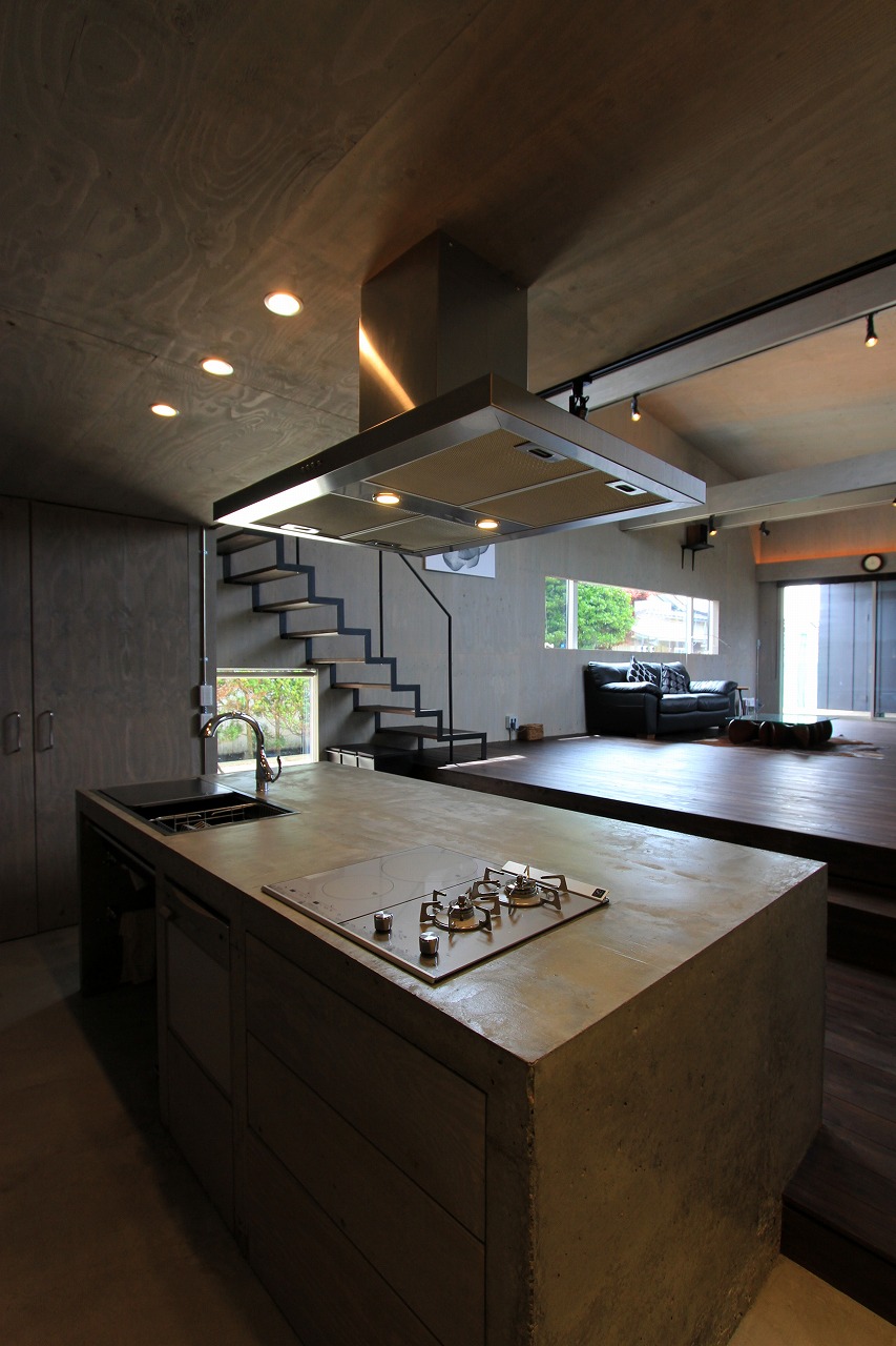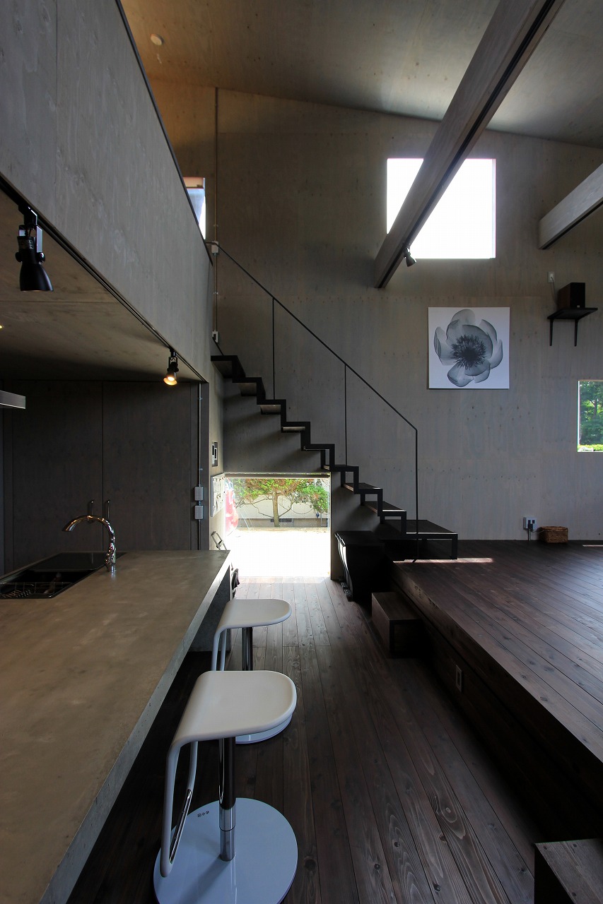 内部はもともとコンクリートの仕上げを希望だったこともあり、床をコンクリート、壁・天井をラーチ合板を塗装することでコンクリート造のような雰囲気を醸し出している。キッチンもコンクリートで製作し、照明計画と合わせてモノトーンで落ち着いた空間を創出できた。リビングは天井の高い吹き抜け空間となっており、リビングアクセスの鉄骨階段で2階へアクセス。2階はプライベートスペースとし、家族共有のスタディコーナーからは吹き抜けを介して家族の気配がつながるような計画としている。