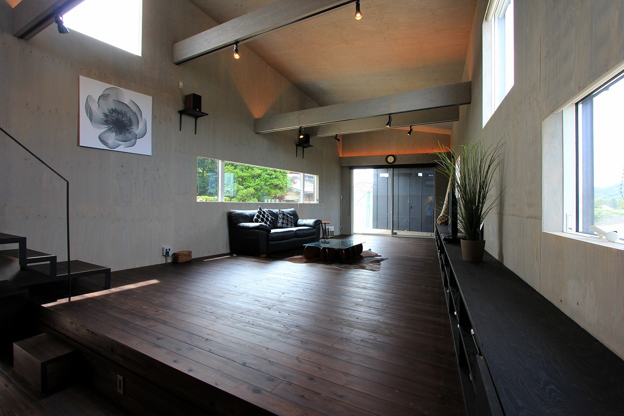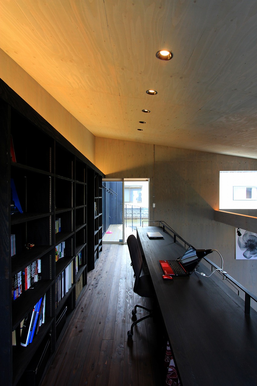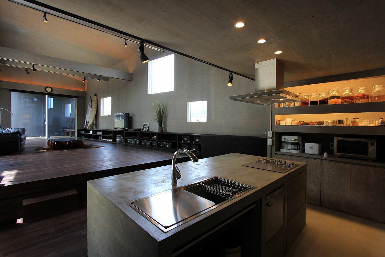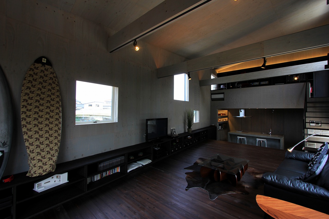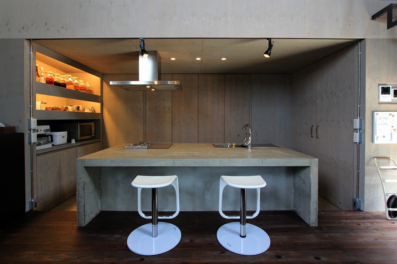 内部はもともとコンクリートの仕上げを希望だったこともあり、床をコンクリート、壁・天井をラーチ合板を塗装することでコンクリート造のような雰囲気を醸し出している。キッチンもコンクリートで製作し、照明計画と合わせてモノトーンで落ち着いた空間を創出できた。リビングは天井の高い吹き抜け空間となっており、リビングアクセスの鉄骨階段で2階へアクセス。2階はプライベートスペースとし、家族共有のスタディコーナーからは吹き抜けを介して家族の気配がつながるような計画としている。