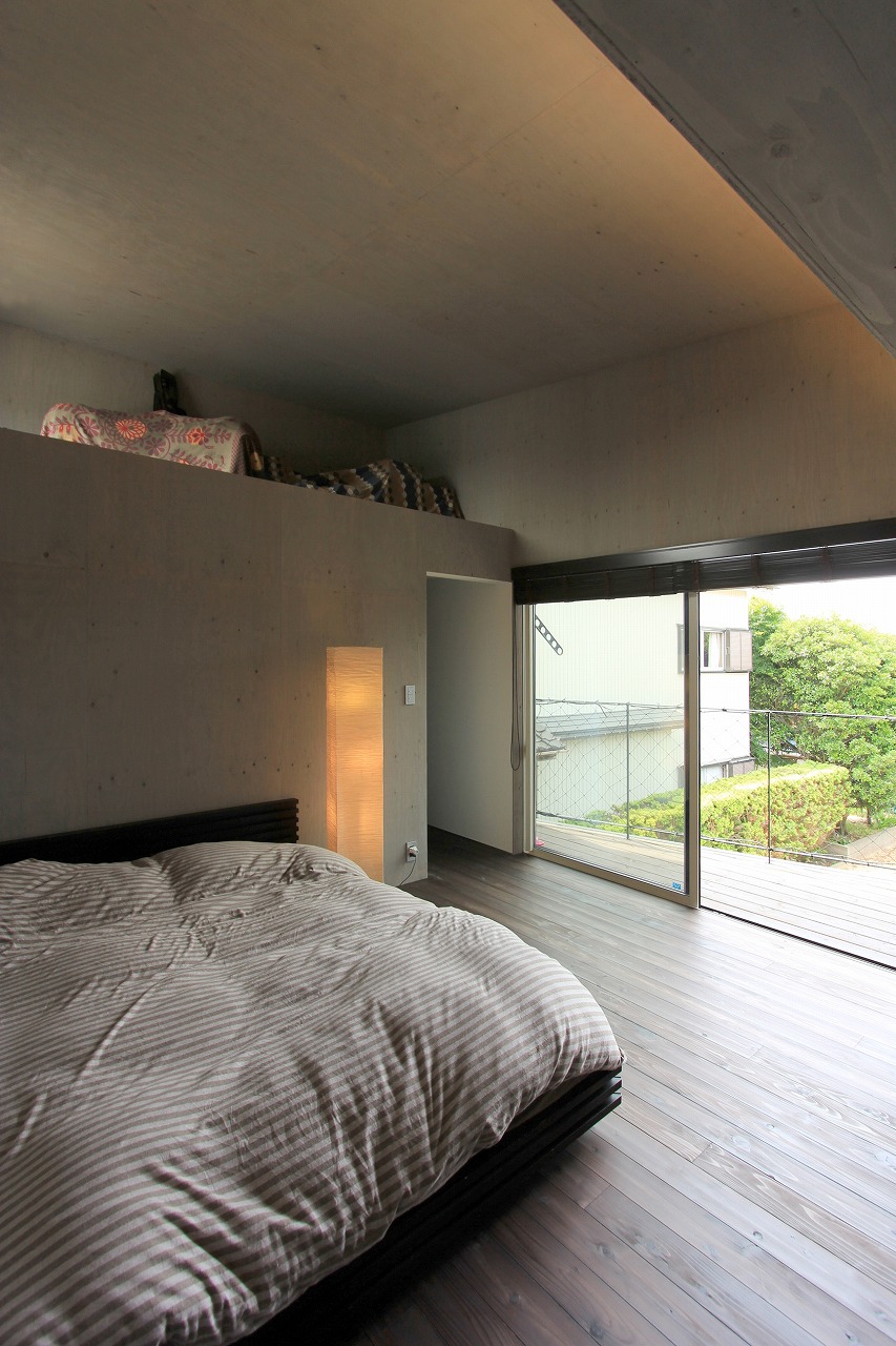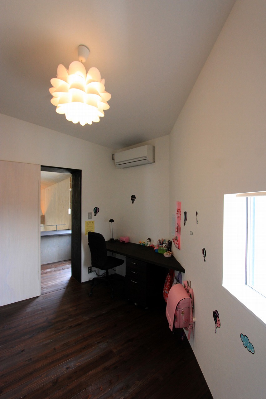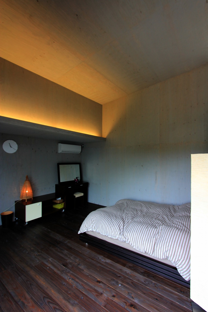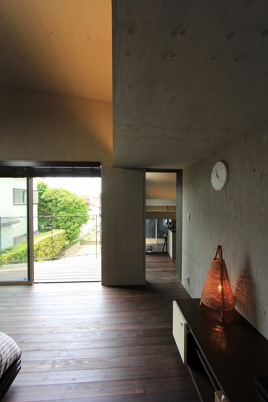 内部はもともとコンクリートの仕上げを希望だったこともあり、床をコンクリート、壁・天井をラーチ合板を塗装することでコンクリート造のような雰囲気を醸し出している。キッチンもコンクリートで製作し、照明計画と合わせてモノトーンで落ち着いた空間を創出できた。リビングは天井の高い吹き抜け空間となっており、リビングアクセスの鉄骨階段で2階へアクセス。2階はプライベートスペースとし、家族共有のスタディコーナーからは吹き抜けを介して家族の気配がつながるような計画としている。