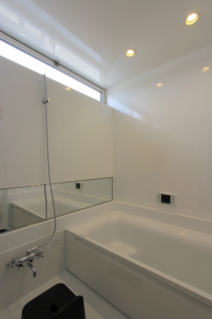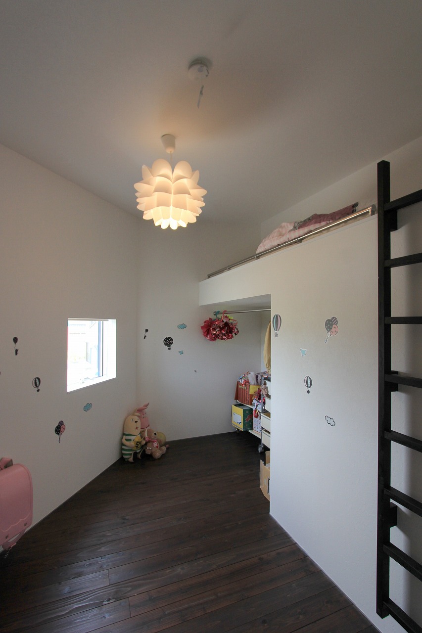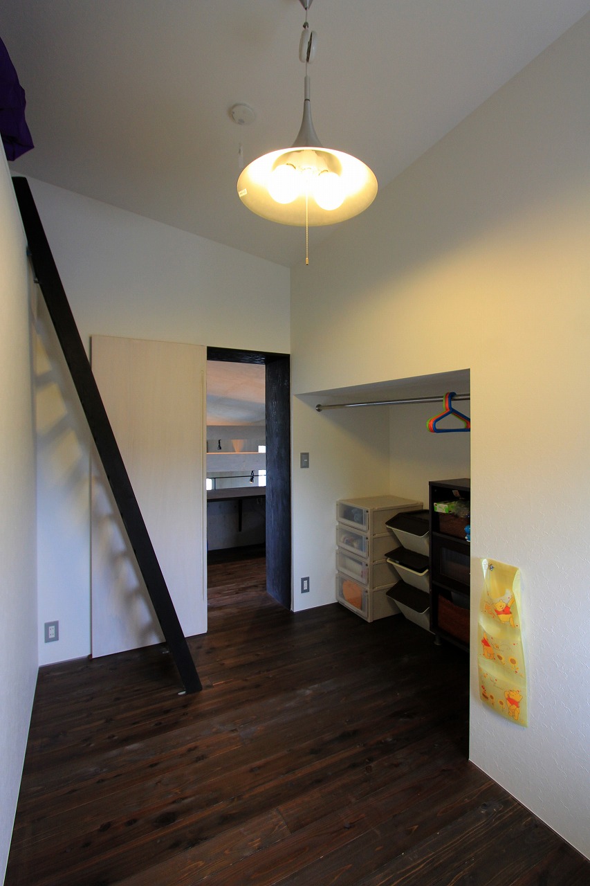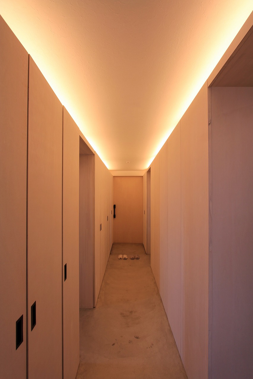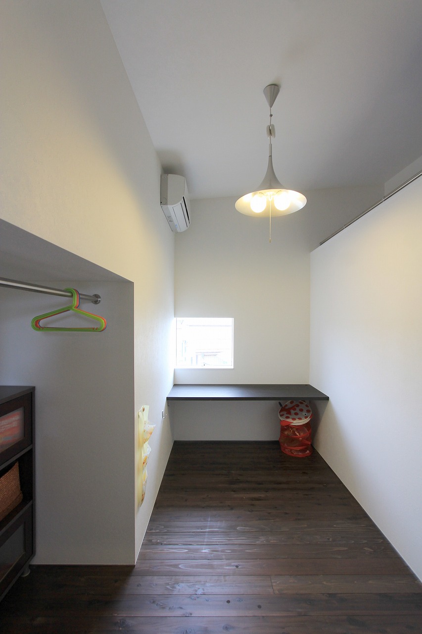 内部はもともとコンクリートの仕上げを希望だったこともあり、床をコンクリート、壁・天井をラーチ合板を塗装することでコンクリート造のような雰囲気を醸し出している。キッチンもコンクリートで製作し、照明計画と合わせてモノトーンで落ち着いた空間を創出できた。リビングは天井の高い吹き抜け空間となっており、リビングアクセスの鉄骨階段で2階へアクセス。2階はプライベートスペースとし、家族共有のスタディコーナーからは吹き抜けを介して家族の気配がつながるような計画としている。