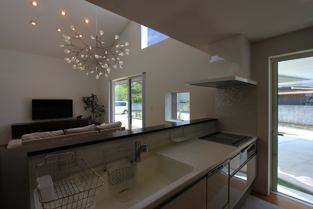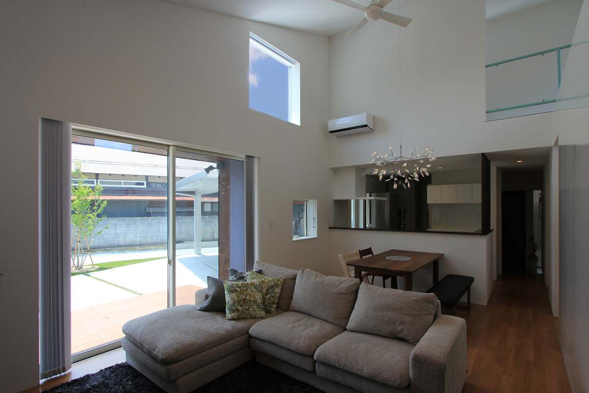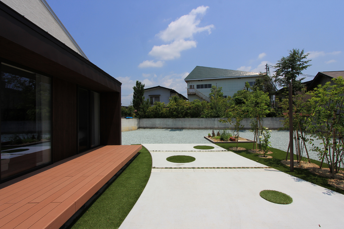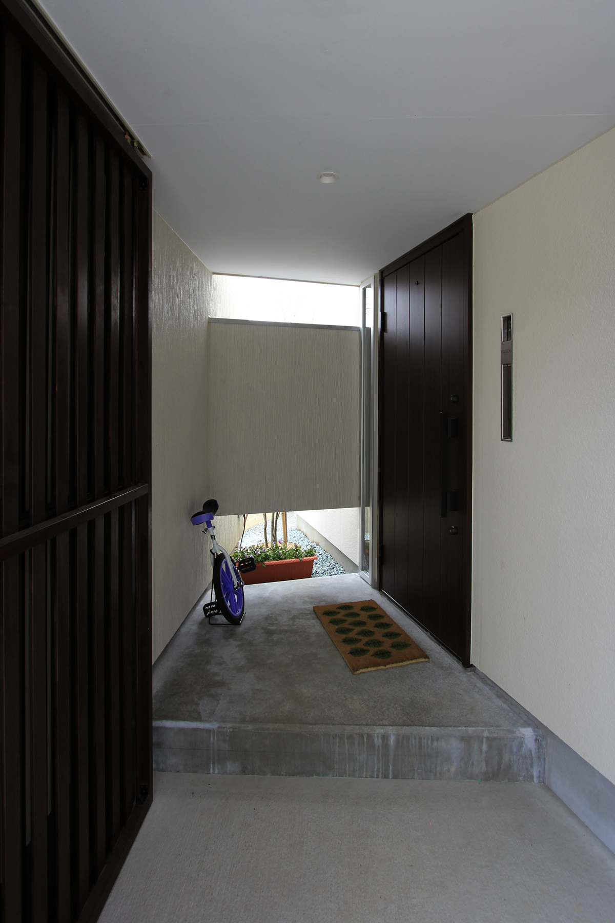 道路からプライベートスペースが見えないようにゲートを挿入し住宅建物と隅角でつなぐことでプライベートな外部空間を広くするとともに視線の角度にも工夫を施した。ほぼ平屋のワンルーム型。玄関付近に水廻りを集約することで家事動線に考慮した。