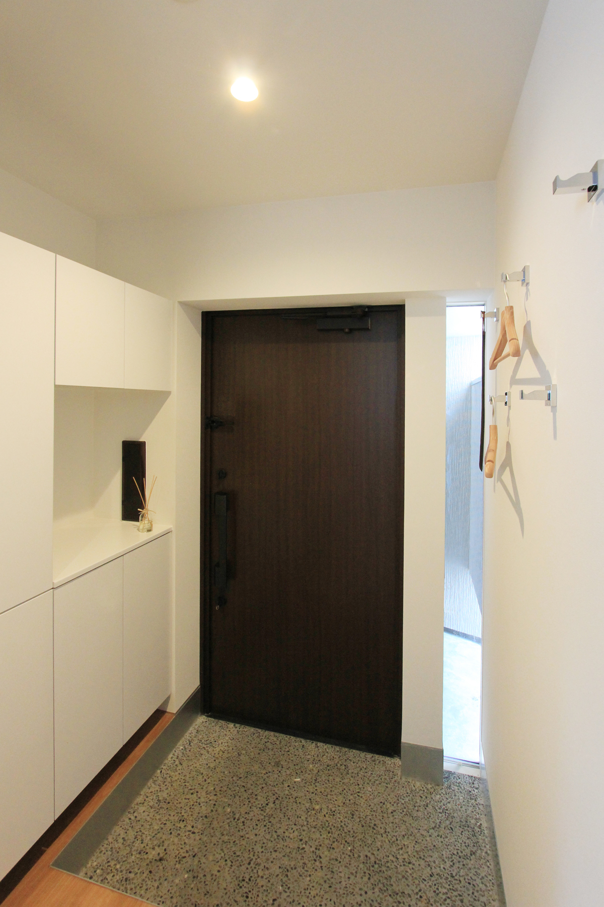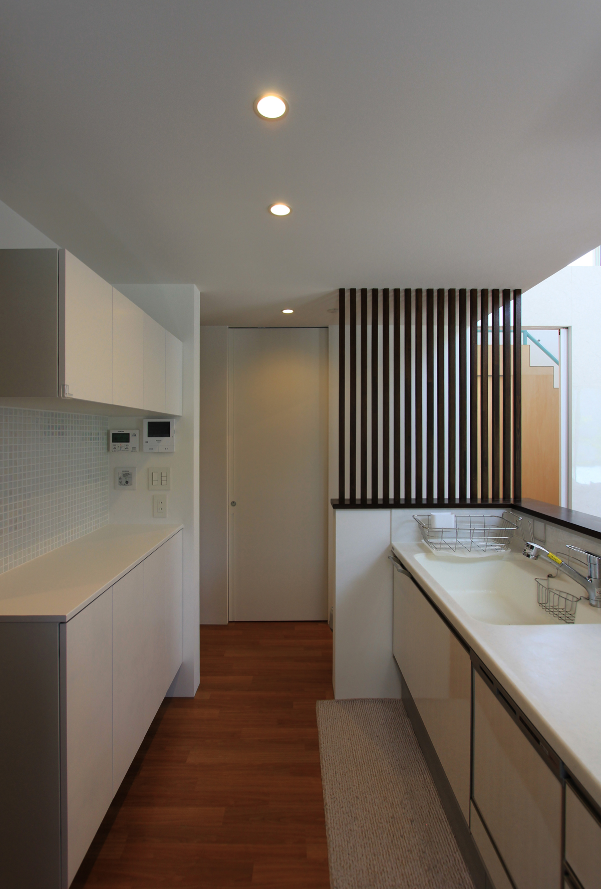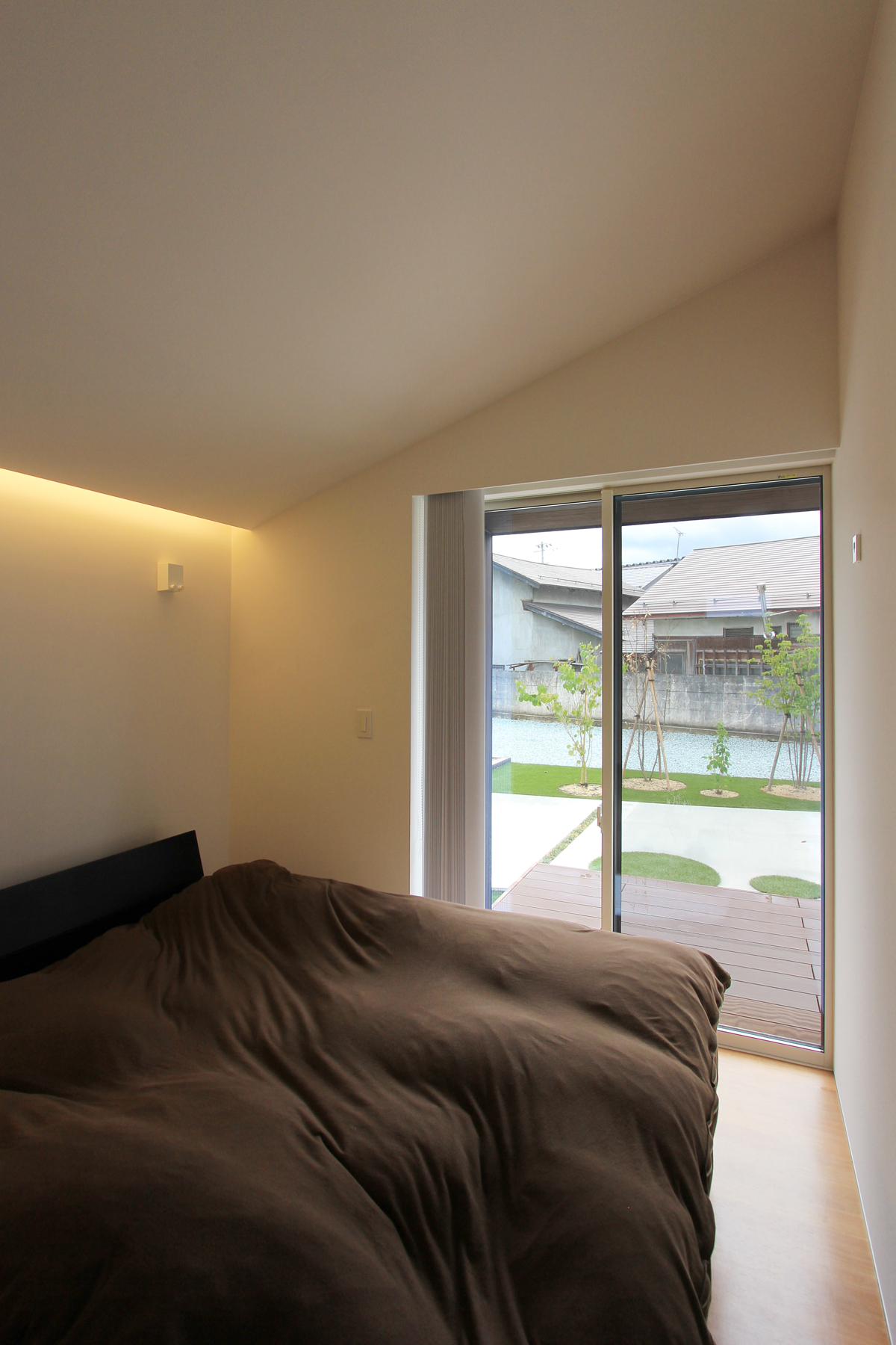 道路からプライベートスペースが見えないようにゲートを挿入し住宅建物と隅角でつなぐことでプライベートな外部空間を広くするとともに視線の角度にも工夫を施した。ほぼ平屋のワンルーム型。玄関付近に水廻りを集約することで家事動線に考慮した。