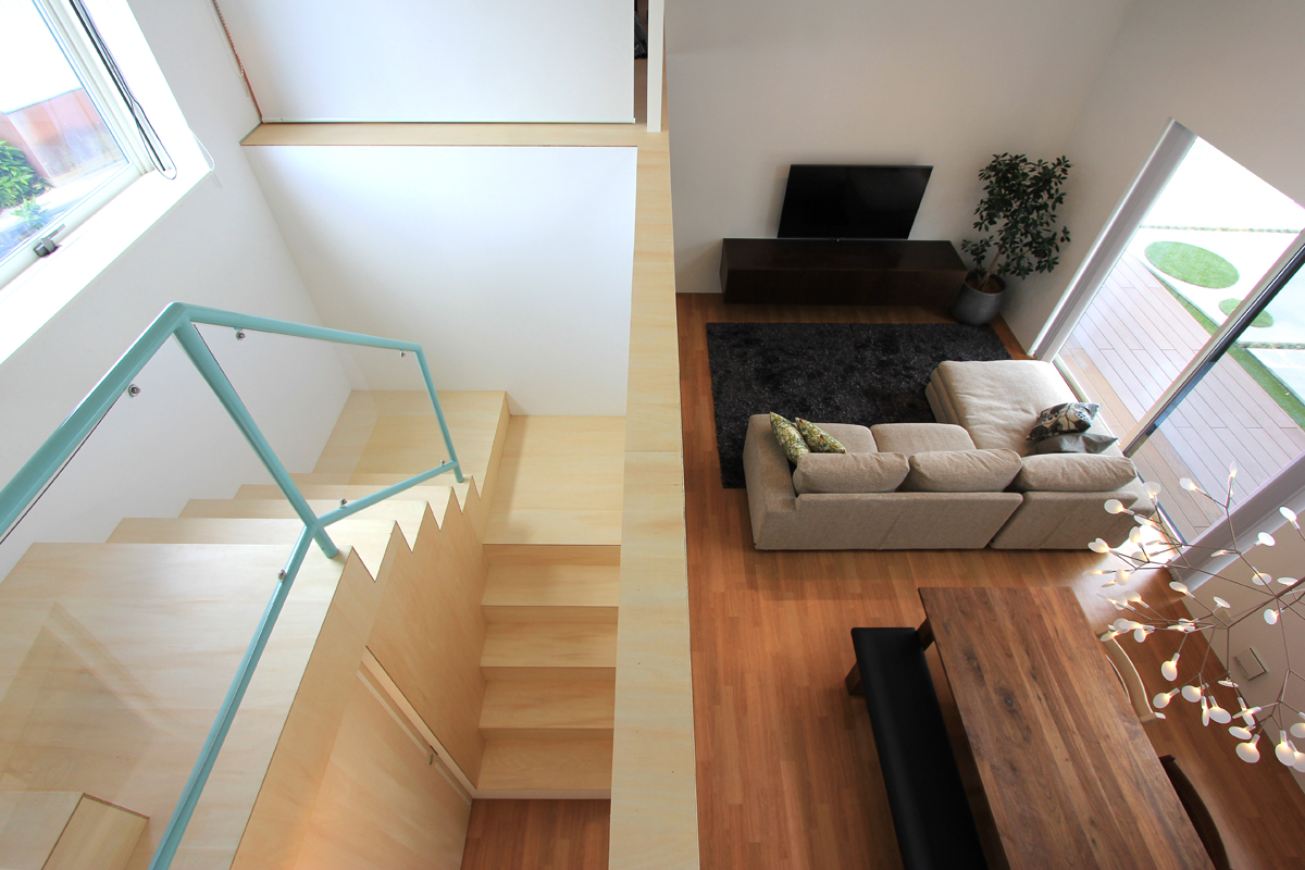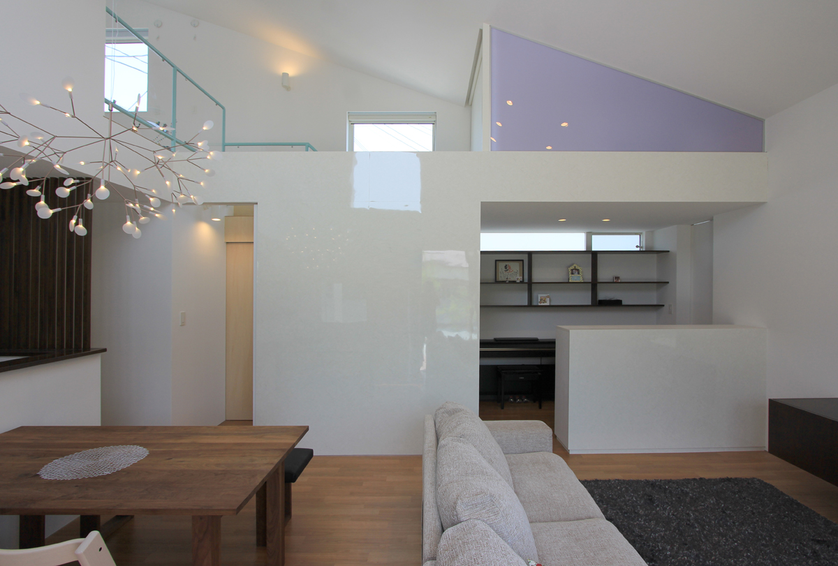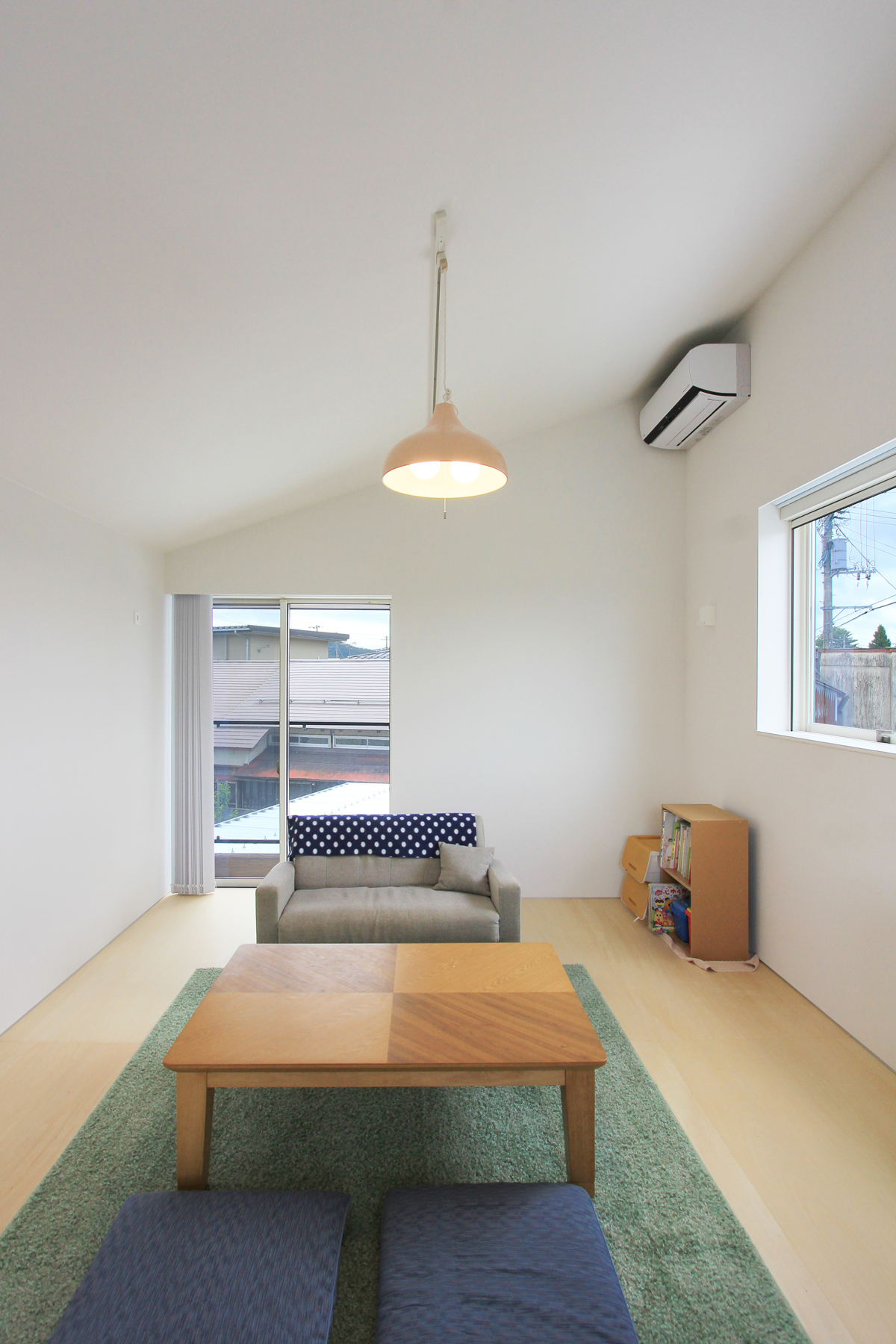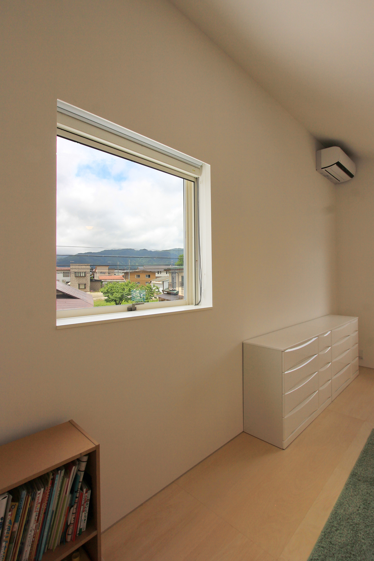 子供部屋だけを2階に設け、子どもの成長に合わせて可変な間仕切りにも対応できるようにフレキシブルなワンルームとした。唯一の2階からは朝日連峰が望めるように開口部にも気を使い検討された。