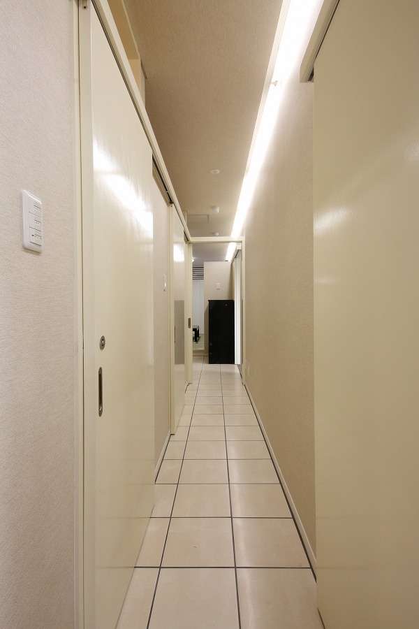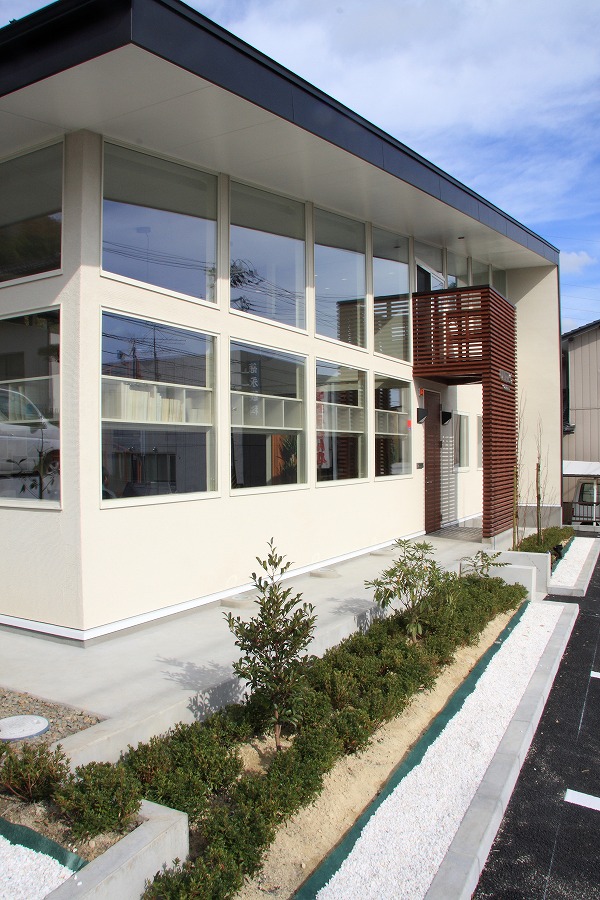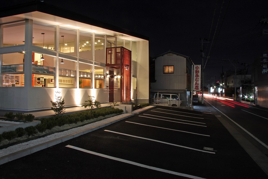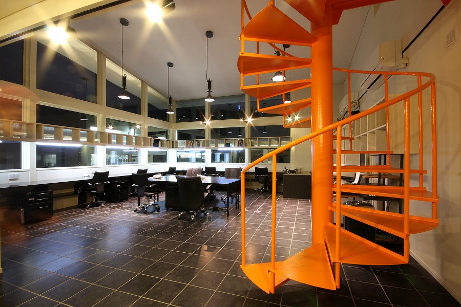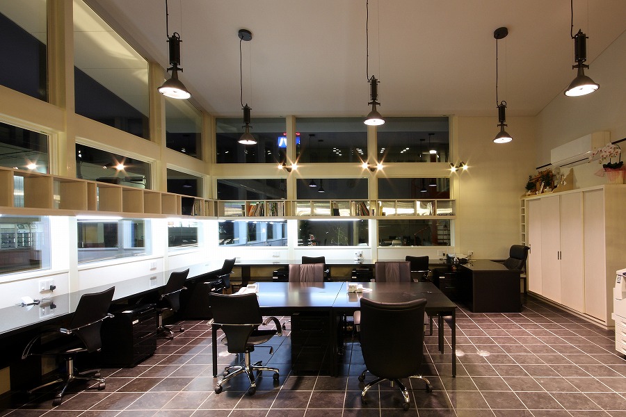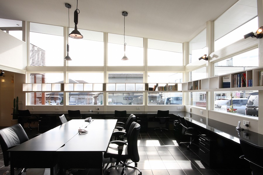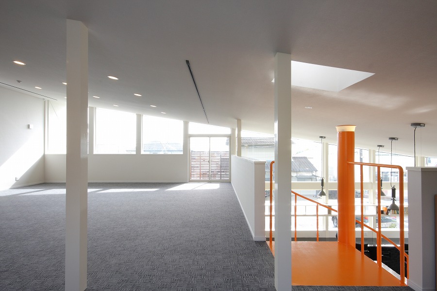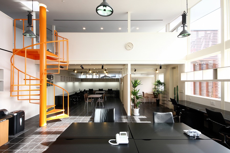 駐車スペースを最大限に確保する必要から建物を敷地中央東側に配置し、国道レベル・側道レベルに駐車スペースを配置し、北側をサービススペースとして活用しています。事務所スペースは北側に更衣室やトイレなどのサービススペースを集約し、国道に面する南側を吹き抜け空間を持つ開放的なワンルームの執務空間としています。2階部分は会議や娯楽スペースなど多目的に活用されています。