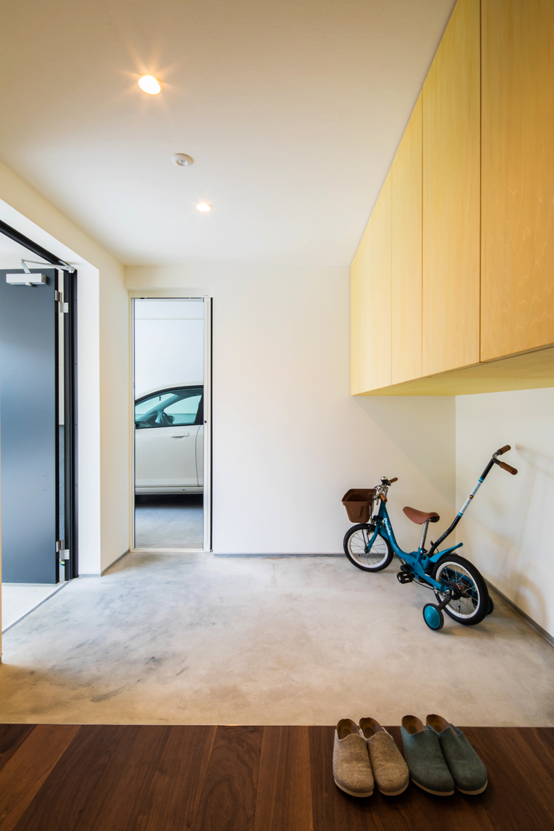 玄関からガレージへ直接行くことができる動線も配慮しています。玄関を通った先の収納スペースは、旦那さんご自慢の見せる収納となる予定です。リビングに面したガラスケースには靴のコレクションが。