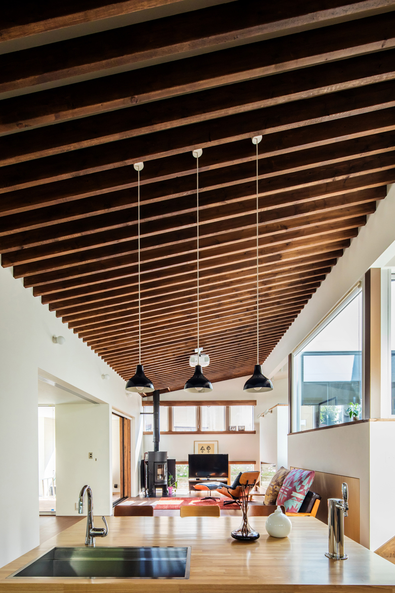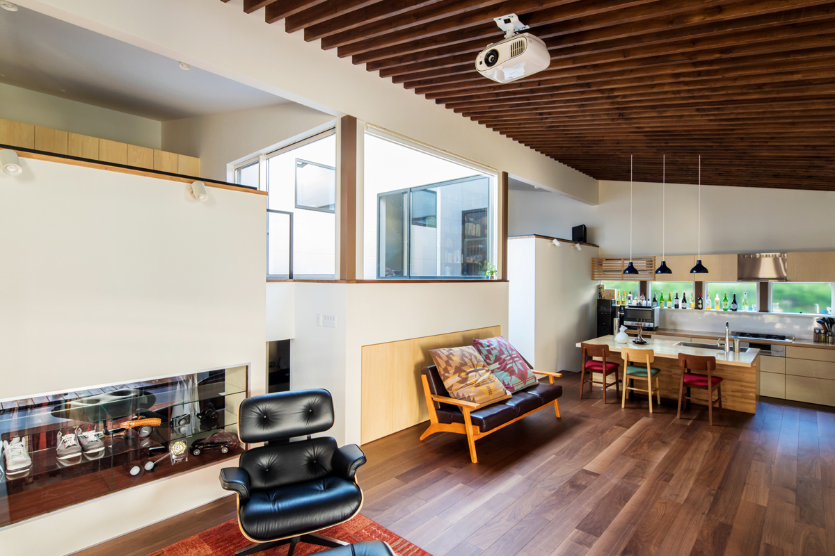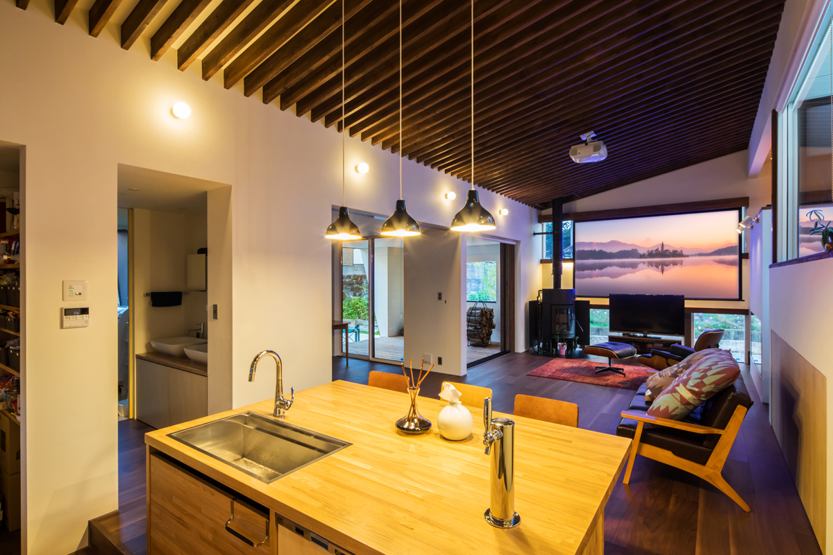 階段を上がるとテラスと直結した天井の高いLDKスペースへ出ます。セットで製作したキッチンとダイニングが向かい合う会話を誘発します。キッチンにはビールサーバーも完備。リビングスペースには給湯にも使用できる薪ストーブやホームシアター、ヨガ用ハンモックも。既存樹木や隣家の樹木も活用するように窓を配置しています。