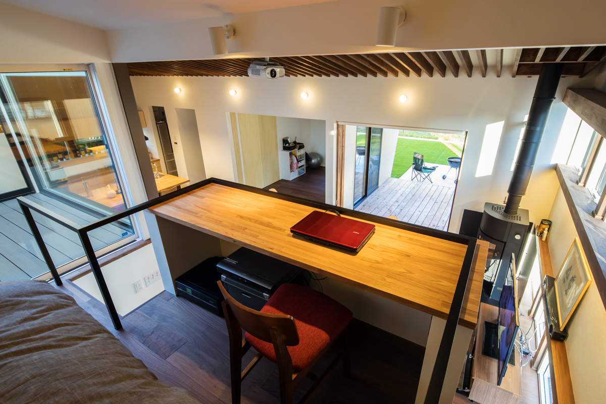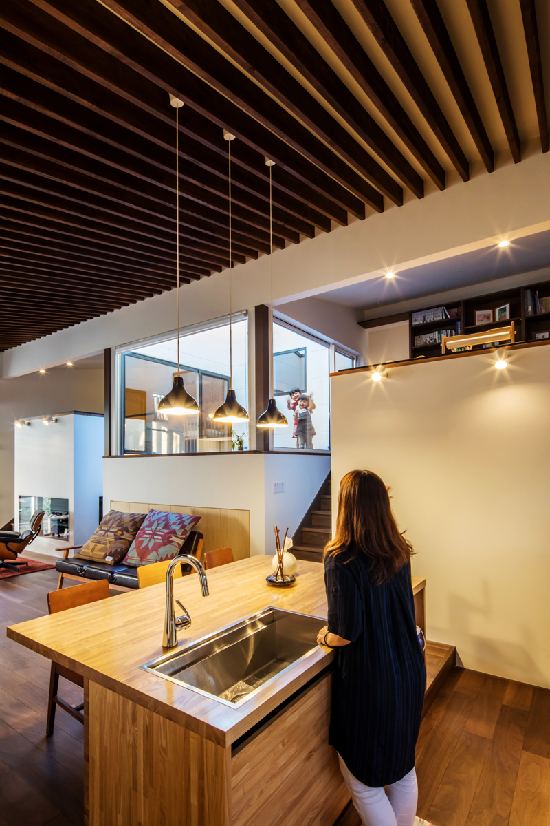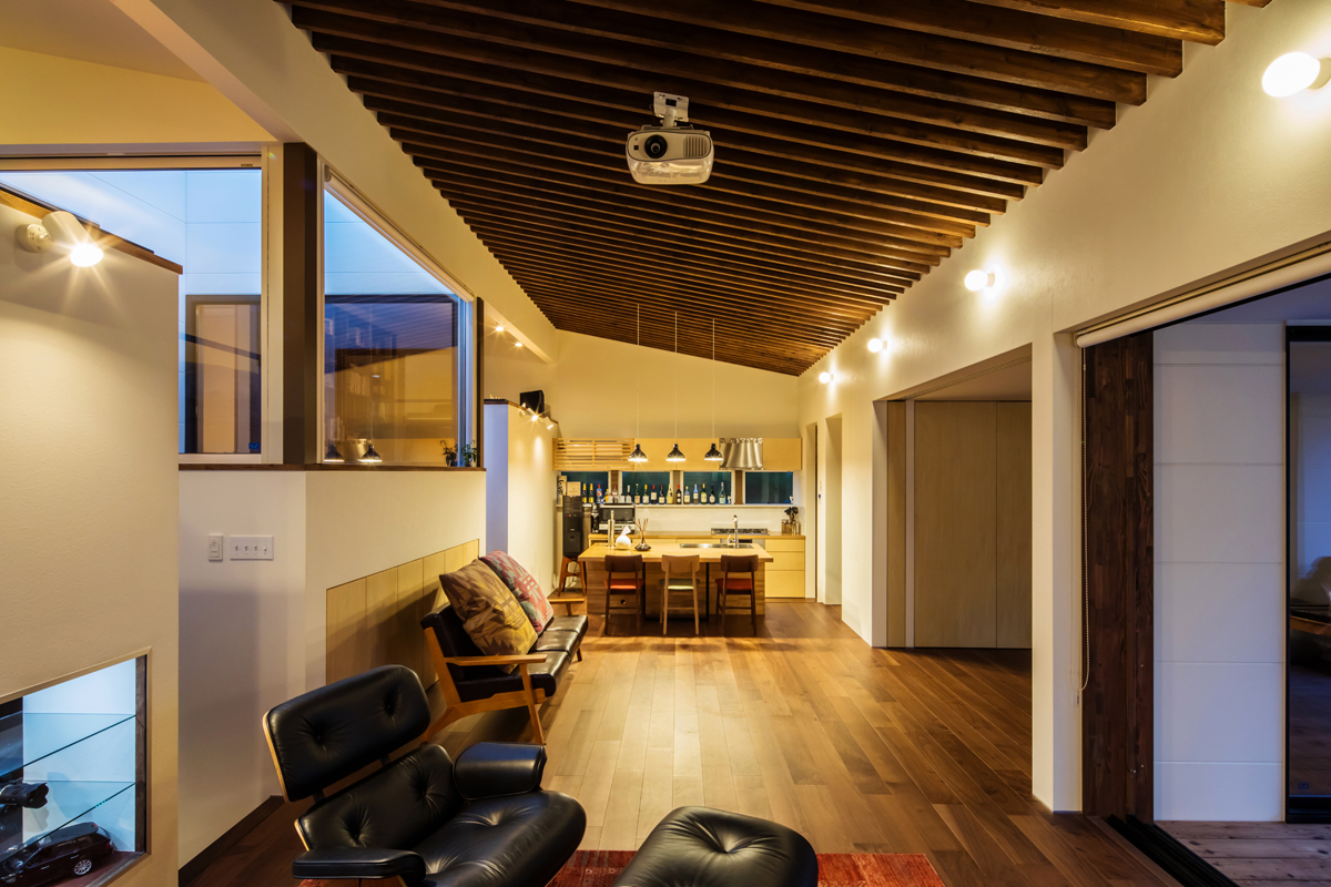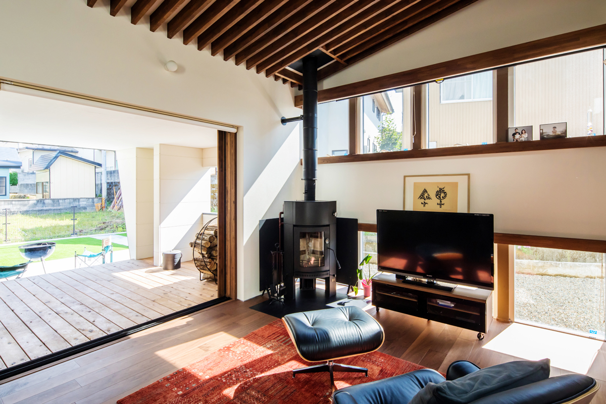 階段を上がるとテラスと直結した天井の高いLDKスペースへ出ます。セットで製作したキッチンとダイニングが向かい合う会話を誘発します。キッチンにはビールサーバーも完備。リビングスペースには給湯にも使用できる薪ストーブやホームシアター、ヨガ用ハンモックも。既存樹木や隣家の樹木も活用するように窓を配置しています。