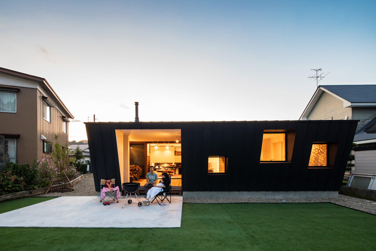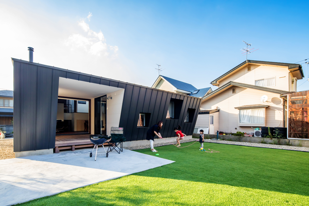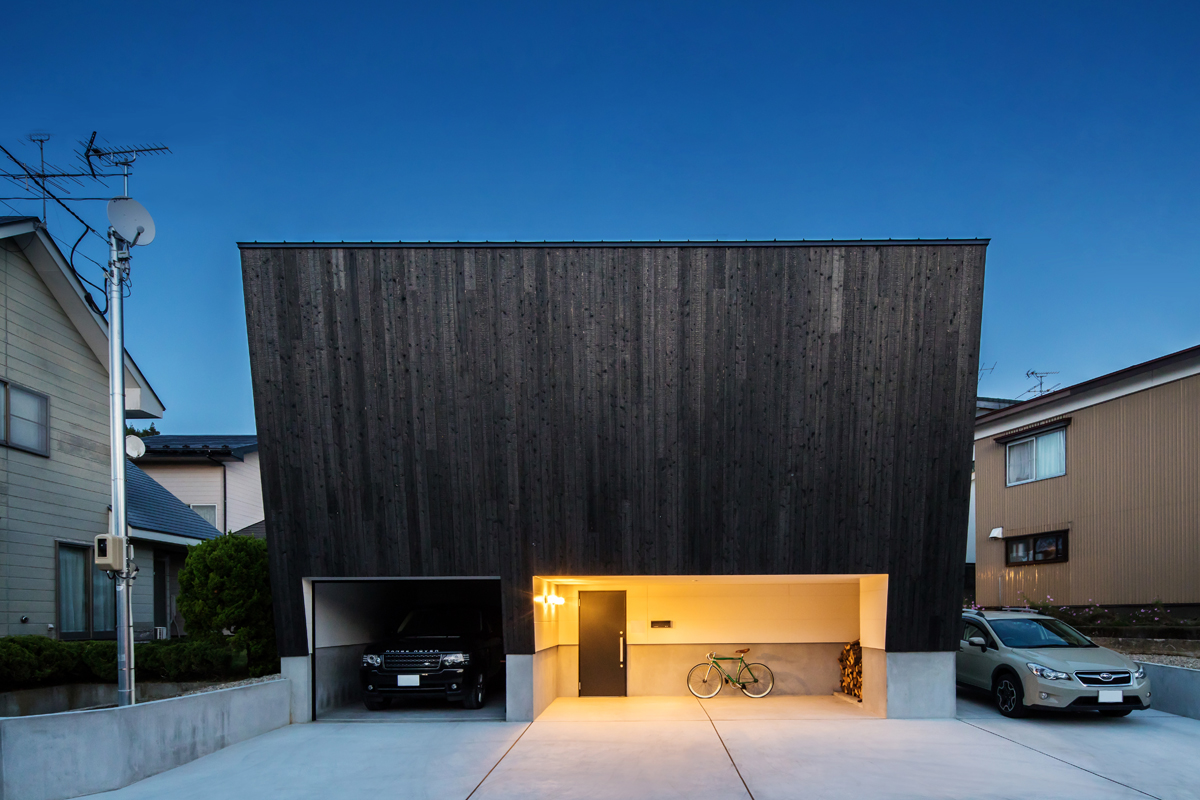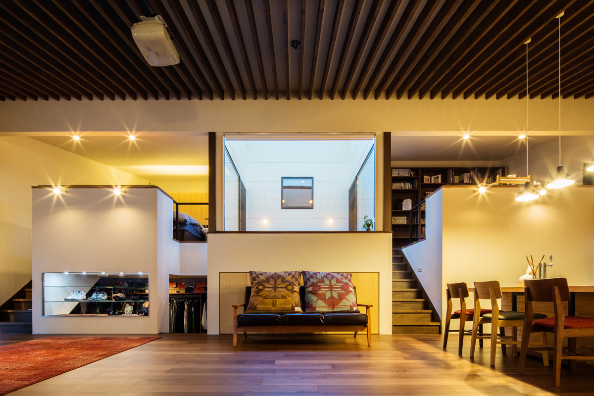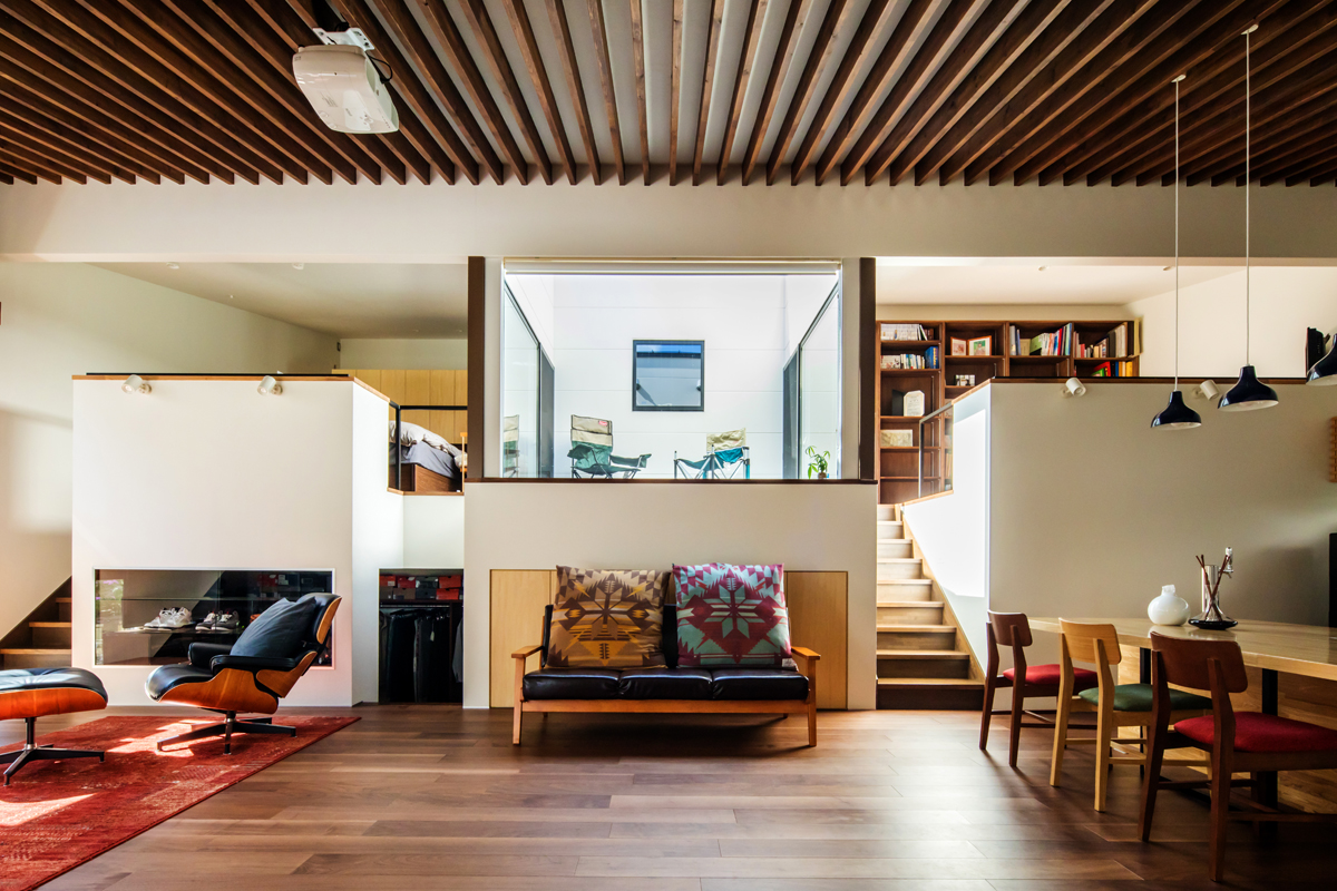 計画地は秋田市中心部に程近い住宅地にあります。敷地の高低差と南側隣地が高台になっていることがプランのコンセプトになりました。敷地の高低差をそのまま使用する計画として、インナーガレージと玄関は道路と同レベルに設定。スキップフロアで構成し、各部屋へのアクセスをスムーズにできるようにしています。南側の隣地との関係については採光確保のために中心に中庭を計画しました。スキップフロアの構成と相乗効果が期待できます。