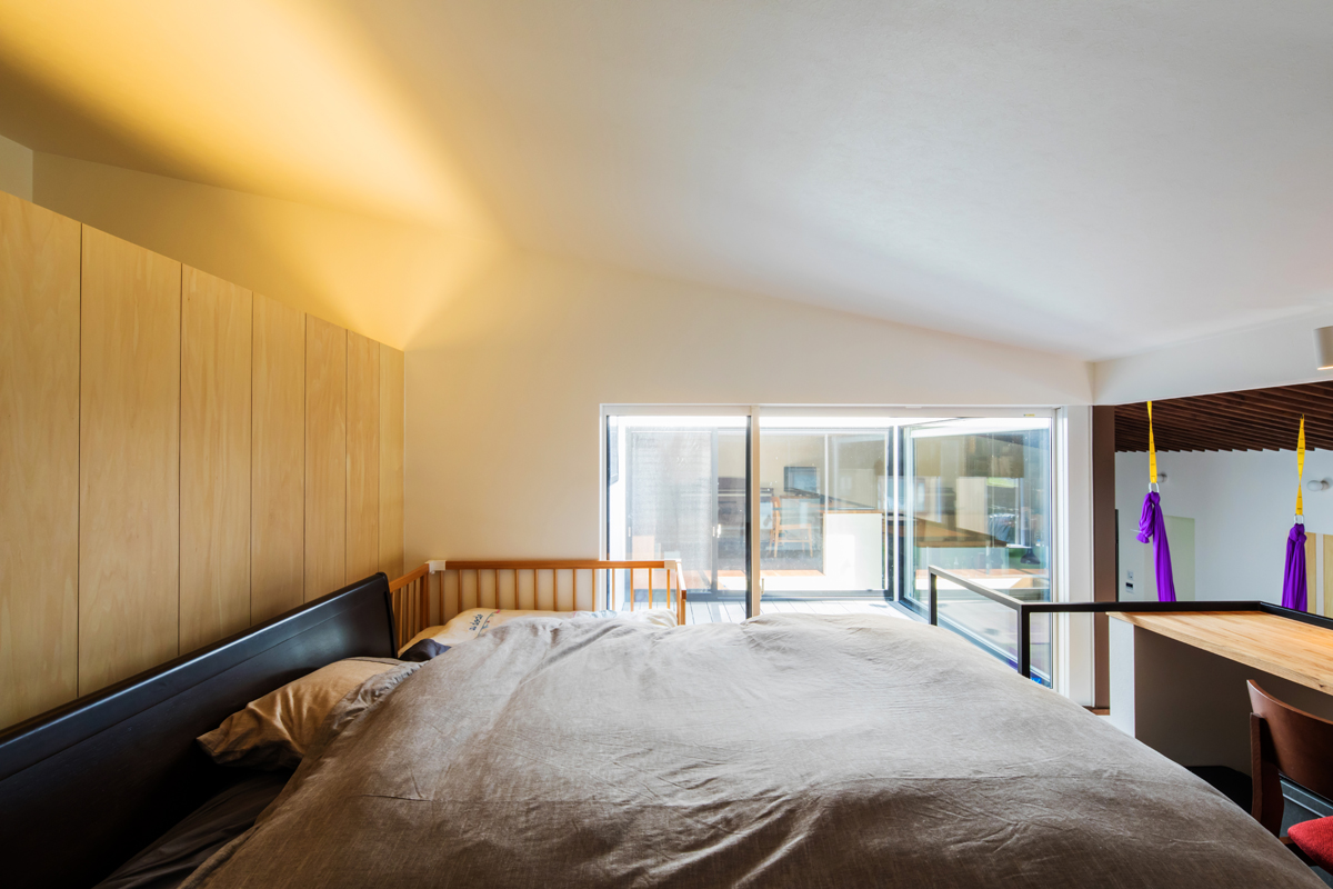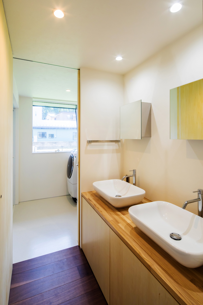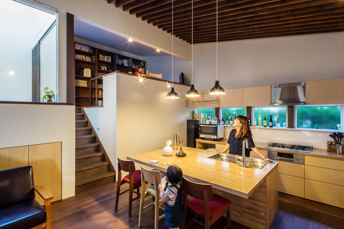 中庭の東側には寝室を計画。書斎として使用するカウンターはリビングに面しています。中庭の西側に配置したホールはお子さんのスペース。中庭からの採光が期待でき、中庭で遊んでいてもキッチンから目が届くことで安心して家事ができるように工夫しています。水廻りはキッチンからの動線を考慮してコンパクトにし、洗面と脱衣を分けることで使い勝手のよい洗面スペースとしています。脱衣には物干し空間も確保。浴室から庭への視線も検討しています。